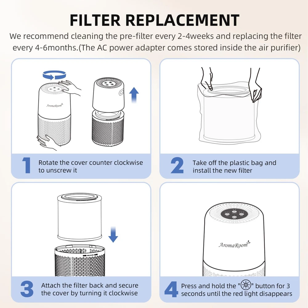 Product Specifications Dimensions: 5.71"D x 5.71"W x 10"H Weight: 2.31 lbs Power Supply: 120V Special Features Speed Mode Three wind speed modes: Sleep/Ⅱ/Ⅲ. Sleep Mode a.Air purifier run down to the lowest possible level. b.Noise Level: 22 dB. TIMER 3 timer modes: 2H/4H/8H. Filter Reset When button lights up red, prompting to change the filter. lt is recommended to replace the filter once every 3-6 months. Certified & 24-Month ETL/EPA/CARB/FCC certified. Trusted quality that stands the test of time. provides with a 30-day return, 2-year worry-free , and trustworthy at all times. What's in the Box 1 x AP103-A Air Purifier 1 x Pre-stalled Original Filter 1 x User Manual 1 x AC Power Adapter 1 x Pre-stalled Aroma Pad 3 x Aroma Pad Note: Please take off the plastic bag on the outside of the filter before turning on the machine. Effective Air Circulation Rate: With a CADR of 32.4 CFM / 55 m³/h, this home air purifier can refresh the air twice per hour in a room measuring 123 ft² (11.5 m²), ensuring effective purification throughout the space High-Efficiency Particulate Filtration: Features an H13 HEPA high-efficiency filtration system that captures at least 99.97% of dust, pollen, and other airborne particles measuring between 0.1 and 0.3 microns (µm) Sleep and Timer Modes: When sleep mode is activated, the air purifier operates at a noise level of 22 dB on low fan speeds. Three timer settings (2/4/8 Hours) are available to accommodate your various needs Multi-Sensory Experience: The AP103-A comes with a fragrance pad, allowing you to add your favorite essential oils (not included) for a refreshing combination of clean air and delightful aromas NOTICE: For optimal performance, we recommend replacing the AromaRoom genuine filter (B0DR1B6R15) every 3-6 months. Local team available 24/7 for you. Please remove the PE bag from the filter before use. Please do not place the product in places with high humidity, such as bathrooms or toilets.