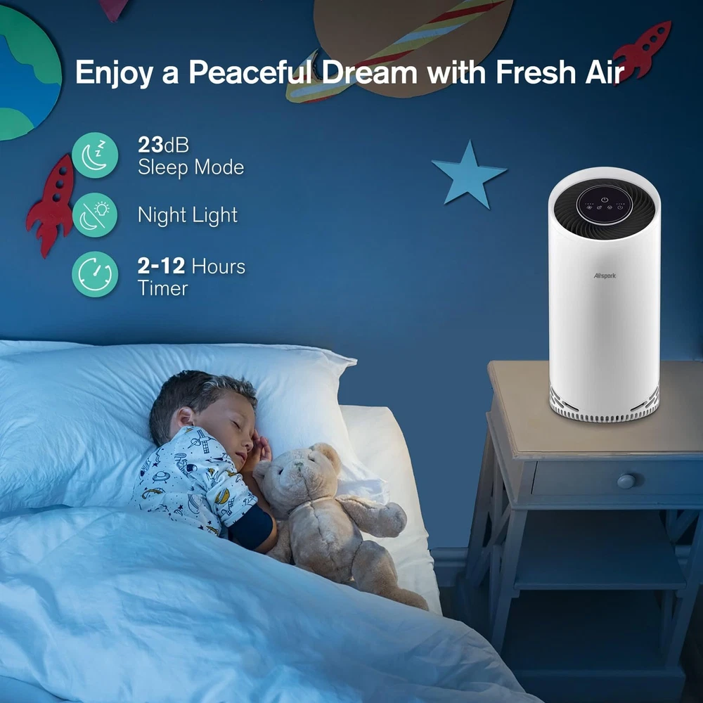 [POWERFUL & EFFECTIVE PURIFICATION] - Equipped with a powerful long-life motor, designed with 360-degree air intake circulation. CADR of 187 m³/h | 110 CFM. Refreshes an 825 Sq Ft space once per hour. Fresh air in minutes with air purifier for home large room and small room. Certified by ETL, FCC, and CA65. Quality assured with a 2-year free replacement warranty (filters are excluded) and lifetime technical support. [ADVANCED 4-STAGE FILTRATION] - (Ultra Fine Pre-Filter, Enhanced Pollen & Pet Filter, H13 True HEPA Filter, Active Carbon Filter). air purifiers utilize a 4-in-1 H13 True HEPA filter captures at least 99.97% of 0.3 micron particles such as smoke, pollen, pet hair, dander, and more. Absorb smoke, kitchen, cooking, and pets’ smell. Effectively improve air quality, help with sneezing, running nose, and uncomfortable symptoms caused by pets' hair, dander, pollen, or airborne particles. [23dB WHISPER QUIET & SLEEP MODE] - newest sleek and portable air purifier for bedroom, nursery room and dorm room. Operates at a near-silent noise level as low as 23dB, along with high airflow and purification. Sleep Mode to turn off all lights. Enjoy a peaceful sleep with clean air without being disturbed. [NIGHT LIGHT & 4 WIND SPEEDS & 2-12H TIMER] - Designed with Night Light, 1/2/3/4 adjustable wind speeds and 2/4/8/12H timer settings. Soft Night Light can be turned on for baby care as a baby air purifier or mind ease at night, or turned off to enjoy a sweat dream. 1/2/3/4 wind speeds let you easier to select a suitable wind speed according to the air quality. Run 2/4/8/12 hours before automatically powering off. Suitable air purifier for dorm room, bedroom, living room nurseries, kitchens, study room, office. [FILTER REPLACEMENT INDICATOR] - The red HEPA filter indicator light will turn on to remind you to change the filter. Or replace with air filter every 3-6 months (up to the air quality in your area) to ensure the good air quality. Search for B0CH7VVB1J to find replacement filter for AS200 / AS300.