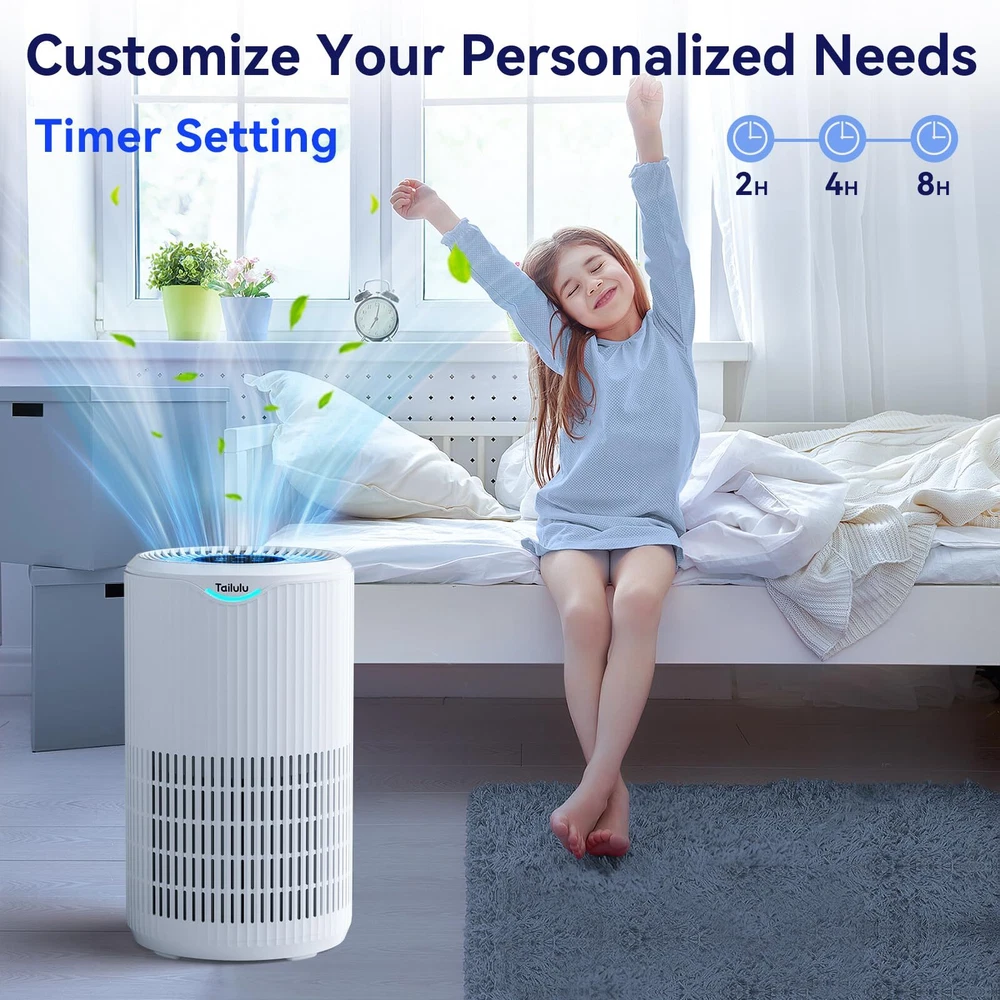 [POWERFUL AIR PURIFIER] D09 air purifier is equipped with a brushless motor and 360°air inlet design for efficient air cleaning and energy saving, changing air for a large room 375 ft² four times in 1 hour, saving more than 30% energy bills. The modern design suits any space from small to large rooms, bedrooms, offices, nurseries and kitchens. [HIGH-PERFORMANCE 3-STAGE FILTER] H13 True HEPA air purifiers adopt a 3-stage filtration system, including a pre-filter, H13 true HEPA filter, and charcoal filtration, which purify air particles as small as 0.3 microns such as smoke, pet hair, dander, dust, pollen, odors and cooking smell. It can also effectively help with sneezing, congestion, and other allergy symptoms caused by airborne contaminants. [WHISPER QUIET AIR CLEANER] The 2024 newest structure-designed air purifier for bedroom uses advanced noise reduction technology that reduces noise levels to a near-silent 20dB on sleep mode and you will not notice it is working while sleeping. Optional soft night light puts your mind at ease and makes you sleep deeper. [TIMER SETTING, 3 FAN MODES & FILTER REPLACEMENT REMINDER] 3 timer options (2H/4H/8H) allow you to customize the timer of the room purification time. Our HEPA filter air purifiers have 3 wind modes to meet your needs: high, low, and sleep mode. The smart filter indicator light will auto-on to remind you it’s time for a new filter. We recommend you replace the filter every 3-6 months depending on the environment and usage frequency. (Search B0BFX15HBS to find the D09 replacement filter.) [FULL CERTIFIED SAFETY & CHILD LOCK] Our home air purifier is FCC, ETL, EPA, and CARB certified (Available for California). 100% ozone-free, totally environment-friendly and safe for you and your whole family. Long press the child lock button for 3s to lock or unlock the touch panel to avoid error operation by kids or pets. [WORRY-FREE GUARANTEE] We provide our customers 1-year warranty and lifetime technical support, please rest assured. If you have any questions about air purifiers, please contact us directly, we offer online chat, email, and phone support. [WHAT'S INCLUDED] Air Purifier, Adaptor, Nanoseal HEPA Filter and Manual.