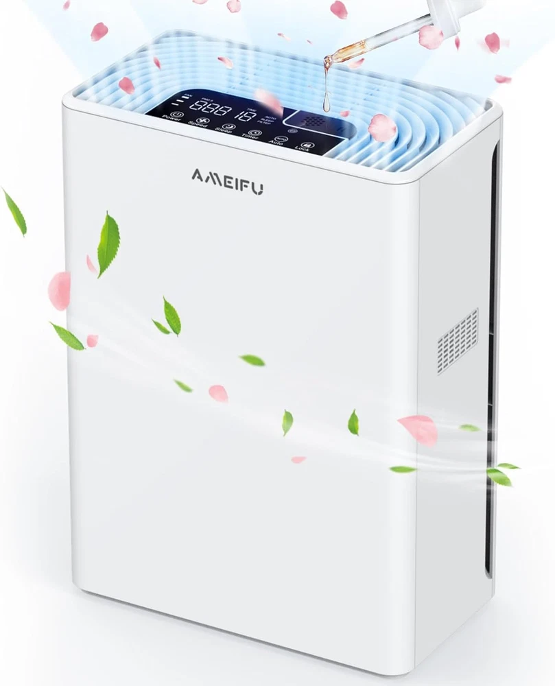 Air Purifiers for Home Large Room up to 2200sq.ft, 2024 Upgraded H13 White Product Details Product Dimensions : 13 x 7 x 7 inches; 8.26 Pounds Item model number : FXAP2USWFXAP2USW Color: White Brand: AMEIFU Product Dimensions: 13"D x 7"W x 7"H Floor Area: 1840 Square Feet Specification Met: CE Certified Power SourceItem Weight: AC8.26 Pounds Control MethodFilter Type: TouchHEPA 2024 New Upgrade - Faster Air Circulation: This H13 HEPA filter air purifiers cleans off 99.97% of airborne contaminants, reduces and absorbs those via true HEPA filter. AMEIFU air purifiers for home suitable for large rooms up to 1840 sq ft, perfect for quickly cleaning a wide range of contaminants including pet dander, smoke, and bad smells in a certain space Perfect Companion for Good Sleep - No Annoyed Noise: Air Purifiers for bedroom runs at very low noise level (≤15dB) on the lowest speed and the sleep mode, the quiet HEPA air purifier cleans the air without noise pollution. You can run it all night long without disturbing your sleep. Let you and your family enjoy the fresh air in sweet dreams Aromatherapy & Child Lock: Dropping your favorite essential oil (not included) on the aroma pad on top of the air purifiers for home to give a room a pleasant smell or cover up unwanted smells. Considerable child lock design helps avoid babies getting hurt and avoid any random setting changes caused by accident touch. (And the filter replacement remind button will blink when the filter expires to suggest you to replace Air Quality Display & 5 Timer Function: Hepa air purifiers for home features 3 fan speeds, or you can choose the auto mode and let it deal with anything nasty in the air automatically. In auto mode, the air purifier fitted with a PM2.5 sensor to display how dirty the air is and show it on the touch panel. Timer function is conveniently adjusted between 2, 4, 6, 8 or 12 hours and good for energy saving Safe and Trusted Official Certification: This air purifiers for large room is 100% no ozone with CE , FCC certification to ensure your safe use, which also complying with the California Air Resources Board (CARB), the air purifiers for home and pets is of good quality to ensure your health. We recommend replacing the filter every 3-6 months to ensure optimum performance