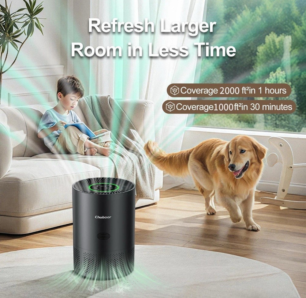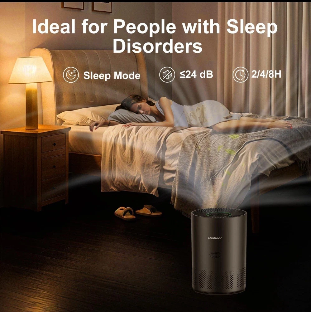 Color Black Brand Chuboor Product Dimensions 8.18"D x 8.18"W x 11.38"H Power Source AC/DC Item Weight 5.2 Pounds Control Method Touch Gives you fresh air in 1 hour: can you imagine it can monitor as fast as a shooting star? And it also gives different air quality tips in time. We use the most practical traffic light three-color method, red light-poor quality, yellow light-fair, green light-very good quality; isn't it very good to understand and identify? When you see the red light, you should leave quickly, and you can breathe the freshest air again in an hour. 360° Air Inlet: With H13 True HEPA technology, it effectively targets airborne particles of 0.1-0.3 microns, similar to all kinds of airborne particles, allergens, cat hair, etc. Enjoy quality air purification.360° air inlet ensures full coverage of your room. Suitable for all kinds of living environments, bedrooms, kitchens, mother's and baby's rooms, removes shoe odor, removes diaper odor, removes smoke odor from smoking rooms up to 2000 square feet. Leaves you with very clean and safe air. INTELLIGENT AUTOMATIC MODE DESIGN: Experience the benefits of quiet operation at only 20 decibels, providing you with a peaceful environment for rest and relaxation. Unique Smart Mode Design automatically switches sleep modes according to the environment, bringing you a quiet, intelligent sleep; a very competent babysitter. It's a design that frees your hands; Breathing Light Design:The Chuboor PB01 air purifier is not only efficient, but also environmentally friendly. Each unit comes with a complimentary True Hepa 13 filter and the filters are protected with wrap to ensure it's clean. The casing has a frosted design to prevent slippage. The breathing light design allows you to watch your child sleep at night without turning on the light. Multi-mode, multi wind speed settings: Customizable experience with 4 speed fan settings and real-time air quality monitoring for peace of mind. Stay informed and in control of your indoor air environment.Manual mode and automatic mode are free to switch, set manual mode during the day to save electricity. Set auto mode at night, the air purifier takes care of your sleep all night. AMERICAN DESIGN STYLE: The PB01 air purifier features the trendiest home American design, which matches your home decorating style very well. Small size and light weight, you can move it anywhere, from the living room to the bedroom, from the bedroom to the kitchen, from the kitchen to the baby room, from the baby room to the pet room, even you can take him to your college dormitory, to your office, as long as there is air that needs to be purified, it's a good helper.