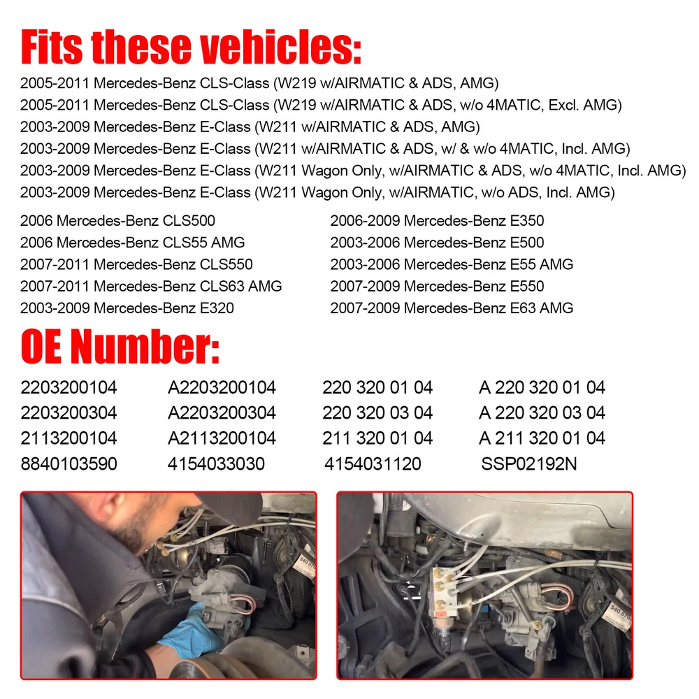 Product Type : Shocks, Struts & Assemblies Color : Silver & Black Fitment : 2005-2011 Mercedes-Benz CLS-Class (W219 w/AIRMATIC & ADS, AMG) 2005-2011 Mercedes-Benz CLS-Class (W219 w/AIRMATIC & ADS, w/o 4MATIC, Excl. AMG) 2003-2009 Mercedes-Benz E-Class (W211 w/AIRMATIC & ADS, AMG) 2003-2009 Mercedes-Benz E-Class (W211 w/AIRMATIC & ADS, w/ & w/o 4MATIC, Incl. AMG) 2003-2009 Mercedes-Benz E-Class (W211 Wagon Only, w/AIRMATIC & ADS, w/o 4MATIC, Incl. AMG) 2003-2009 Mercedes-Benz E-Class (W211 Wagon Only, w/AIRMATIC, w/o ADS, Incl. AMG) 2006 Mercedes-Benz CLS500 2006 Mercedes-Benz CLS55 AMG 2007-2011 Mercedes-Benz CLS550 2007-2011 Mercedes-Benz CLS63 AMG 2003-2009 Mercedes-Benz E320 2006-2009 Mercedes-Benz E350 2003-2006 Mercedes-Benz E500 2003-2006 Mercedes-Benz E55 AMG 2007-2009 Mercedes-Benz E550 2007-2009 Mercedes-Benz E63 AMG Part Number : Air Suspension Valve Block 2113200158 A2113200158 211 320 01 58 A 211 320 01 58 Air Ride Suspension Compressor Pump 2203200104, A2203200104, 220 320 01 04, A 220 320 01 04 2203200304, A2203200304, 220 320 03 04, A 220 320 03 04 2113200104, A2113200104, 211 320 01 04, A 211 320 01 04 2113200304, A2113200304, 211 320 03 04, A 211 320 03 04 2193200004, A2193200004, 219 320 00 04, A 219 320 00 04 0025427219, A0025427219, 002 542 72 19, A 002 542 72 19 0025427619, A0025427619, 002 542 76 19, A 002 542 76 19 8840103590 4154033030 4154031120 SSP02192N 02.30.149 0230149 Package Content : 1 x Air Suspension Compressor Valve Control Block All of our products can be returned within 30 days, Please open a request for any of these reasons: The reason you pick has no impact on your refund amount, but it has a big impact on us as a seller, Choosing other reasons may delay the refund per an internal investigation and potential eBay appeal. You are entitled to send back the product within a 30-day period after receiving it. The returned item should be in its original condition, with all the accessories, literature, and factory carton that came with it. Product Type : Shocks, Struts & Assemblies Color : Silver & Black Fitment : 2005-2011 Mercedes-Benz CLS-Class (W219 w/AIRMATIC & ADS, AMG) 2005-2011 Mercedes-Benz CLS-Class (W219 w/AIRMATIC & ADS, w/o 4MATIC, Excl. AMG) 2003-2009 Mercedes-Benz E-Class (W211 w/AIRMATIC & ADS, AMG) 2003-2009 Mercedes-Benz E-Class (W211 w/AIRMATIC & ADS, w/ & w/o 4MATIC, Incl. AMG) 2003-2009 Mercedes-Benz E-Class (W211 Wagon Only, w/AIRMATIC & ADS, w/o 4MATIC, Incl. AMG) 2003-2009 Mercedes-Benz E-Class (W211 Wagon Only, w/AIRMATIC, w/o ADS, Incl. AMG) 2006 Mercedes-Benz CLS500 2006 Mercedes-Benz CLS55 AMG 2007-2011 Mercedes-Benz CLS550 2007-2011 Mercedes-Benz CLS63 AMG 2003-2009 Mercedes-Benz E320 2006-2009 Mercedes-Benz E350 2003-2006 Mercedes-Benz E500 2003-2006 Mercedes-Benz E55 AMG 2007-2009 Mercedes-Benz E550 2007-2009 Mercedes-Benz E63 AMG Part Number : Air Suspension Valve Block 2113200158 A2113200158 211 320 01 58 A 211 320 01 58 Air Ride Suspension Compressor Pump 2203200104, A2203200104, 220 320 01 04, A 220 320 01 04 2203200304, A2203200304, 220 320 03 04, A 220 320 03 04 2113200104, A2113200104, 211 320 01 04, A 211 320 01 04 2113200304, A2113200304, 211 320 03 04, A 211 320 03 04 2193200004, A2193200004, 219 320 00 04, A 219 320 00 04 0025427219, A0025427219, 002 542 72 19, A 002 542 72 19 0025427619, A0025427619, 002 542 76 19, A 002 542 76 19 8840103590 4154033030 4154031120 SSP02192N 02.30.149 0230149 Package Content : 1 x Air Suspension Compressor Valve Control Block All of our products can be returned within 30 days, Please open a request for any of these reasons: The reason you pick has no impact on your refund amount, but it has a big impact on us as a seller, Choosing other reasons may delay the refund per an internal investigation and potential eBay appeal. You are entitled to send back the product within a 30-day period after receiving it. The returned item should be in its original condition, with all the accessories, literature, and factory carton that came with it. On Oct 17, 2024 at 05:34:20 PDT, seller added the following information: