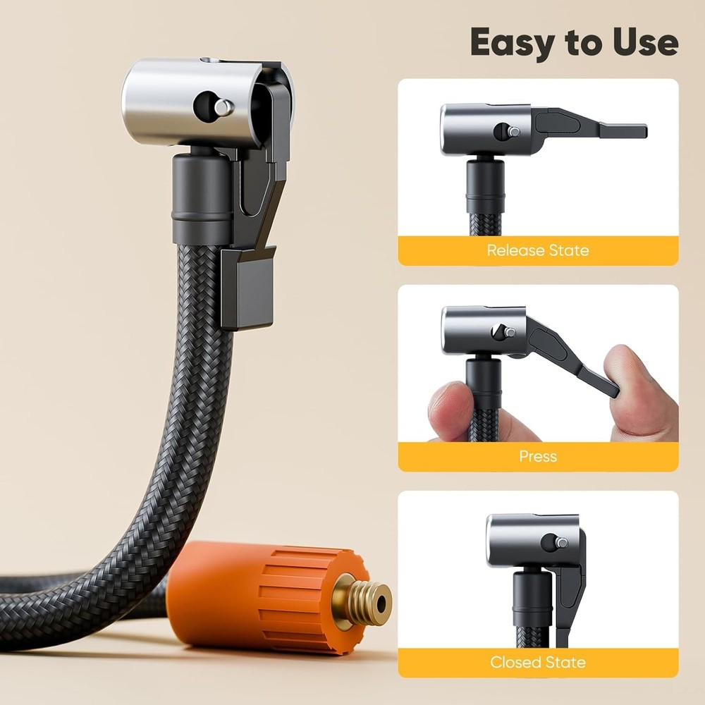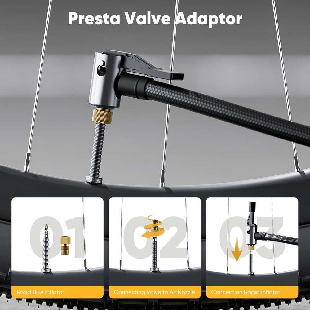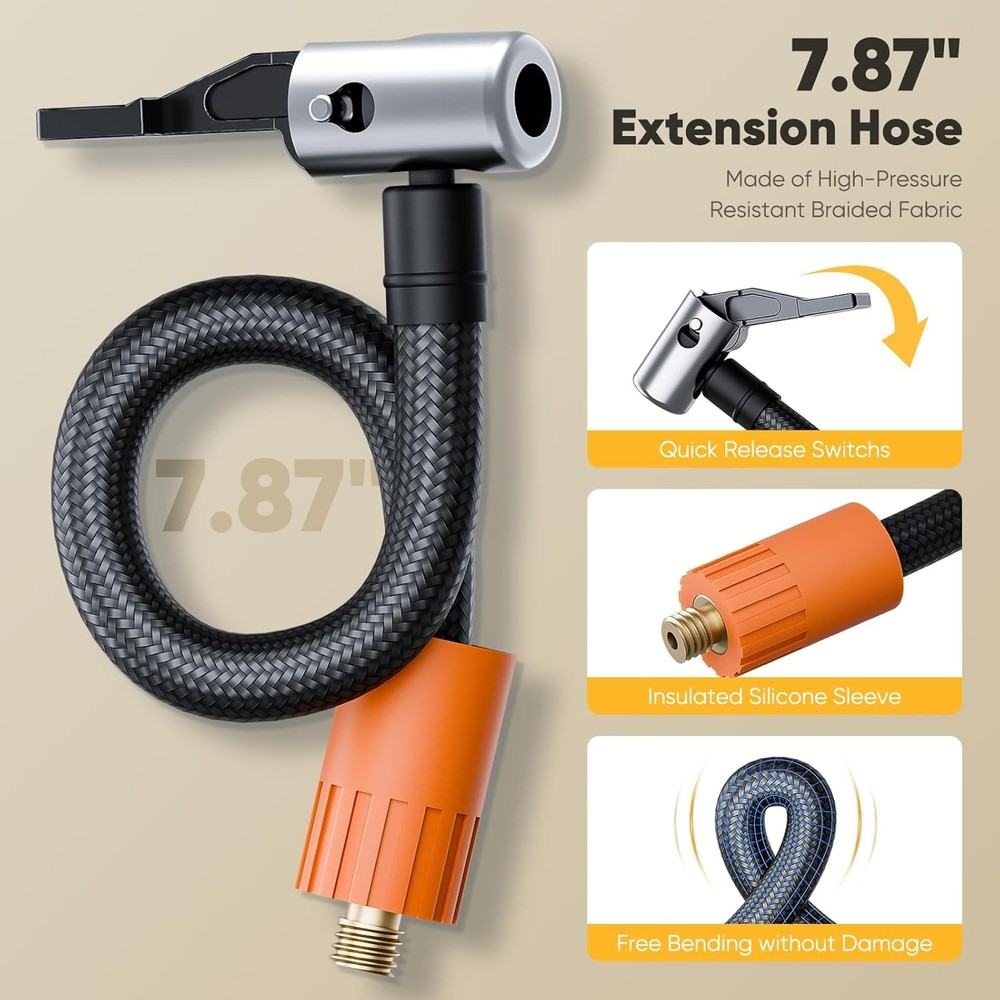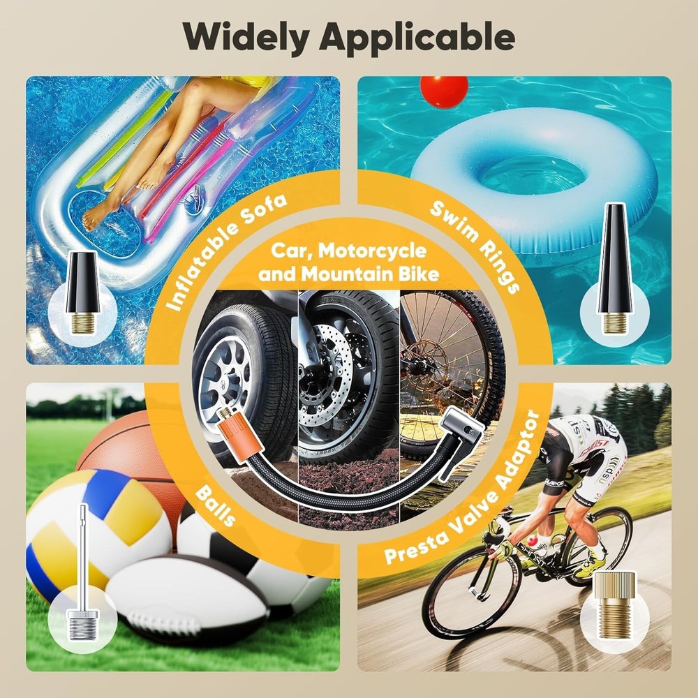 【Universal Compatibility】Effortlessly inflate any item with our multi-adaptor kit, featuring a Presta valve converter (Schrader to French valve), ball needle for sports equipment, and dual tapered nozzles for airbeds/pool toys. Perfect for bicycles, motorcycles, basketballs, and inflatable furniture. 【Quick-Release Efficiency】7.87in/200mm heavy-duty hose with instant air release trigger enables fast inflation/deflation. The ergonomic brass nozzle head ensures secure valve connections without air leakage during pumping. 【Compact Travel Ready】Ultra-lightweight 2oz kit packs flat for storage. Keep the 7.87in/200mm hose and 4 adaptors in your bike bag, car trunk, or garage - ready for emergency tire inflation or weekend adventures. 【Durable Construction】Premium rubber hose resists kinking and cracking (-20℃ to 60℃ tolerant). Chrome-plated brass fittings prevent corrosion while maintaining airtight seals at 150 PSI max pressure. 【Dual-Use Nozzles – Fast & Easy】Switch nozzles in seconds! Use the wide nozzle for fast inflation of pool floats/beds, and the narrow tip for precise control when pumping balls or bikes. The 20mm extended nozzle even reaches 'hidden' valves on road bikes – so easy, everyone in the family can use it like a pro.