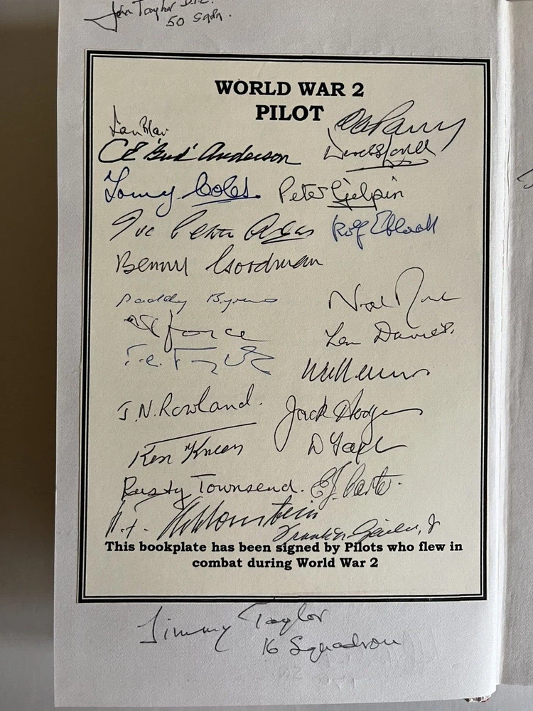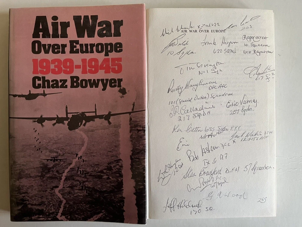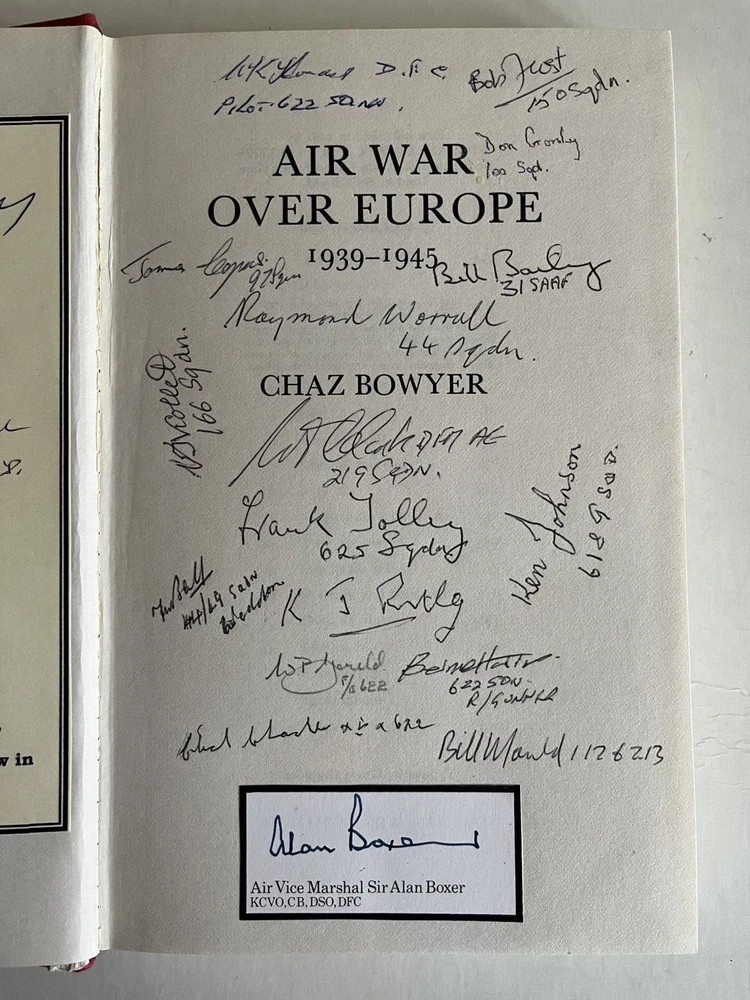 After over 40 years of collecting WW2 autographed photographs, prints and books, and having reached retirement age, we are now parting with our private collection - watch out for listings! "Air War Over Europe 10390-1945" by Chaz Bowyer, hard back book with dust cover published 1981, both book and cover in good condition. "This authoritative book traces the history of the European air war throughout these years, outlining the reasons which lay behind each turn in it's course. A most readable and full account of one of the most critical aspects of the entire war." This copy has been signed over 3 pages by the following 60 WW2 RAF, USAAF and Luftwaffe veterans First page - signed in the book Flt Sgt Stan Bradford DFM - 57 Sqd W/O Tom Calladine - 217 Sqd Flt Lt Roger Calvert - 141 Sqd W/O Ken Calton - 635 Sqd W/O Tom Carter - 263 Sqd W/O Chick Chandler - 15/622 Sqd W/O Colin Cole - 617 Sqd Wg Cmdr Tim Elkington - 1 Sqd W/O Jeff Hildreth - 170 Sqd Flt Lt Frank Hogan - 622 Sqd Flt Lt Bob Hughes DFC AE - 149/50/23/12 Sqd Flt Lt Bob Lasham DFC* - 9/97 Sqd Flt Lt Arthur Poore DFC - 617 Sqd Flt Sgt Eric Varney - 207 Sqd Flt Sgt Jack Watson DFM - 12/156 Sqd Flt Lt Rusty Waughman DFC - 101 Sqd F/O Ralph Wild - 10 Sqd Flt Lt George A Wood - 263 Sqd Flt Lt Eric Batchelor - 17 Sqd ? Second page - matted bookplate - WW2 Pilot Colonel Bud Anderson - USAAF 357th Fighter Group Flt Lt Joe Petrie-Andrews DFC DFM - 35 Sqd Sqd Ldr Ian Blair DFM - 113/501/602 Sqd P/O Paddy Byrne - 197 Sqd W/O Eric Carter - 615/81/456 Sqd Flt Lt Tommy Coles DFC - 158 Sqd Flt Lt Len Davies - 151 Sqd Oberleutnant Rolf Ebhardt - Luftwaffe NJG101/NJG1 General Frank Gailer Jr - USAAF 357th Fighter Group Gp Cpt Peter Gilpin CBE DFC - 253 Sqd Sqd Ldr Benny Goodman - 617 Sqd Flt Lt Jack Hodges DFC - 174 Sqd Sqd Ldr Frank "Dimmy" Joyce MBE - 87 Sqd P/O Ken Kneen - 175 Sqd Flt Lt Derek Lovell - 197 Sqd Sqd Ldr Owen Parry DFC AE - 11 Sqd Sqd Ldr Nigel Rose - 602 Sqd Sqd Ldr John Rowland DFC* DSO - 12/625 Sqd Hauptmann Karl-Fritz Schlossstein - Luftwaffe JG5/ZG76/JG54 F/O Derek Tapson - 197 Sqd Flt Lt Jimmy Taylor - 16 Sqd (signed in book) Flt Lt John Taylor DFC - 50 Sqd (signed in book) Flt Lt Tommy Taylor DFC* - 9/467 Sqd P/O Rusty Townsend - 175 Sqd Oberleutnant Wolfgang Wollenweber - Luftwaffe JG5/JG2/JG12/JG400 Third page - signed in the book Bill Bailey - 31 Sqd Flt Lt Freddie Ball DFC - 44/49 Sqd AVM Sir Alan Boxer KCVO CB DSO DFC - 138/161 Sqd (matted signature) Chick Chandler - 15/622 Sqd Flt Lt Terry Clark DFM - 219 Sqd James Copus - 97 Sqd Don Crossley - 100 Sqd Bob Frost - 150 Sqd W/O W P "Bill" Gould - 622 Sqd Bernard Harris - 622 Sqd W/O Ken Johnson - 61/9 Sqd W "Bill" Mould - 112/213 Sqd Ken Thomas DFC - 622 Sqd W/O Frank Tolley - 625 Sqd W/O Bill Viollett - 166 Sqd F/O Ray Worrall - 44 Sqd