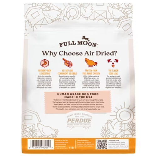 Important Note for Our Valued Customers: To offer you the best prices with free shipping, we occasionally experience shipping delays. If this happens, we’ll notify you immediately, issue a full refund, and invite you to place a new order at your convenience. To keep costs low, we sometimes reuse branded packaging boxes for shipments—we appreciate your understanding if you receive your order in repurposed packaging. Rest assured, all products we sell are 100% brand new, unopened, and freshly manufactured, including pet food and human-grade items, with a minimum 8-month shelf life remaining. If any issues arise, please contact us first—we’re committed to resolving them quickly. If you’re not completely satisfied, we offer a full refund with no hassle. Thank you for your trust and support! Highlights Complete and balanced for adult dogs; nutrient-rich & digestible As easy and convenient as kibble USDA meat and ingredients sourced responsibly from family farms in the USA The flavor dogs love without the use of fillers or artificial preservatives Minimally processed for maximum nutrient retention Description FULL MOON started with a mission to feed your dog the same nourishing ingredients you’d feed yourself. We believe if it isn’t good enough for us, it isn’t good enough for our pets. That’s why we begin at the source with humanely raised protein from Perdue Family Farms and make our food in USDA-inspected facilities with 100% Human Grade ingredients, following quality standards made for people food. The result is more nutrients in every bite for a happy, healthy pup. What makes our food special? Nutrient-rich & digestible: Air drying naturally retains more vitamins and minerals due to its minimal processing, helping your dog to digest. More nutrient absorption, less waste. As easy and convenient as kibble: Experience the benefits of fresh dog food with the convenience of dry. Easy to store, scoop and serve without handling raw food. Our Air Dried is like kibble, but better! Protein from free range chicken: USDA chicken makes up 90% of our recipe- no rendered meals or pea proteins – so your dog gets the essential amino acids it needs from high quality pieces of meat you can see. The flavor dogs love: Our air dried process locks delicious flavor into tender-jerky style bites without the use of fillers or artificial preservatives. Let you dog taste the difference.