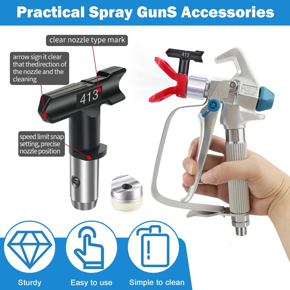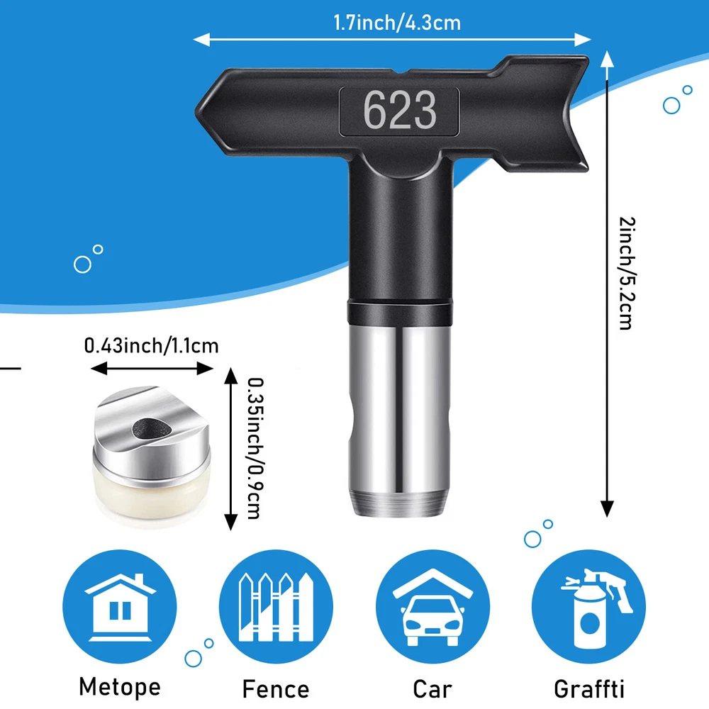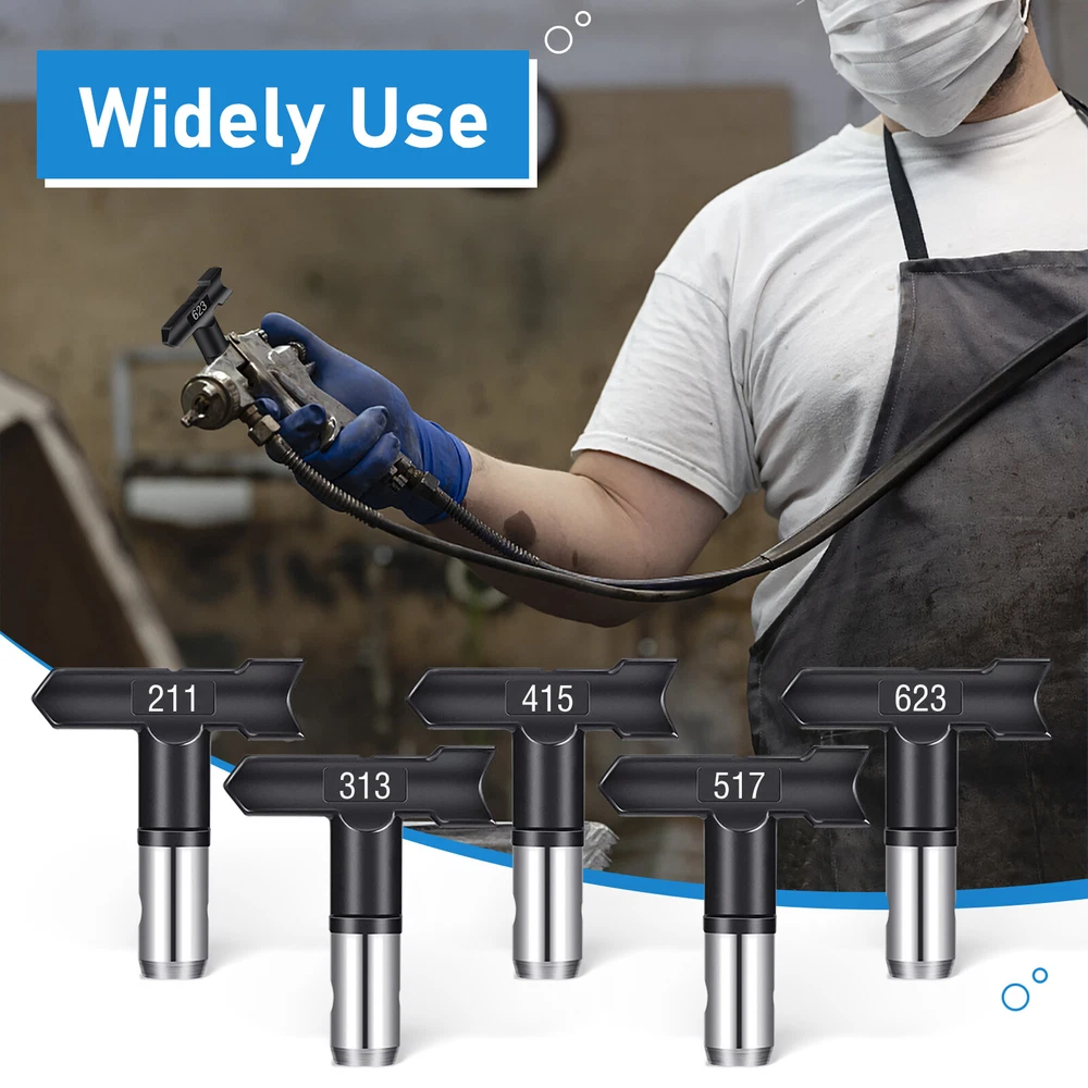 Product Description Features: -【Wide compatibility】 Available in #211, #313, #415, #517, #623, #213, #315, #417, #519, #621, #109, #413, airless sprayer nozzles compatible with most airless sprayers; The spray range will vary depending on the size of the aperture and is perfectly suited to your daily use and replacement needs -【Quality material】 Double-sided airless nozzle made of tungsten steel, strong and wear-resistant, easy to clean, long service life -【Easy installation】 No installation tools, just a few steps to install the airless nozzle on the sprayer; First use the nozzle to seal the nozzle in the protection seat, and then insert the nozzle into the protection seat to rotate to complete the installation, saving time and effort for your project -【Feature HEA Technology】 Nozzles reduce overspraying by up to 55% while providing softer spraying, improved control, and a more consistent finish. Save more paint. Suitable for paint, furniture, fence, home decoration, industrial fine drawing decoration, etc -【 Practical design 】 Airless sprayer nozzle has reverse airless cleaning switch nozzle design, spray can be quickly cleaned in reversible position, prevent nozzle clogging, practical and effective for your work Specifications: - Material: Stainless steel + Tungsten steel - Color: Black - Model compatibility: #211, #313, #415, #517, #623, #213, #315, #417, #519, #621, #109, #413 Package included: 1x Nozzle