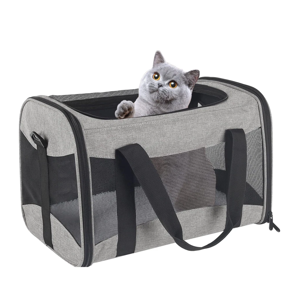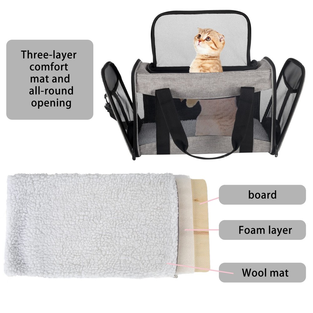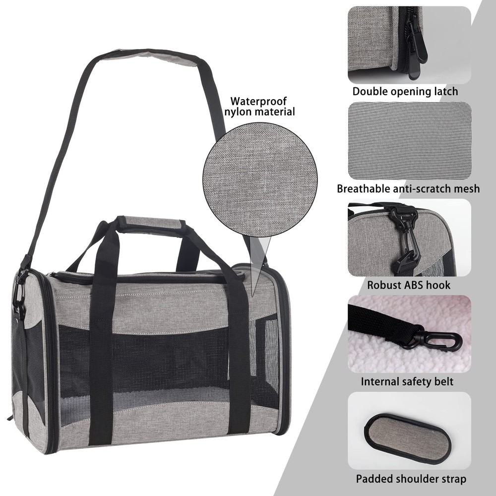 【PRODUCT DIMENSIONS]: Pet travel carrier size:17x11x11 inches,recommended up to 15 lb pets, it is suitable for large, medium cats and small dogs. Please don't choose your airline cat carrying case based on weight—please refer to your pet's length and height when choosing a pet carrier size. 【AIRLINE APPROVED】: This cat carrier is designed with airline approved, it can fit comfortably under most flight seats, we can take our pets wherever we want. Dog travel carrier offers two attachment loop handles that can be used as a dual harness or as a luggage strap for balanced carry and secure transport. 【EXCELLENT MATERIAL】: Collapsible cat carrier is made of polyester fabric, supported by a steel ring, washable, wear-resistant and durable. The three sides and the top of this pet carrier are nylon mesh, scratch-resistant and not easy to damage, it can not only check your pet in real time, but also ensure enough air circulation. 【SAFE AND COMFORTABLE】: Dog travel bag has metal zippers on the top and side entrances, durable and not easy to deform, it allows your pets to enter and exit easily. The cat carrying case is equipped with an anti-escape safety buckle, which can effectively prevent pets from accidentally falling. It is suitable for car rides and vet rides. 【PORTABLE AND FOLDABLE】: Pet travel carrier comes with a detachable and hand washable wool pet bed, it can provide a comfortable sleeping space for your traveling pet. The cat travel case comes with an adjustable shoulder strap and handle for easy portability. When not in use, you can fold it up for storage.