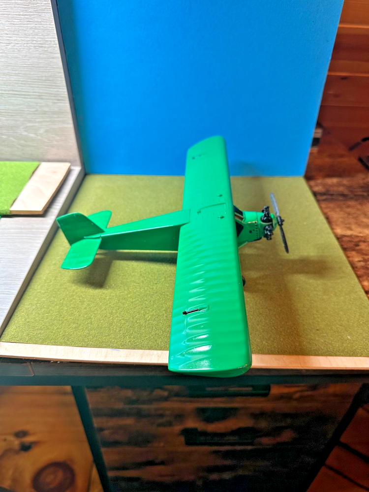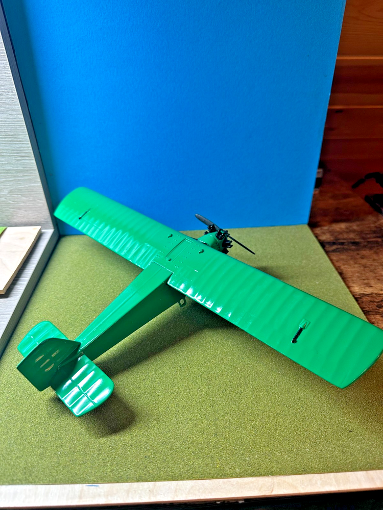 Airplane Vintage Diecast Beautiful Green New 13" Wingspan Exposed Magnetos New On display in a glass case Length, Front of engine to tail: 8-1/2"