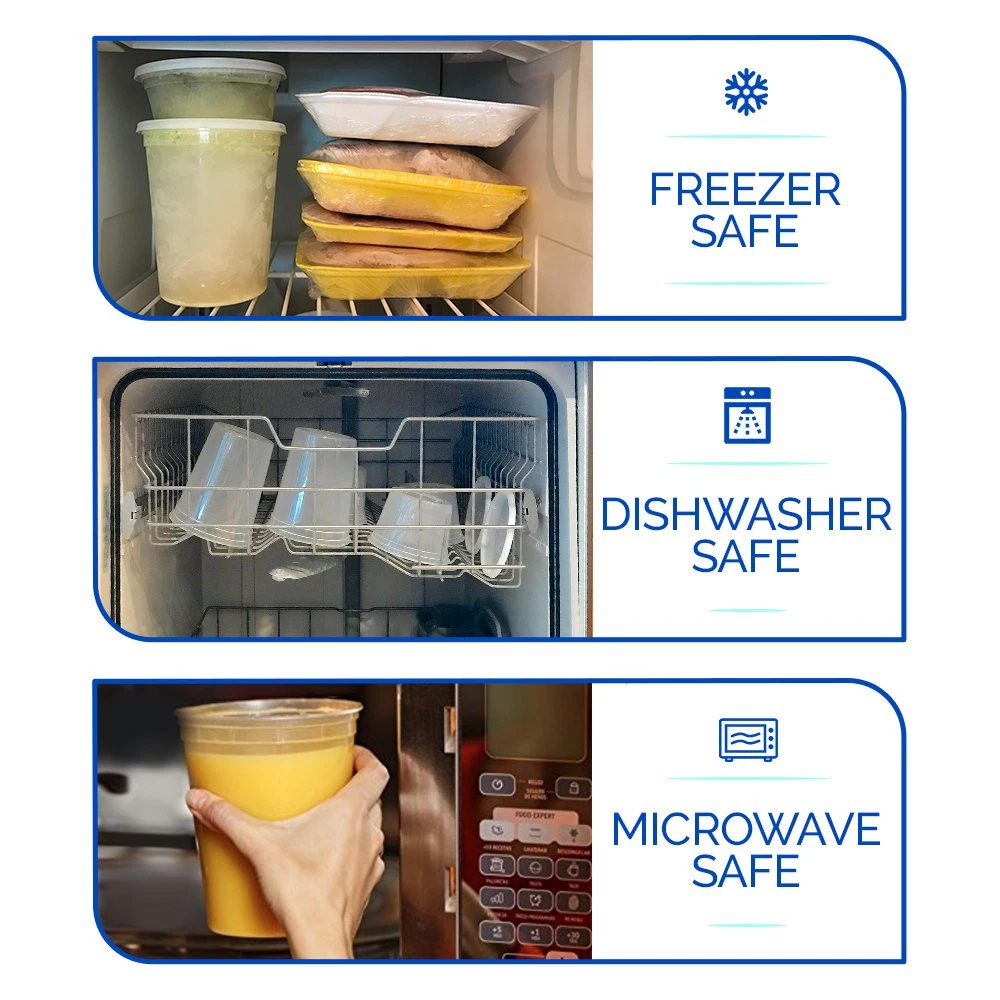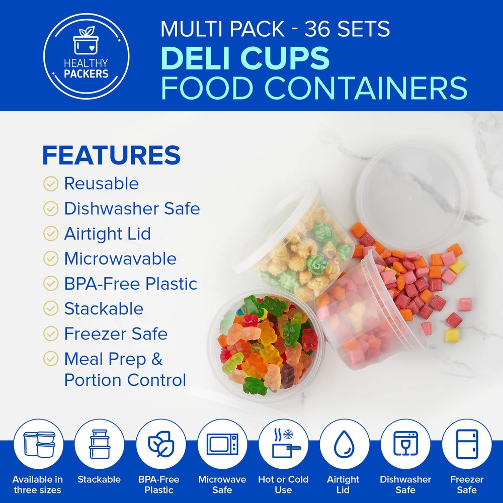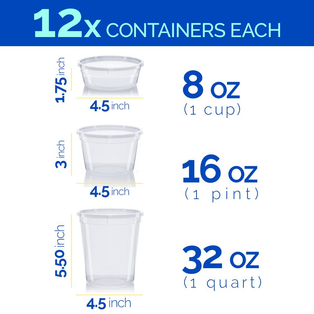 EXTRA DURABLE CONTAINERS - 36 sets of round stackable cup size deli cups (8oz, 16oz, 32oz ). Our sturdy takeout containers come with airtight sealing lids and are 100% Leakproof. Keep those liquids in. No more messy fridges and lunch bags! RESTAURANT QUALITY - 100% BPA Free clear heavy gauge polypropylene plastic. Reusable, microwavable, freezer and dishwasher safe! Perfect addition to your kitchen, lunch bag, bento box or to use as travel containers. SUPER VERSATILE - Great for leftovers, dry snacks, soups, meal prepping or even to organize jewelry, arts & crafts, party supplies, slime and everything in between. Great for 21 Day Fix as well. Oh, so many uses! SATISFACTION GUARANTEED - Here at we made these containers with you in mind. Your satisfaction is our top priority. Not fully satisfied? Shoot us an and we'll make it right.