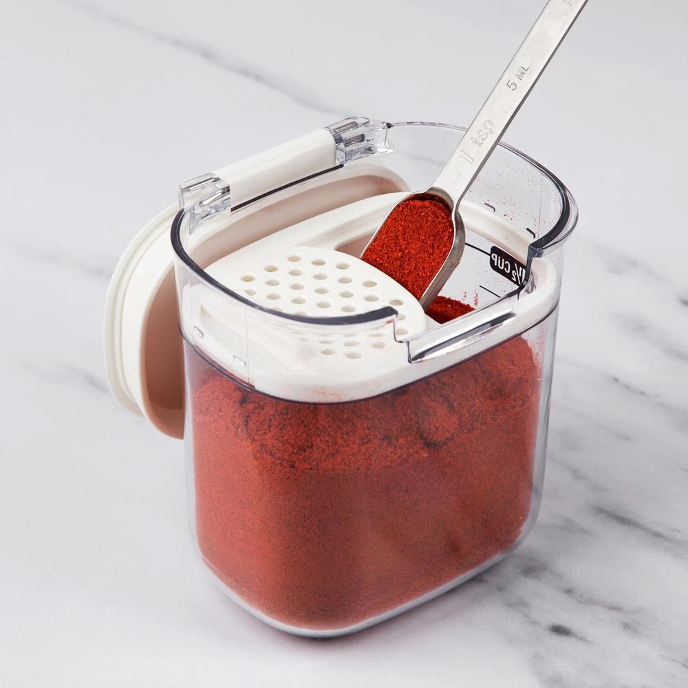 About this item Airtight Seal for Long-Lasting Freshness – Each container is equipped with a silicone seal and stainless steel latch to lock in freshness and protect dry ingredients from air and moisture. Perfect for maintaining the texture and shelf life of flour, sugar, and more. Custom-Fit Design for Essential Baking Ingredients – Includes 5 specialized containers to hold standard ingredient bag sizes: the Flour Keeper (4.36 qt., 8"x6"x9.5") fits a 5 lb bag and includes a built-in magnetic leveling bar; the Sugar Keeper (2.5 qt., 6.125"x7.75"x8.5") fits a 4 lb bag with a flip-to-pour spout and contoured shape; the Brown Sugar Keeper (1.5 qt., 6"x5.5"x5.625") holds 2 lbs and includes a terra cotta disk to prevent clumping; the Powdered Sugar Keeper (2.04 qt., 7.125"x5.25"x6.5") holds 2 lbs and features a removable magnetic dusting spoon; and the Mini Keeper (0.41 qt., 4"x3.5"x4.25") is ideal for baking soda, spices, or sprinkles and includes a shaker/leveler. Accessory-Rich for Smart Storage – Comes with built-in magnetic tools like a leveling bar, measuring/dusting spoon, and removable terra cotta tamper to keep brown sugar soft. All accessories store neatly under each lid for space-saving efficiency. Clear, Stackable & Easy to Use – Transparent BPA-free canisters offer clear visibility of contents and measurement markings for accurate prep. Stackable design helps optimize pantry space and stainless steel hinges provide smooth, wide-lid opening for easy access. Built for Daily Use & Easy Cleaning – All pieces are BPA-free, feature an easy-catch latch for secure sealing, and are top-rack dishwasher safe for fast and effortless cleanup. Color: White Material: Plastic Material Feature: BPA Free, Dishwasher Safe, Food Grade Capacity: 4.36 Quarts