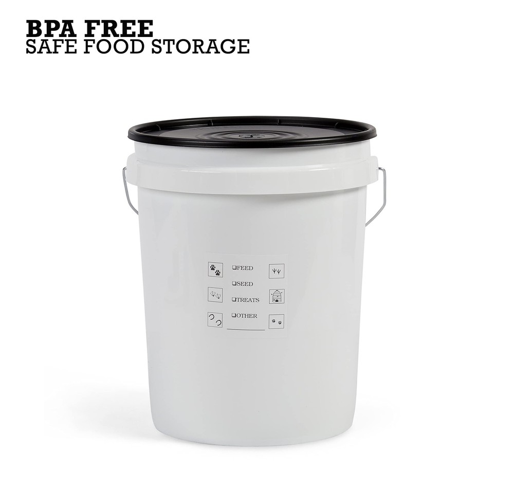 AIRTIGHT STORAGE – The airtight design of this pet food storage container preserves the freshness of your pet’s treats or feed. The durable quality also helps with odor control, and keeps moisture, humidity, and pests from entering the container. WIDE MOUTH DESIGN – This dog food storage container is designed with a wide mouth opening for easy access. Easily dispense your pet’s treats and dry food into their cat or dog food bowl without the hassle of opening and closing a large bag. VERSATILE USE – This storage bin is great for birdseed, cat litter, kibble, dry pet food, and more. Not only for pet storage, this container is also great for use as a dog toy bin, dry food storage, rice storage, bulk food organization, and more. EASY IDENTIFICATION – airtight food storage containers are equipped with a decal to indicate what’s inside. The decal allows you to specify whether the bin contains feed, seed, treats, or something such as pet supplies or litter. SNAP-TIGHT LID – This 5 Gallon pet food container is equipped with a durable snap-tight lid to prevent your pets from getting into their treats or pet food. It also stays tight to prevent dog food, bird feed, or cat food from getting stale.