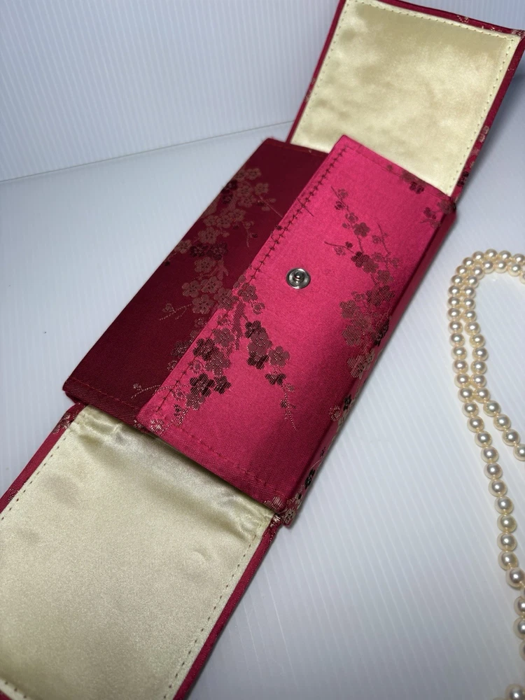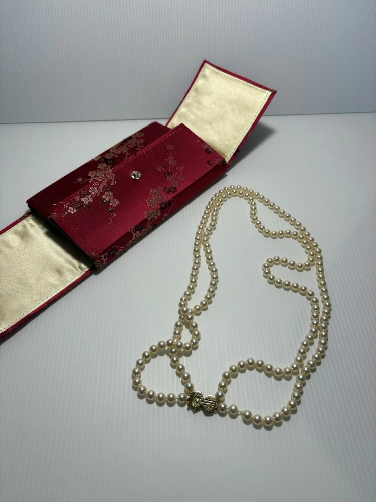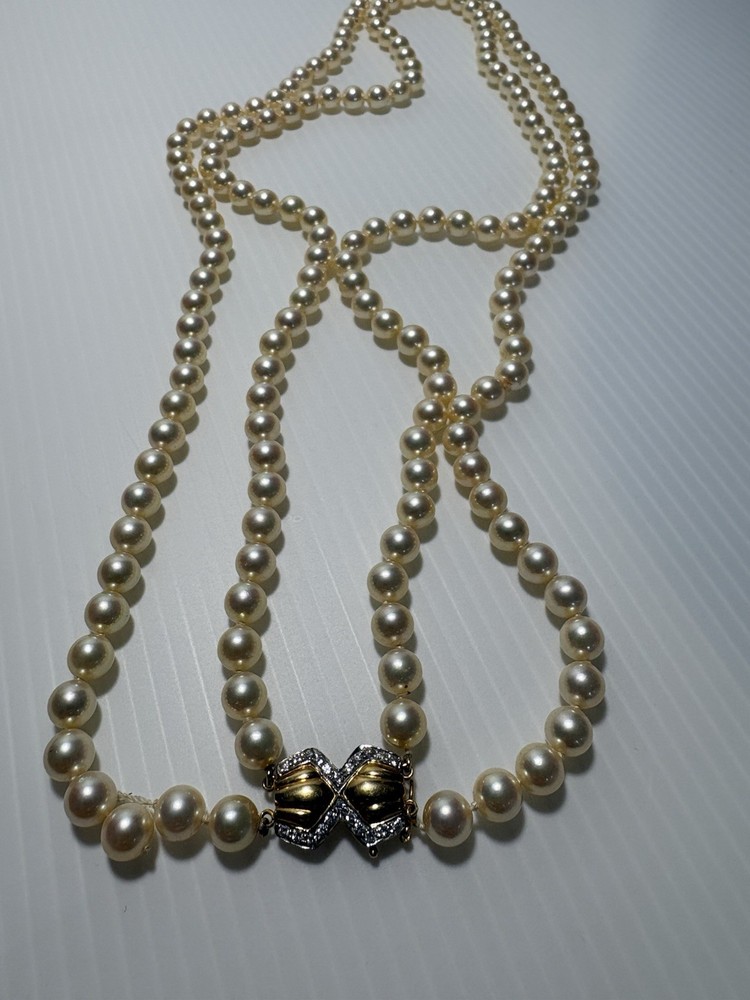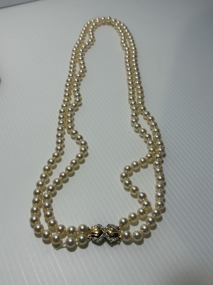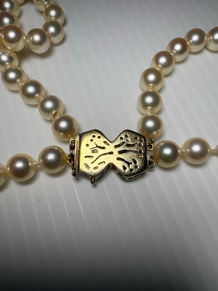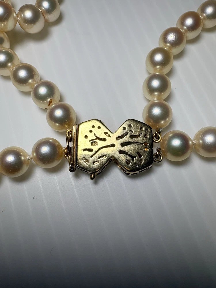 --- ✨ Description Beautiful vintage Akoya pearl double‑strand necklace featuring a luxurious 18K gold (750) clasp accented with diamond‑cut detailing. The clasp is fully hallmarked (750 / AK / 122), confirming authenticity and fine craftsmanship. The pearls are luminous, well‑matched, and gracefully strung in two classic strands, creating an elegant drape that flatters any neckline. This is a timeless piece of fine jewelry—perfect for special occasions, gifting, or adding a refined touch to your collection. Features • Genuine Akoya pearls • Double‑strand design • Solid 18K gold (750) clasp • Hallmarked: 750 / AK / 122 • Diamond‑cut detailing on clasp • Secure vintage box clasp with safety latch • Excellent condition Condition Pearls are bright and lustrous with minimal signs of wear. Clasp is clean, secure, and fully functional. Overall, a beautifully preserved vintage piece , needs to restring again touching it just went off the clasp … Includes Elegant embroidered jewelry pouch for storage or gifting. Any questions pls feel free to contact me