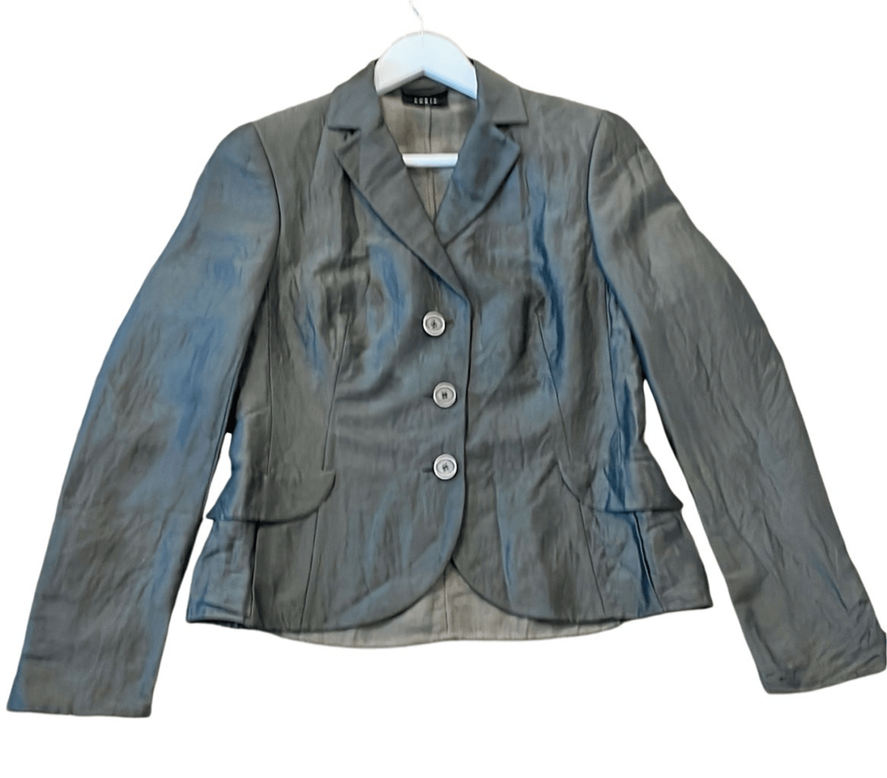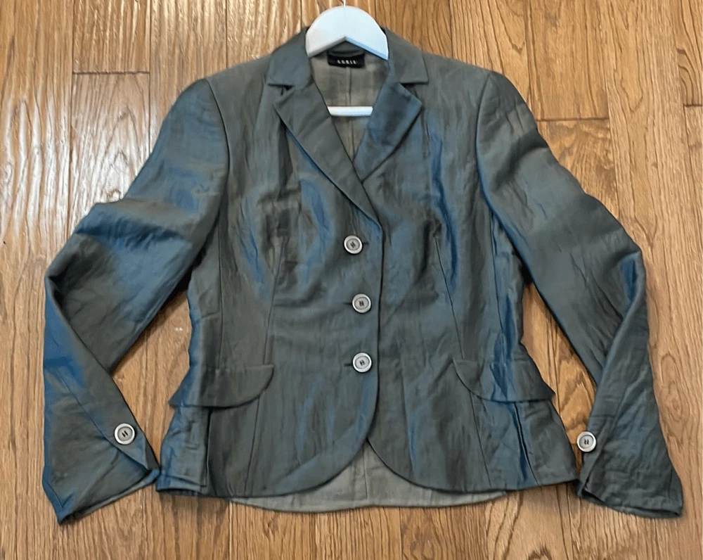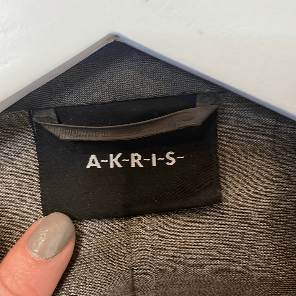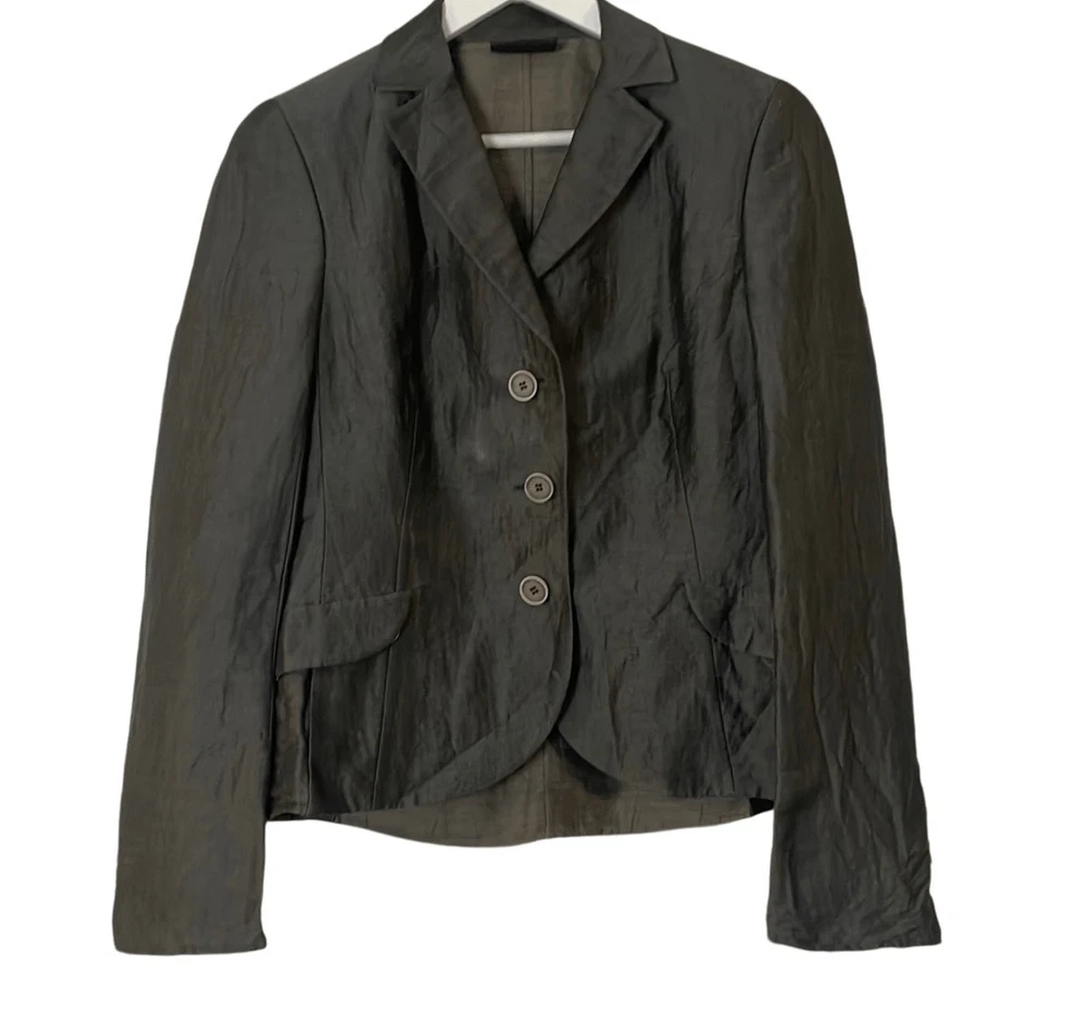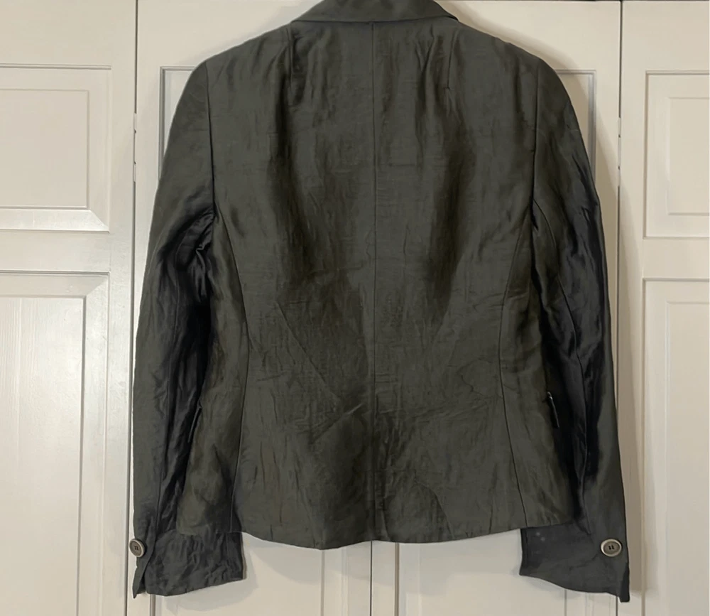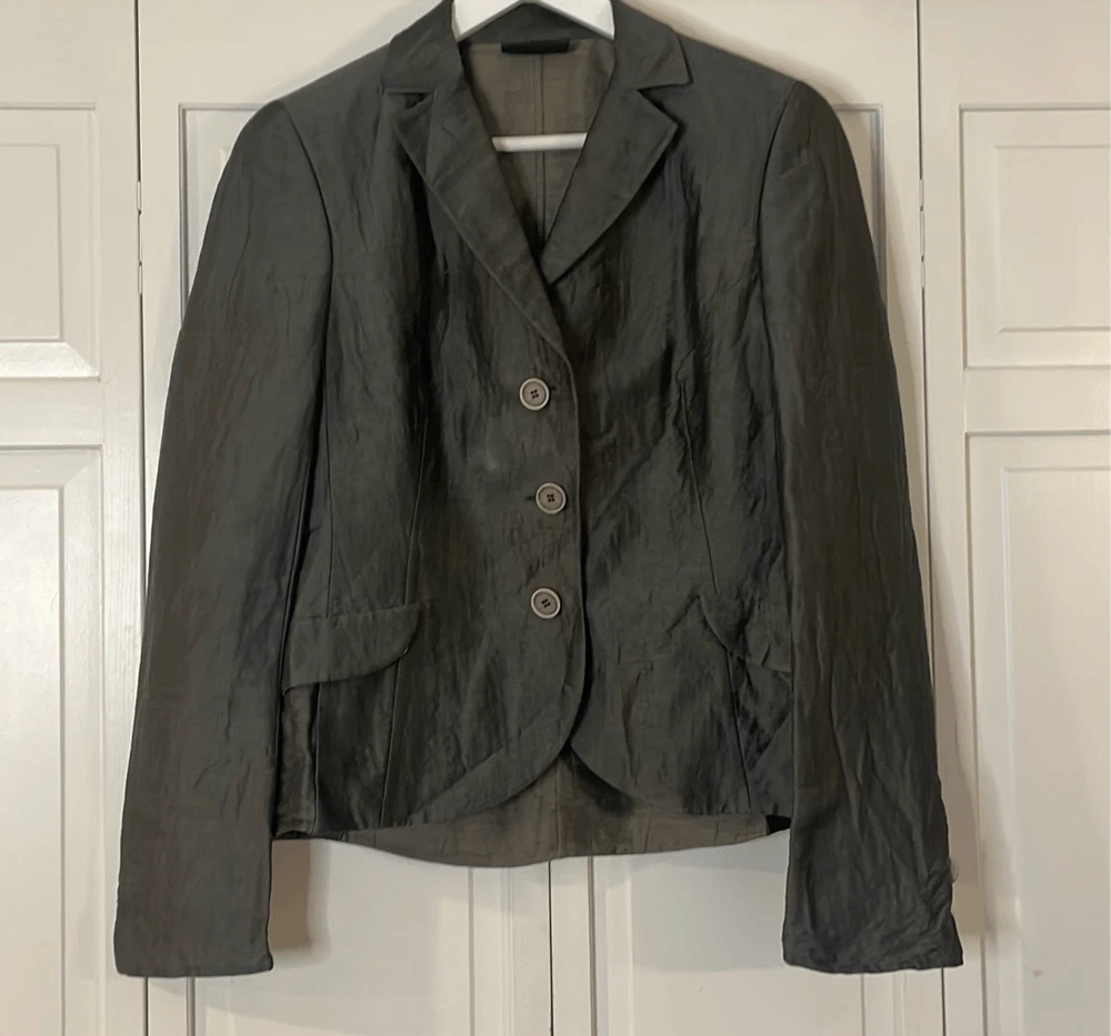 Brand: Akris Description: Linen Wool Solk blend three button closure blazer with front flap pockets Size: 8 Color: grey charcoal Condition: Gently Worn Very Good small blemish on front could be dry cleaned Measurements: Pit to pit: 18” Length: 23” **Bundle and Save!!** all measurements are approximate and taken laying down