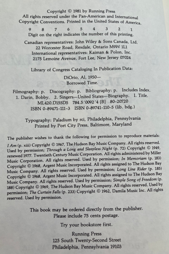 Al DiOrio - Borrowed Time: The 37 Years of Bobby Darin (1981). First edition US hardback. FREE postage on all items. I endeavour to describe and grade stuff accurately. In the unlikely event that you are unhappy with your purchase I will refund you in full if you return it. I will also refund return postage if there is a genuine fault on return inspection. Check my feedback and buy with total confidence.