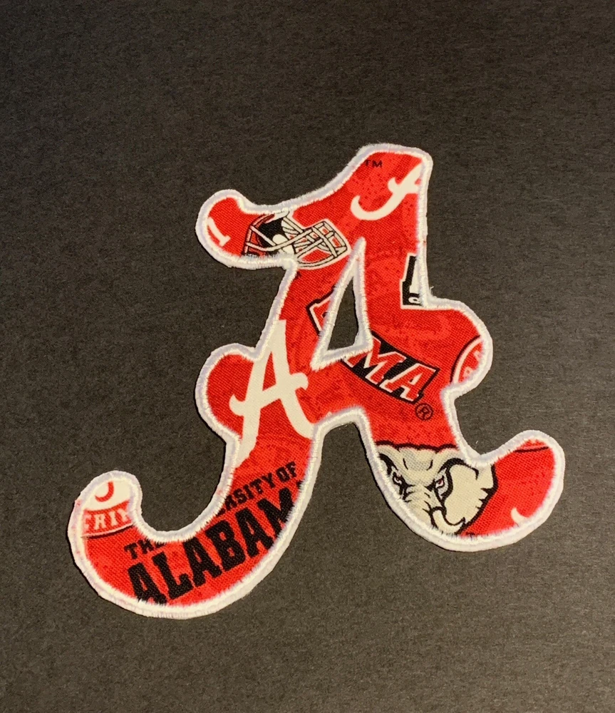 Alabama Appliqué A Iron On patch. Condition is New Item: Alabama Fabric Letter A Iron On Applique A fabric appliqued A with an embroidered satin stitch edging. Applique can be ironed on or sewn onto most fabrics and materials. Size: 4“ Height /4 1/8” Fabric Color: Red, White, & Black Embroidery Thread: White
