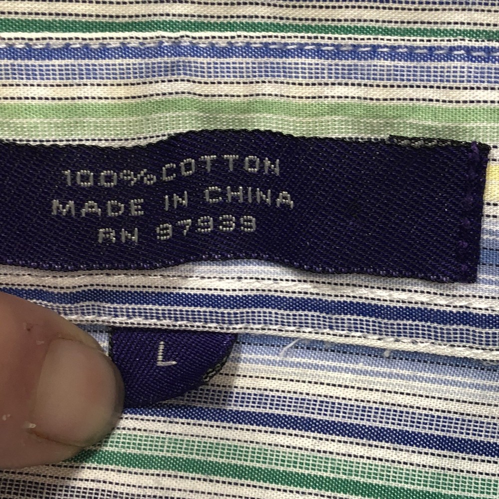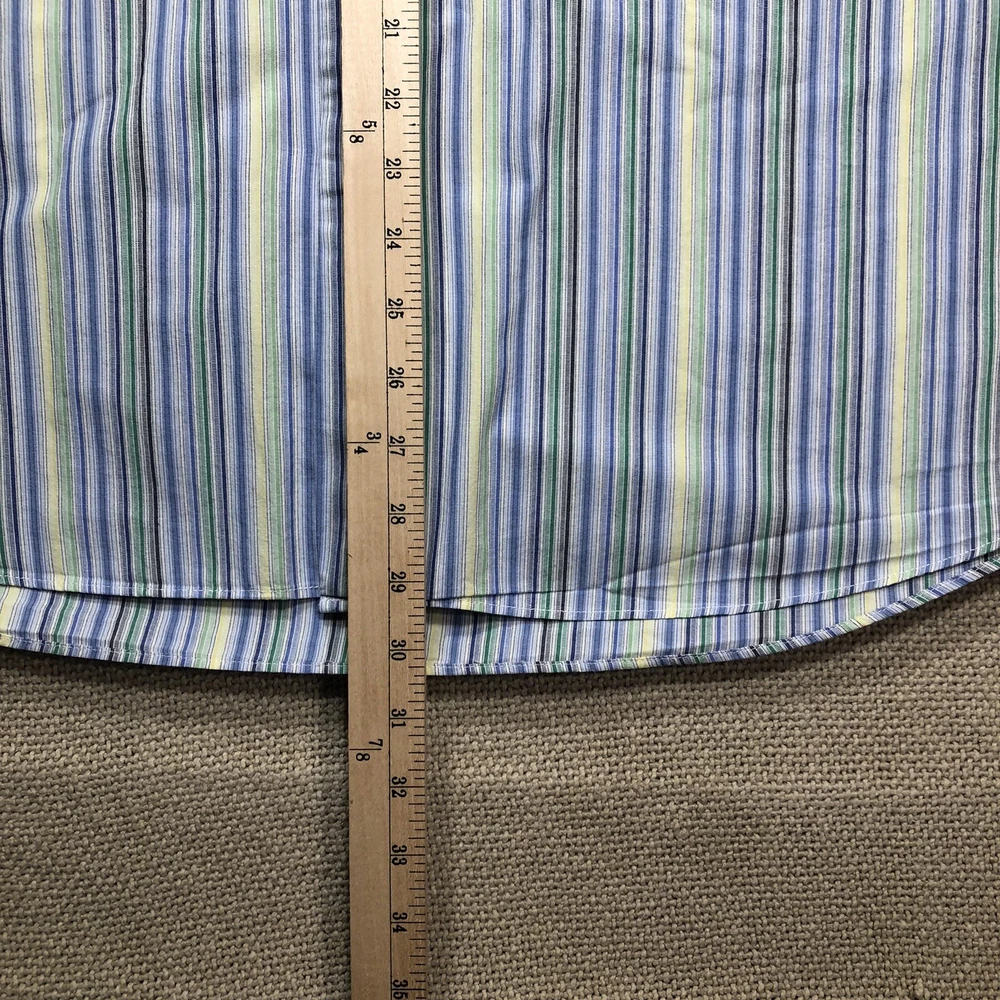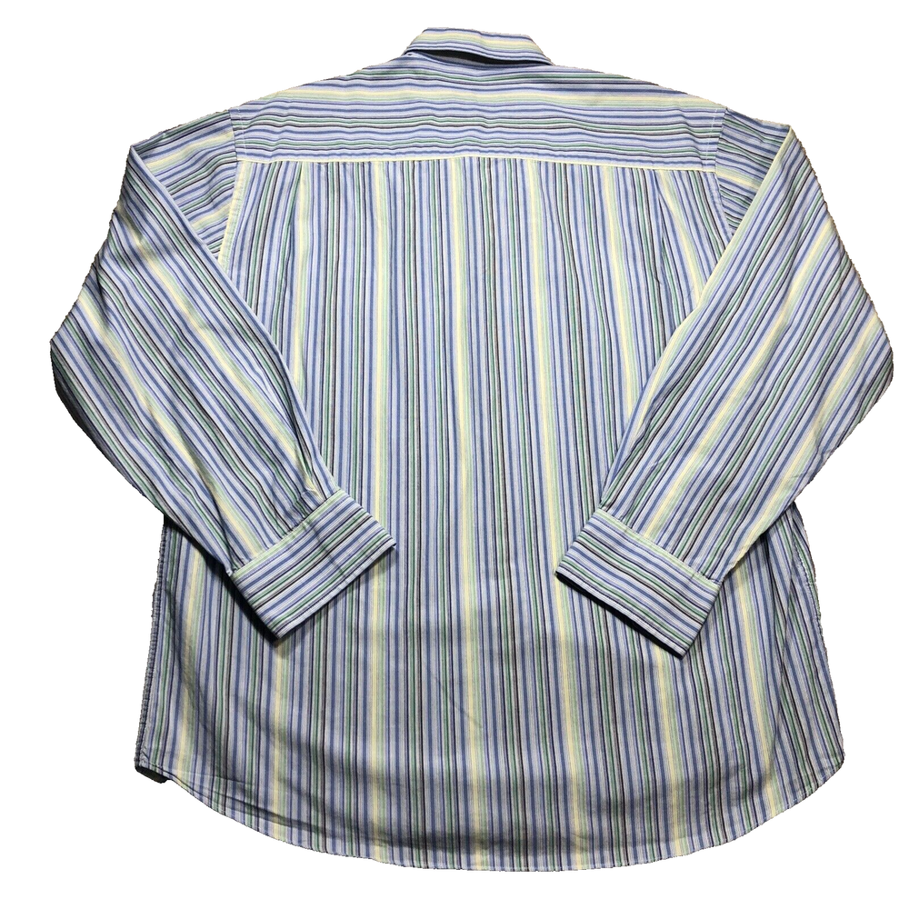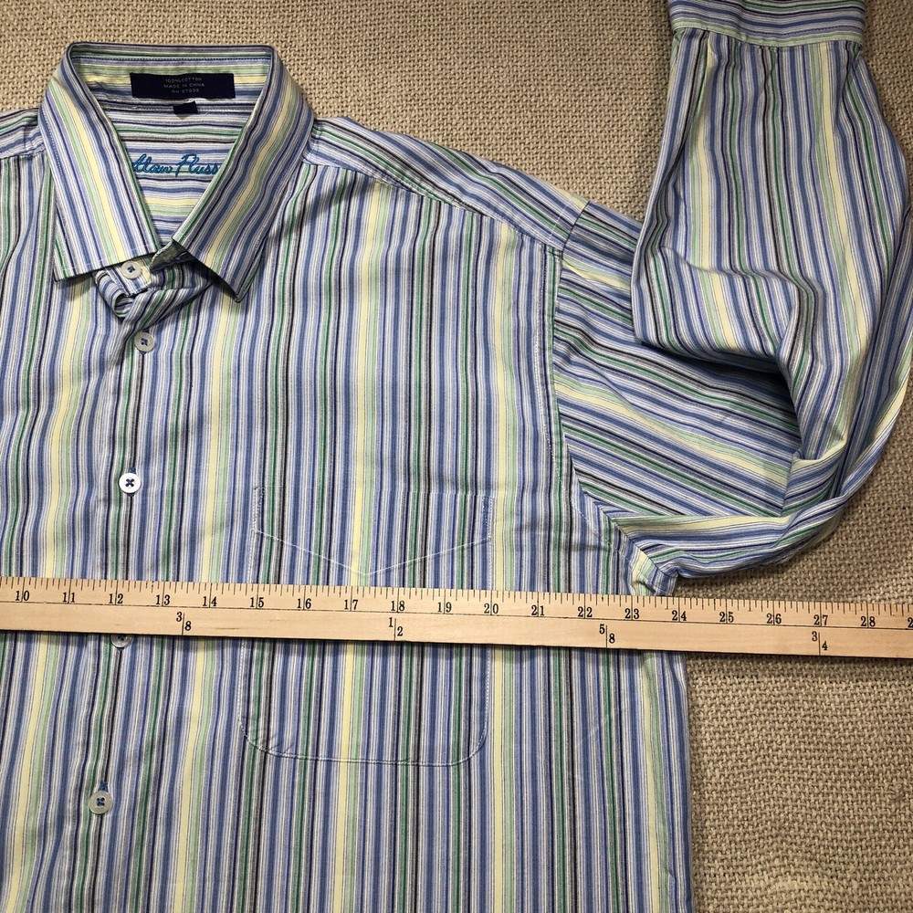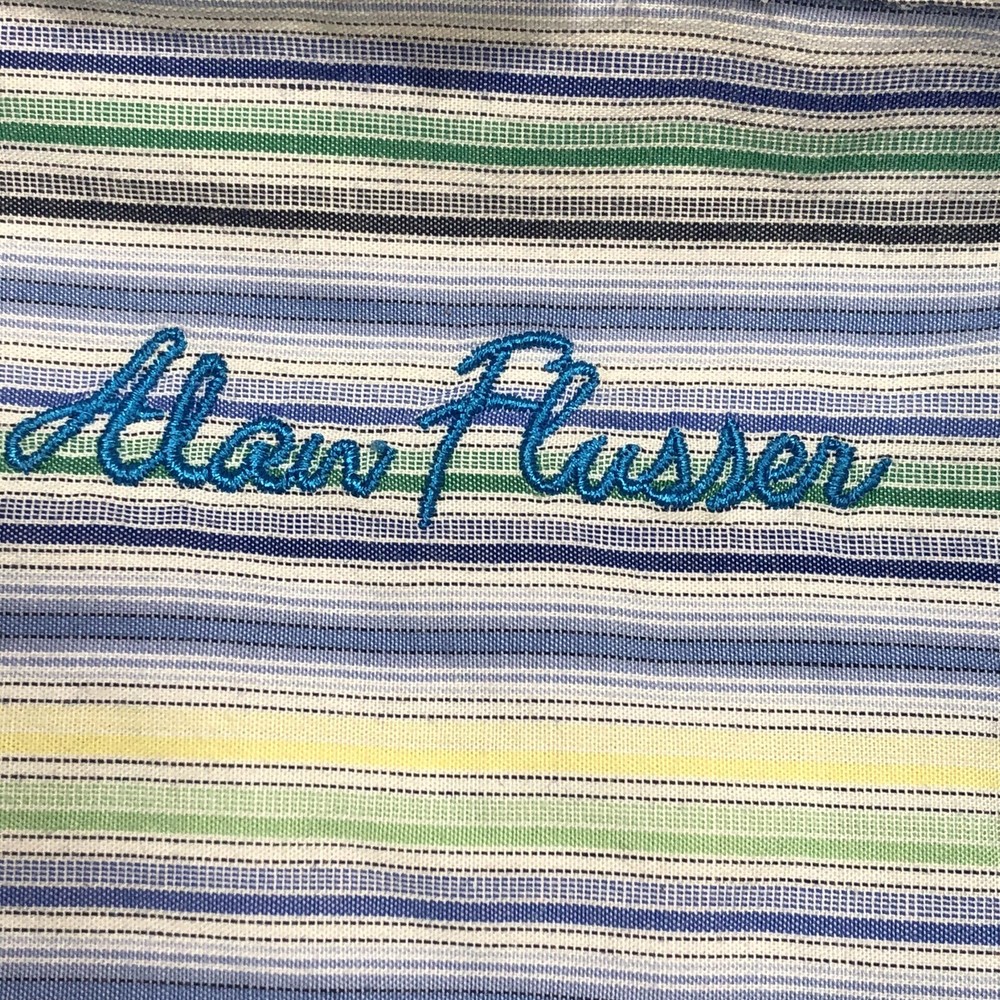 The Alan Flusser Button Shirt for men in size L features a multicolor vertical striped design, making it suitable for various occasions including weddings, parties, casual wear, formal events, and business meetings. This woven shirt has a collared neckline with a button-down style and long sleeves, with a chest size of 48 inches and a neck size of 19 inches. Made from 100% cotton, it is machine washable and has a regular fit, making it a versatile and stylish addition to any man's wardrobe.
