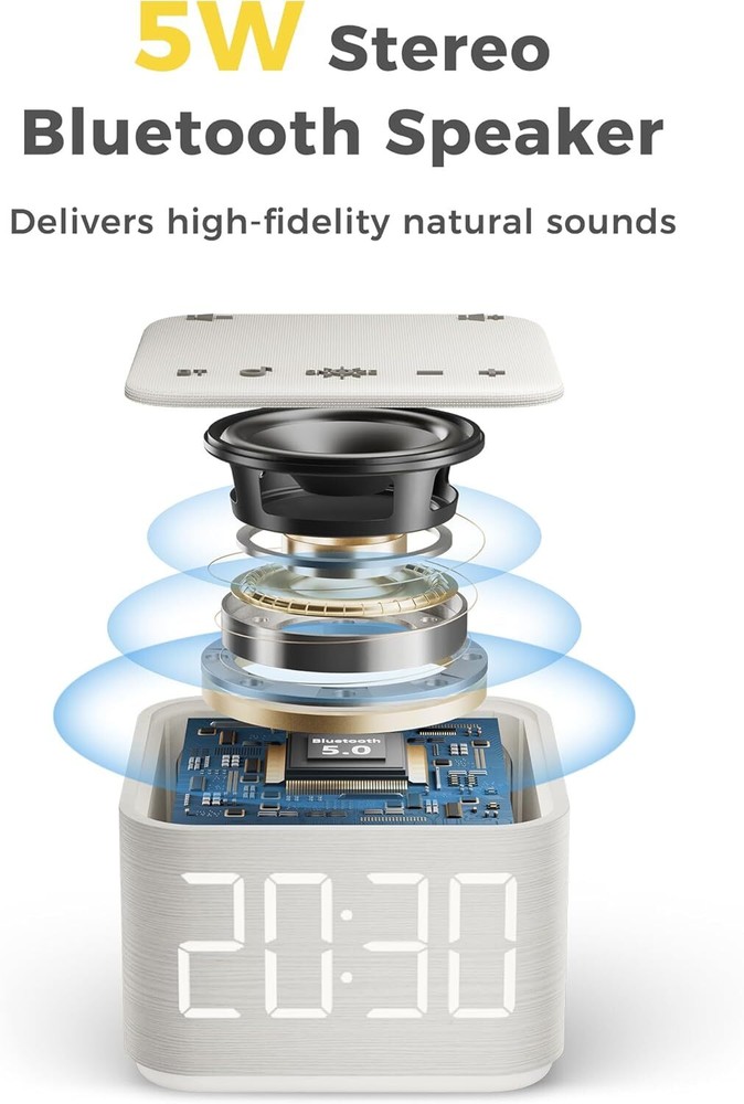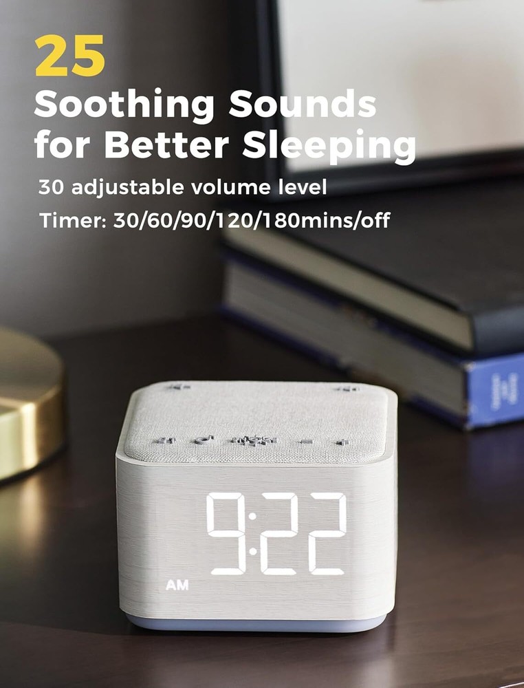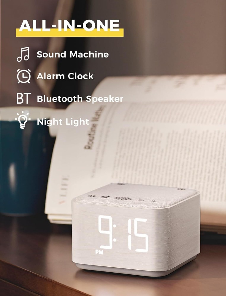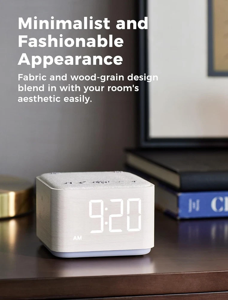4-in-1: Designed with sound machine, alarm clock, Bluetooth speaker and night light in one integrated machine, help you relax and fall asleep easily, wake up gently. Extra USB charging port ensure your devices are fully charged while you rest. Sleeping Better with 25 Soothing Sounds: Get a peaceful sleep with 5 white noise, 5 fan sounds and 15 nature sounds. With precise 30-level volume control to create a personalized sleep environment, suitable for adults babies and kids. Bedside Digital Alarm Clock: Wake up gently with 8 alarm sounds ( bird chirping, piano, windbell, soft music, brook, wave, buzz and beep) and 0-100% adjustable display dimming, gradual volume control for a smooth morning routine. 5W Stereo Bluetooth Speaker: Sound machines features high-fidelity 5W stereo speaker that deliver loud and clear alarm sounds. It also doubles as a wireless speaker with Bluetooth 5.0 technology, allowing you to stream your favorite music, audiobooks, or podcasts. 8 Color Night Light: Choose from 8 lively colors to create a relaxing and sleeping-friendly ambience. With 4 adjustable brightness levels and off option, no interruption for sleeping and guiding at dark night. Stylish Modern Design:Combining fabric and wooden finishes for a modern touch of elegance. Compact size (3.4"x 3.2"x 2.5") fits seamlessly into any space for a perfect sleep experience at home, in the office, or while traveling.