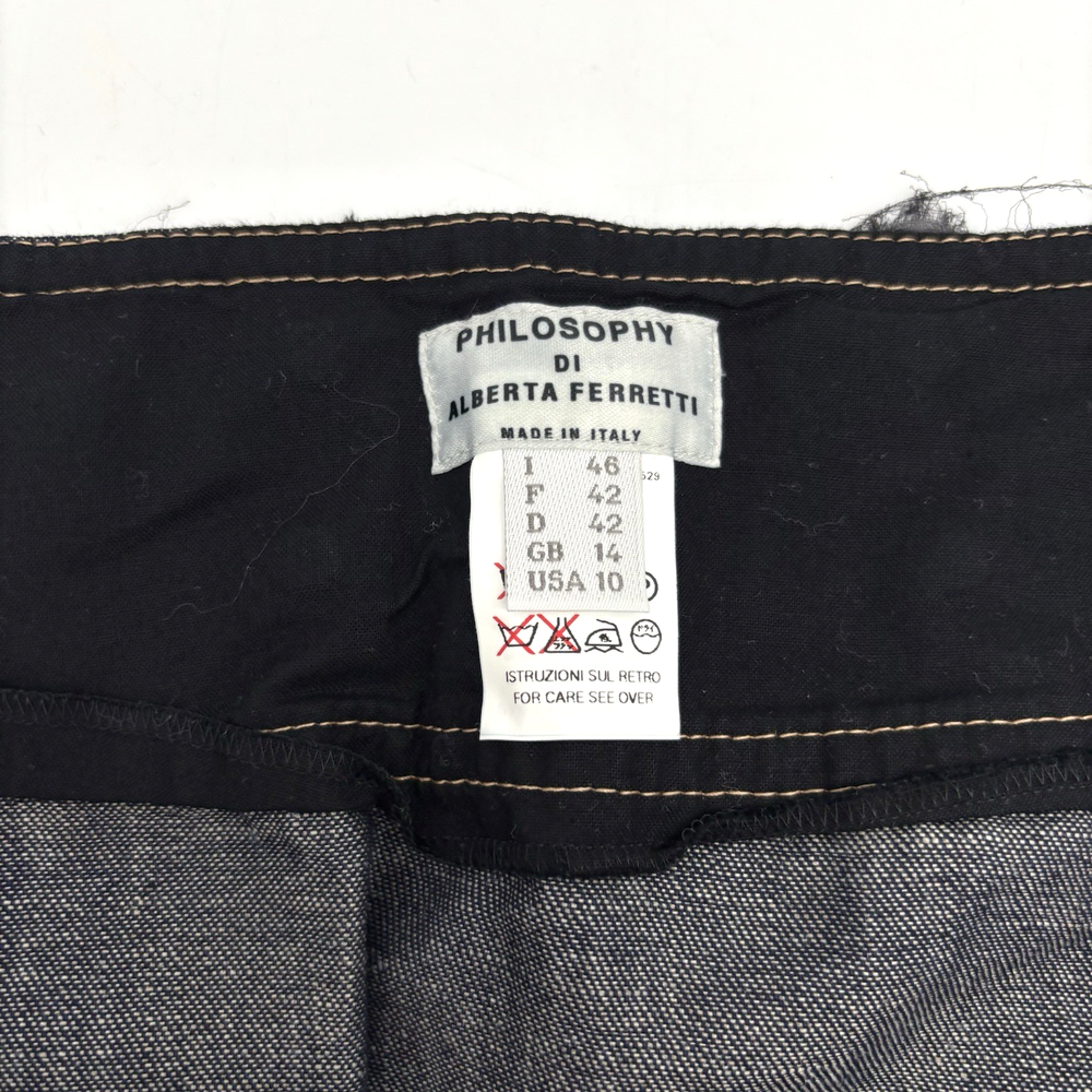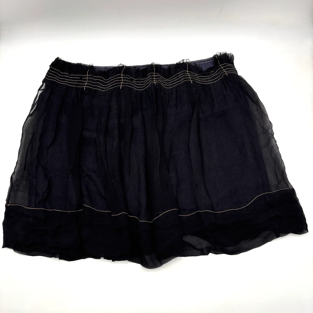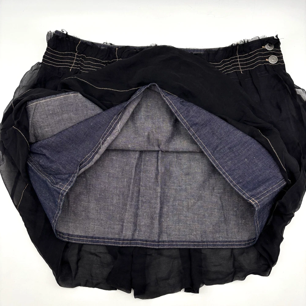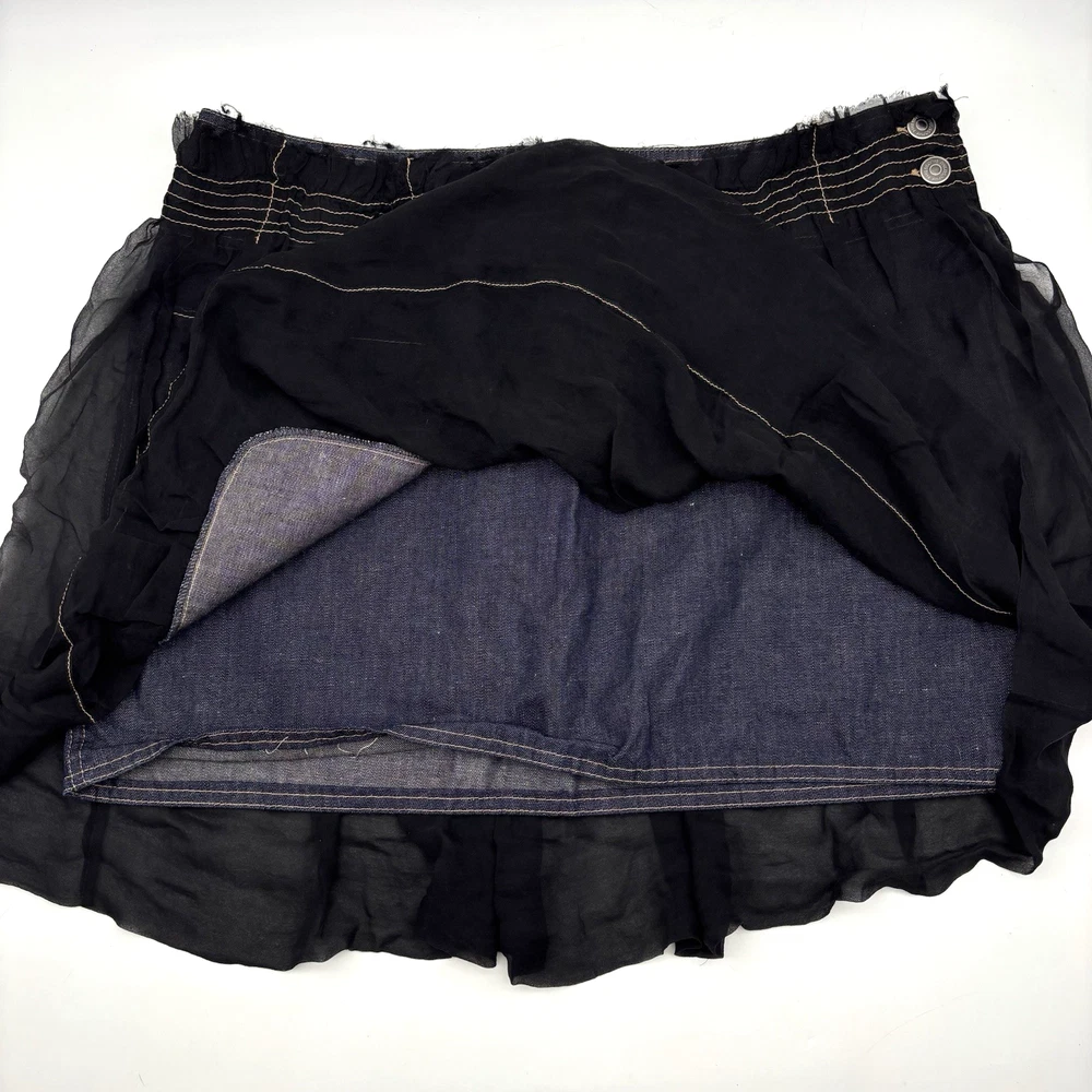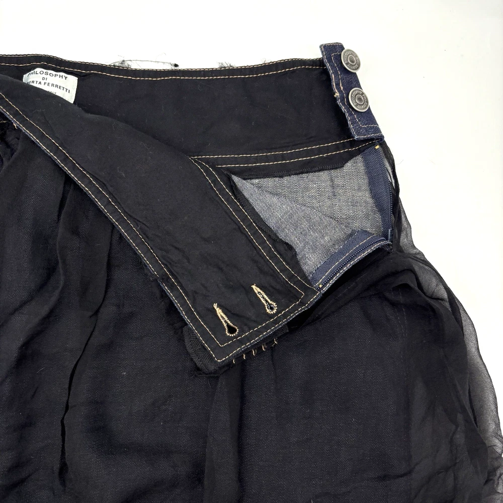 Philosophy di Alberta Ferretti Ruffle Mini Skirt Made in Italy Dark Wash 68% Cotton, 32% Linen Denim Body Black 100% Silk Overlay Above Knee Length Flat Front Ruffle Hem 1Pouch Pocket on Front Silk Overlay Zip and Double Button Closure on Left Hip Lightweight! No stretch! Professional Clean Only Women's Size: US 10 I 48 F 42 D 42 GB 14 Please refer to measurements below to ensure accurate fit before purchase! 16" waist (32" circumference) 20.5" hips 28" hem 18" full length from waist to hem Measurements made with garment laying flat. Excellent pre owned condition. Very gently owned. No rips, tears, stains, holes or other notable flaws. Clean and from a smoke free home.