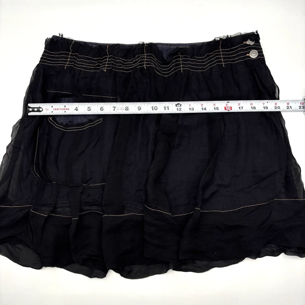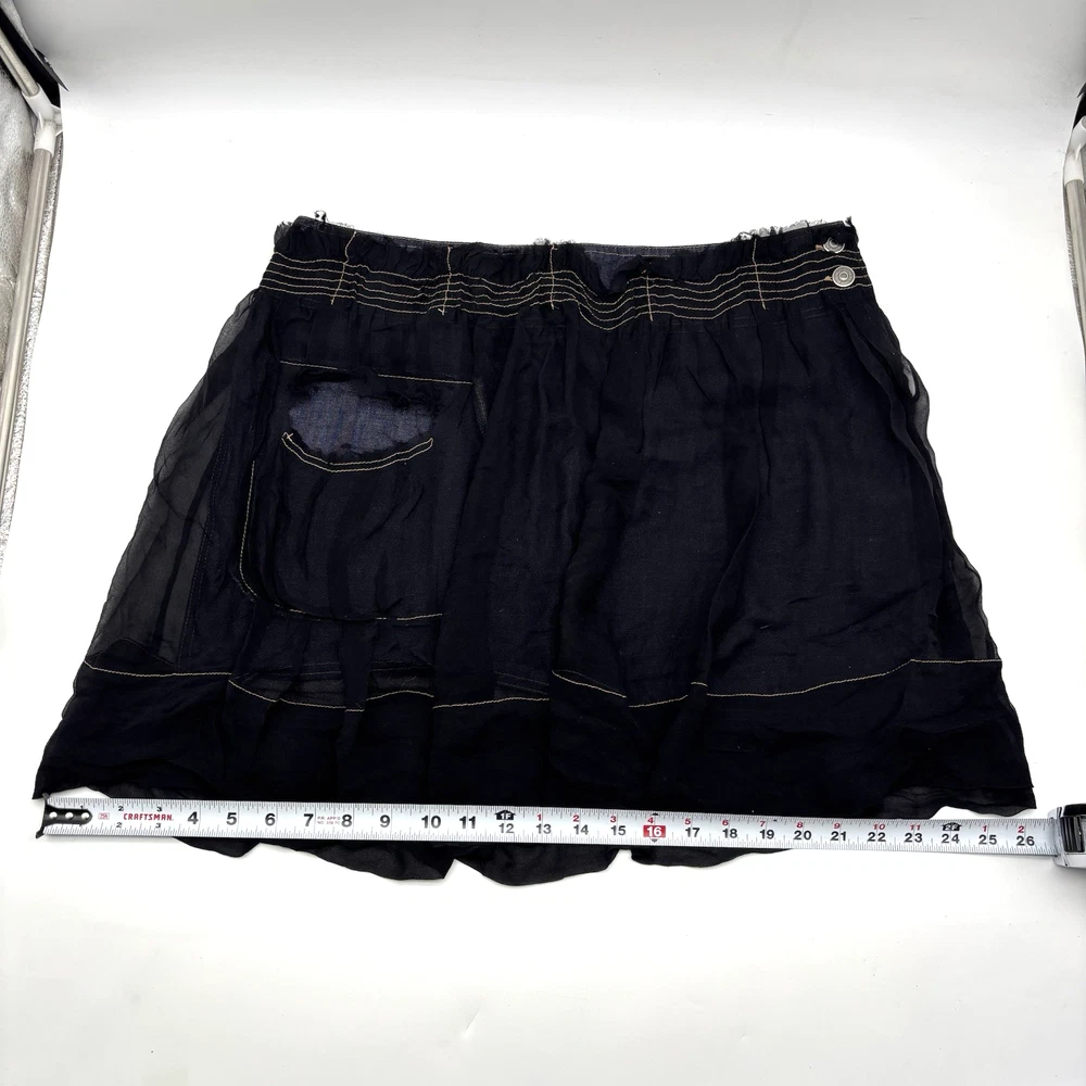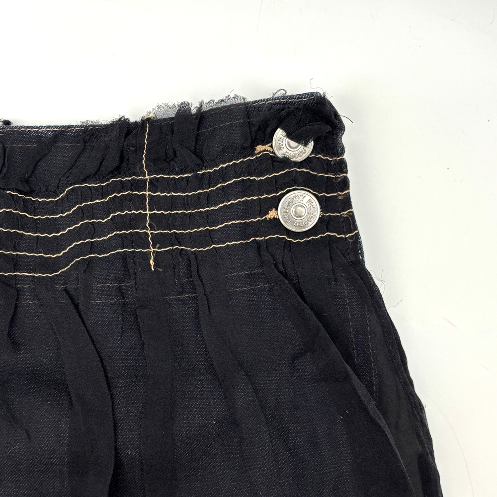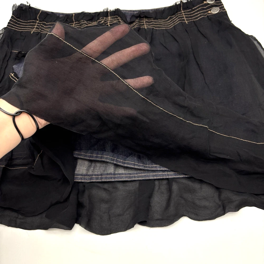 Philosophy di Alberta Ferretti Ruffle Mini Skirt Made in Italy Dark Wash 68% Cotton, 32% Linen Denim Body Black 100% Silk Overlay Above Knee Length Flat Front Ruffle Hem 1Pouch Pocket on Front Silk Overlay Zip and Double Button Closure on Left Hip Lightweight! No stretch! Professional Clean Only Women's Size: US 10 I 48 F 42 D 42 GB 14 Please refer to measurements below to ensure accurate fit before purchase! 16" waist (32" circumference) 20.5" hips 28" hem 18" full length from waist to hem Measurements made with garment laying flat. Excellent pre owned condition. Very gently owned. No rips, tears, stains, holes or other notable flaws. Clean and from a smoke free home.