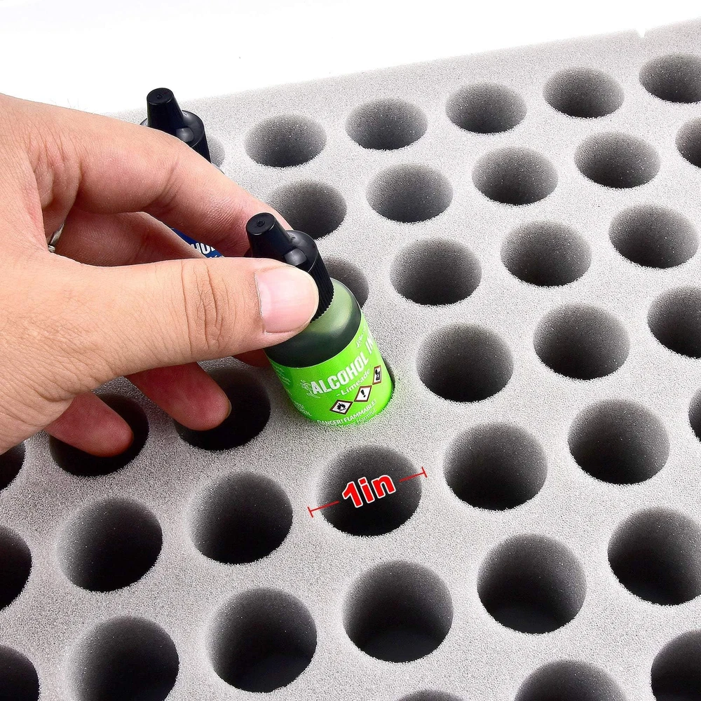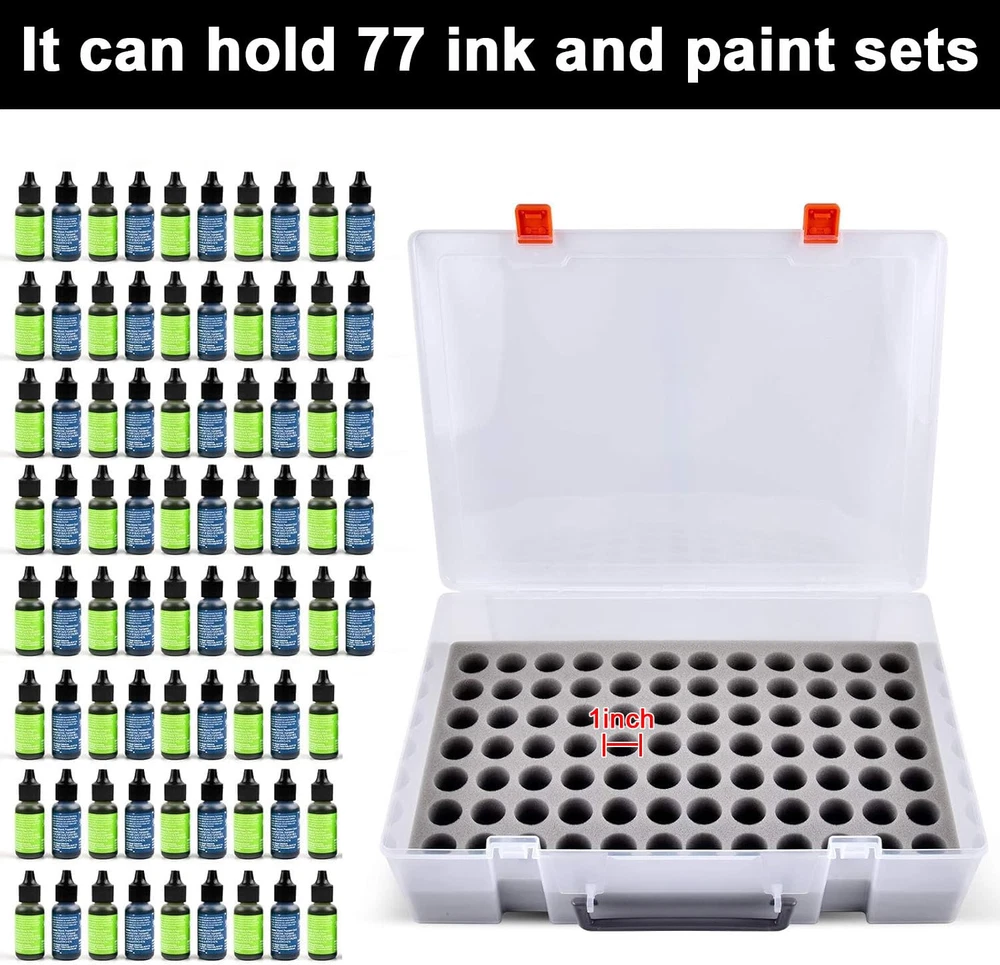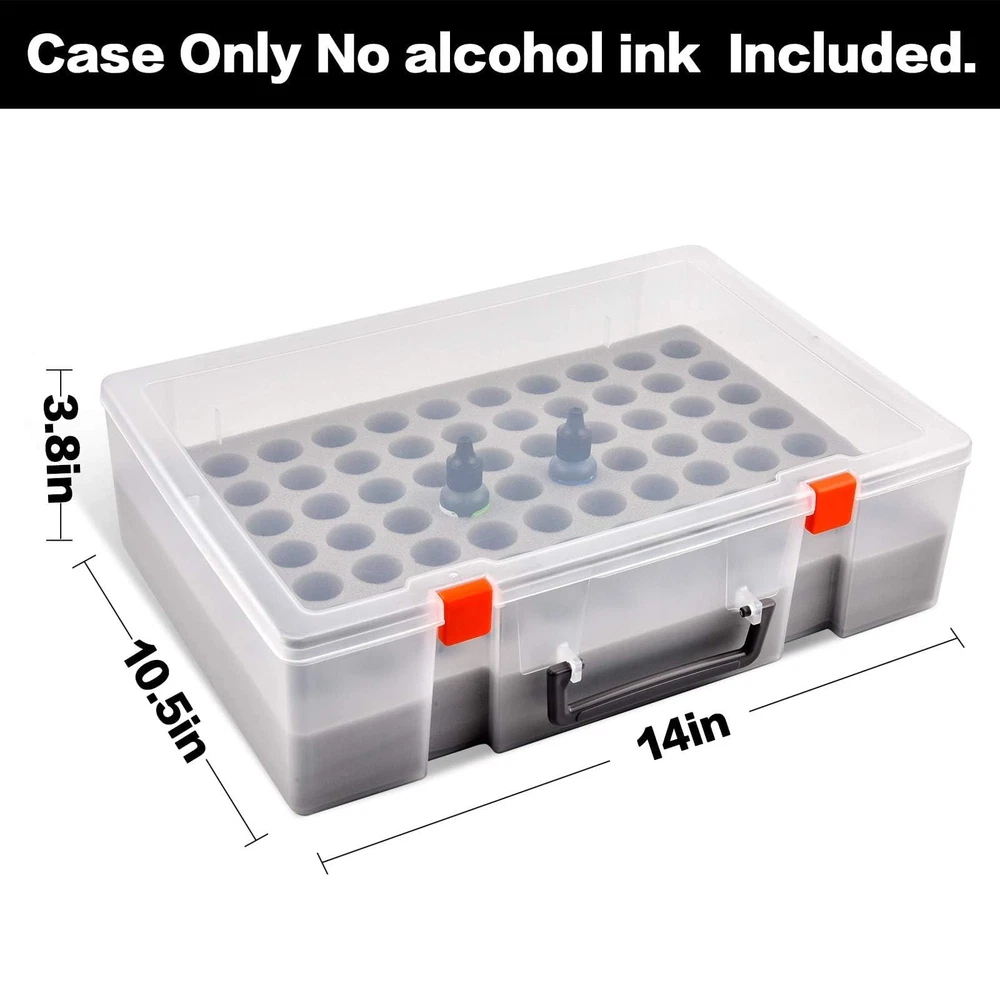 Large alcohol Ink and paints case -Holds 77 Bottles: Fits bottles up to 1 inch wide and 3 inch tall. Keep your alcohol ink collection organized and easily accessible with our large capacity storage case - holds up to 77 bottles, including many brands fits the size (No Any Bottles Included) Strong and heavy-duty plastic material: White alcohol ink case made of good material plastic, more resistant and crash worthiness than acrylic. Clear enough to find what colors you need. Easy for resin petri dish making, for epoxy resin painting, for tumbler cup making Great Construction Art Storage Organizer: Unique insert Foam with nice slot cut, fits for army painter bottles, for vallejo game colors bottles, for reaper paint bottles, for GSW paint dropper bottles, fits the alcohol ink snugly, also can tightly fix all alcohol ink in the groove, avoid the friction between each other, will not spill out due to shaking, keeping your home clean and tidy Alcohol Ink Bottle Storage Container: Stand-up foam design allows you easy to put your paint dropper bottles in and out of the case, make the bottles more stable, keeps the colors from getting spilled and fall over. Strong double latch for easy to open and close Alcohol Ink Carrying Case for travel: lightweight and portable size:14*10.5*3.8inches. Our alcohol ink carrying case is perfect for taking your miniatures and getting together with friends to paint. The strong top handle makes it easy to transport your alcohol ink set wherever you go