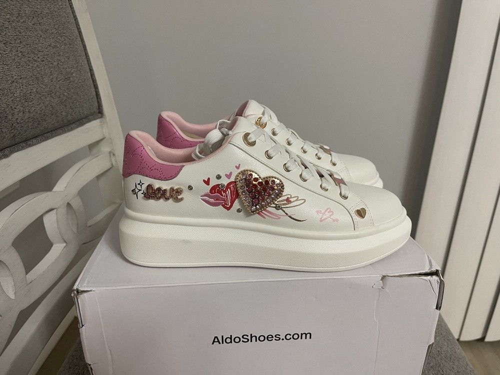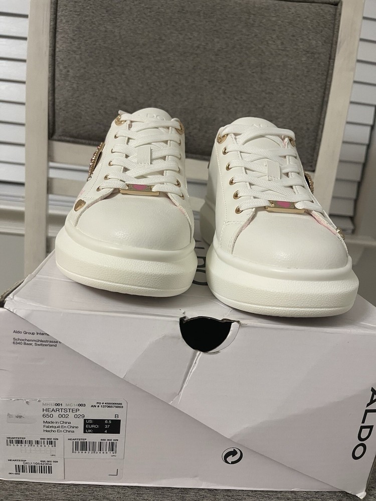 Step into a blend of comfort and style with the Also Heartstep Pink Women's Low Top Sneakers. These sneakers are a perfect addition to your casual footwear collection, featuring a vibrant pink hue that adds a pop of color to any outfit. The renowned Aldo brand ensures quality and a sleek design, while the athletic style provides both versatility and ease of movement. Crafted for the fashion-forward woman, these sneakers come in a US size 6.5 and a UK size 4, fitting seamlessly into your day-to-day activities. Whether you're running errands or meeting friends, the durable construction and supportive fit offer both practicality and a chic aesthetic. Elevate your sneaker game with these stylish, new-with-box kicks.