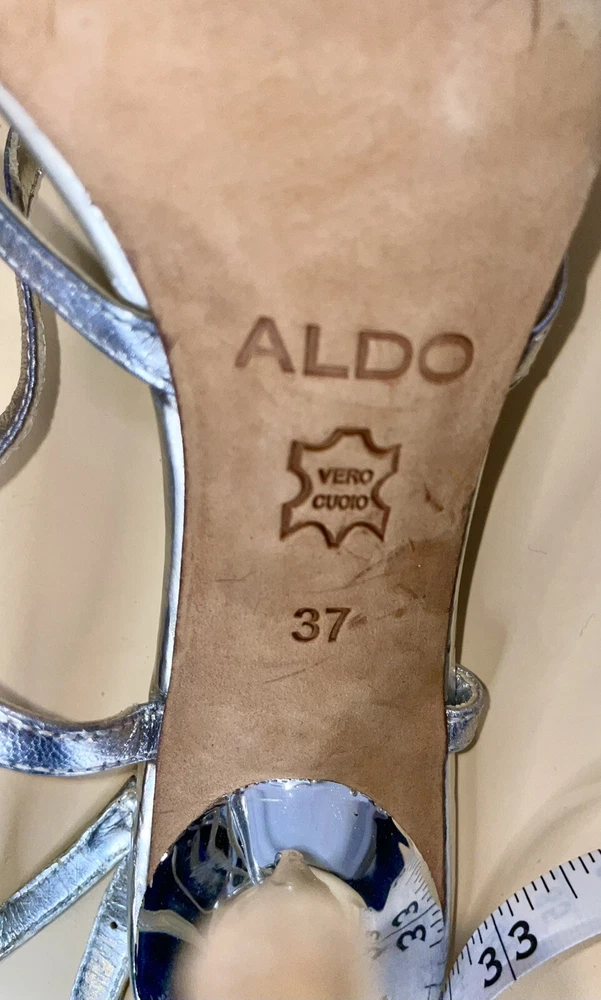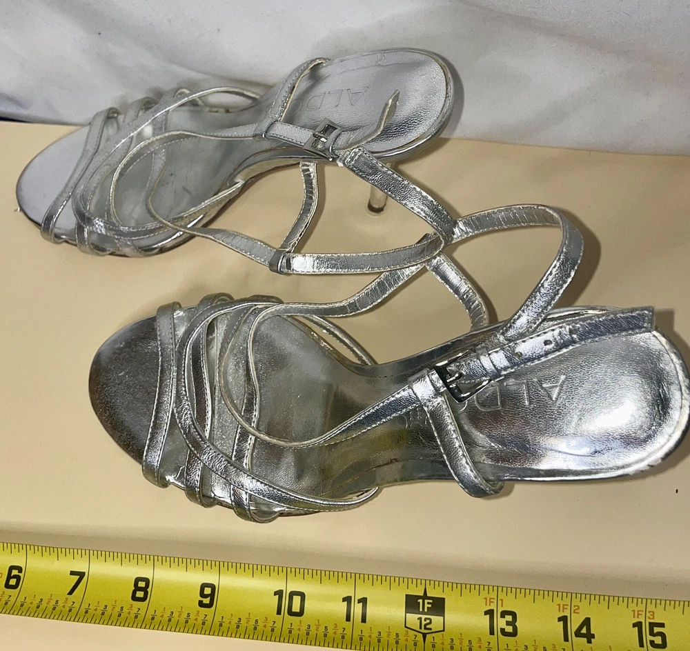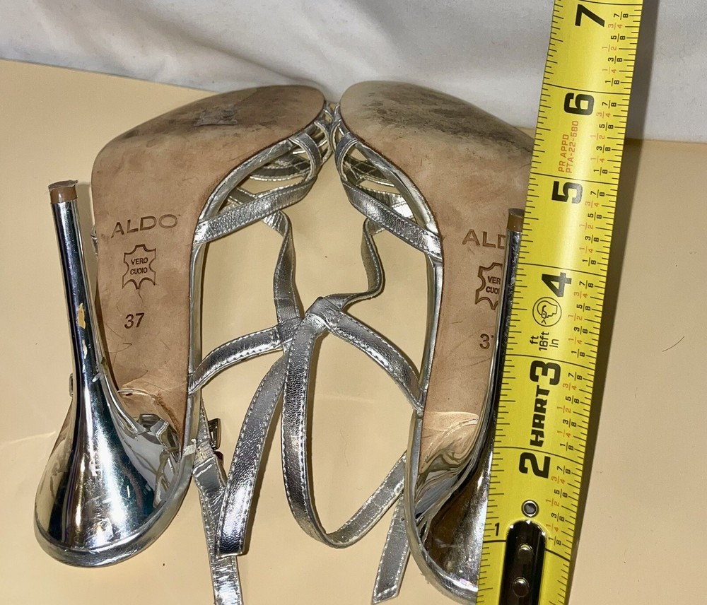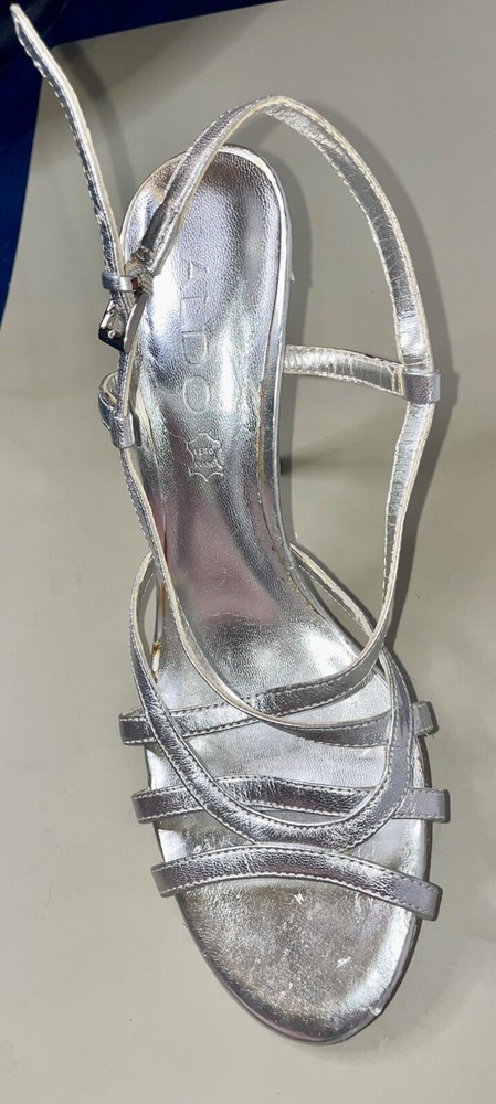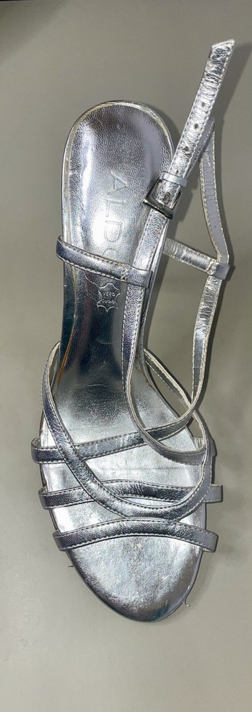 Outsole Material: Leather Model: Aldo Pattern: Solid UK Shoe Size: 4 Closure: Buckle Vintage: Yes Season: Spring, Summer Heel Height: Ultra High (4 in & Higher) Style: Strappy Theme: Metal Department: Women Customized: No US Shoe Size: 6.5 AU Shoe Size: 4 Type: Heel Toe Shape: Open Toe Brand: Aldo Color: Silver Country/Region of Manufacture: Italy Personalize: No Occasion: Wedding, Party/Cocktail, Formal Features: Adjustable Strap Heel Style: Stiletto Insole Material: Leather Upper Material: Leather EU Shoe Size: 37