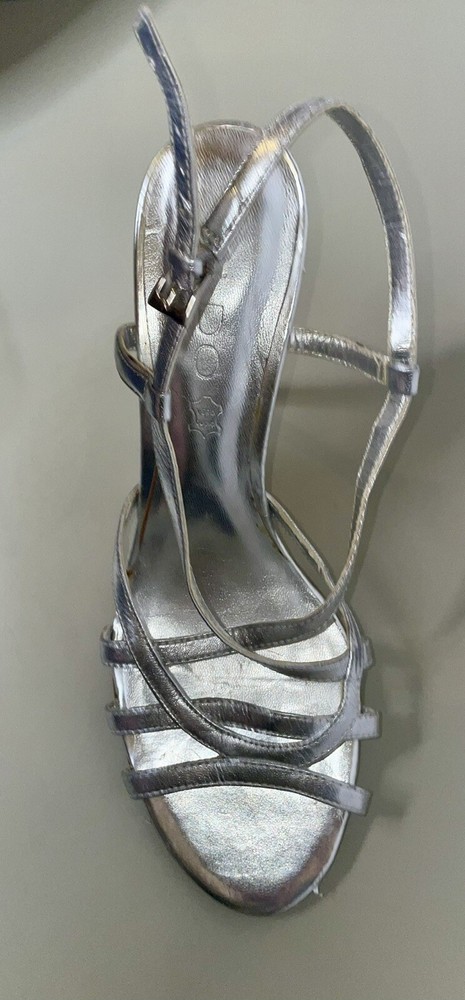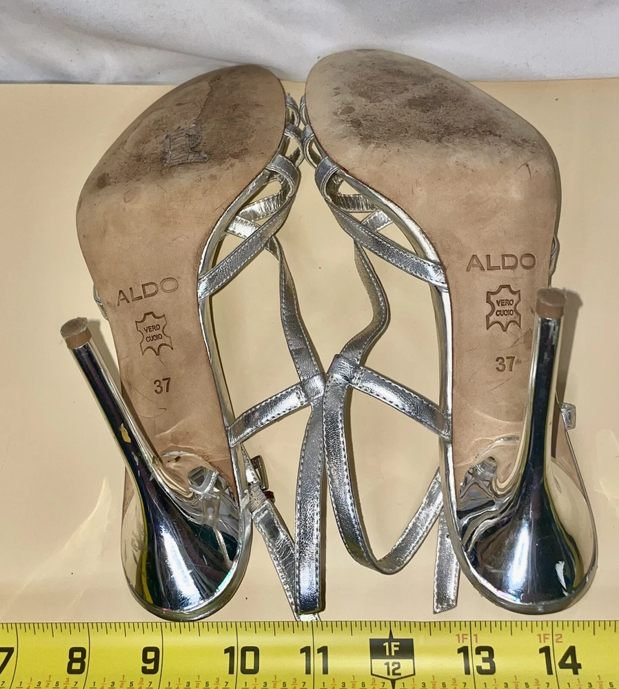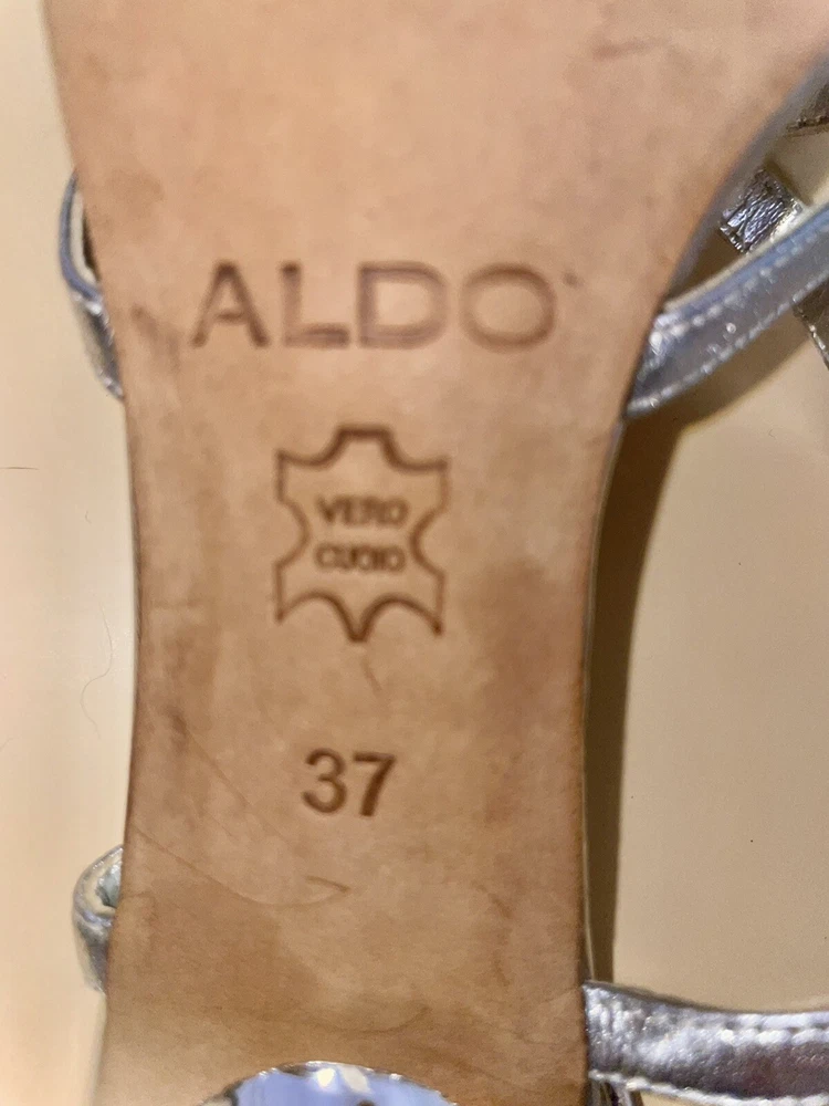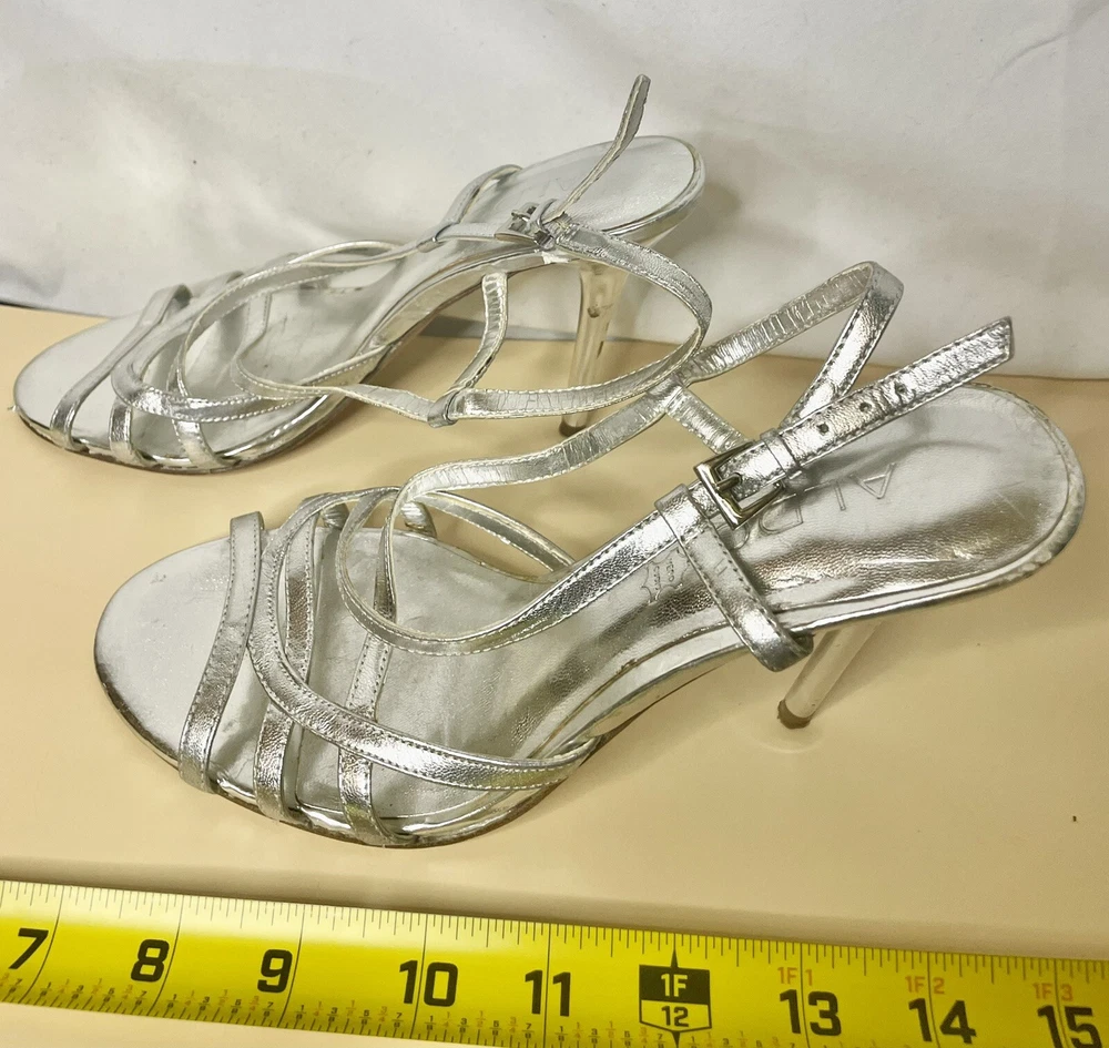 Outsole Material: Leather Model: Aldo Pattern: Solid UK Shoe Size: 4 Closure: Buckle Vintage: Yes Season: Spring, Summer Heel Height: Ultra High (4 in & Higher) Style: Strappy Theme: Metal Department: Women Customized: No US Shoe Size: 6.5 AU Shoe Size: 4 Type: Heel Toe Shape: Open Toe Brand: Aldo Color: Silver Country/Region of Manufacture: Italy Personalize: No Occasion: Wedding, Party/Cocktail, Formal Features: Adjustable Strap Heel Style: Stiletto Insole Material: Leather Upper Material: Leather EU Shoe Size: 37