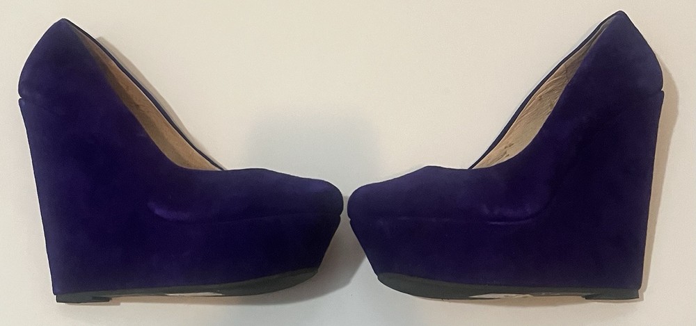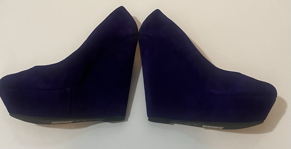 Elevate your style with these gorgeous purple wedge pumps from Aldo. The faux suede upper material and solid pattern make them perfect for any occasion, while the closed toe and pull-on closure ensure a comfortable fit. The ultra-high wedge heel adds an extra boost of confidence to your look, making them ideal for a night out or a special event. These pumps are a size 8 and are perfect for women who want to make a statement with their footwear. The elegant design and high-quality construction make them a great addition to any wardrobe. Whether you're dressing up or dressing down, these Aldo Also Wedge Purple Velvet Pumps are sure to turn heads. Excellent condition- but slightly worn in last two pictures Same day shipping or next business day Smoke free home