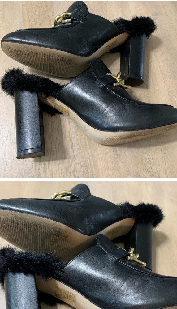 Aldo mules with leather uppers, faux fur on heal inner, attractive gold chain, very little wear. #C22