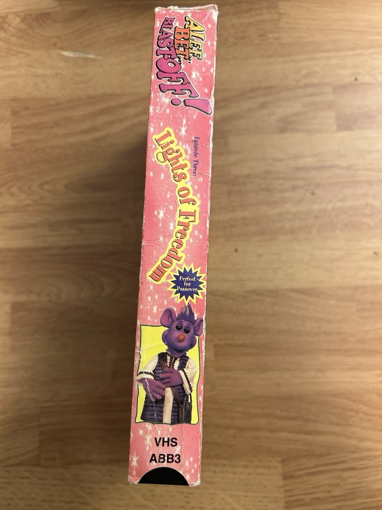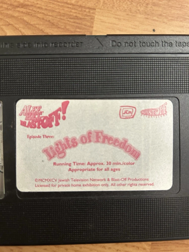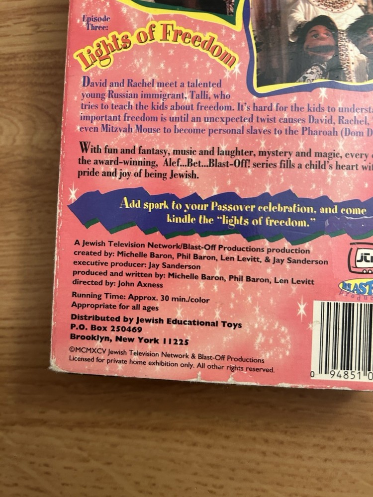 The product is a VHS tape of the "Lights Of Freedom" cartoon show featuring Jewish puppets, aimed at kids. The show is in English and follows the NTSC signal standard. Starring Elliott Gould and produced by Blast Off Productions, this family-friendly adventure offers a fun and educational experience for children. With a G rating, this full-screen edition from the United States is sure to entertain and inspire young viewers. Good condition. The dust sleeve has some wear.