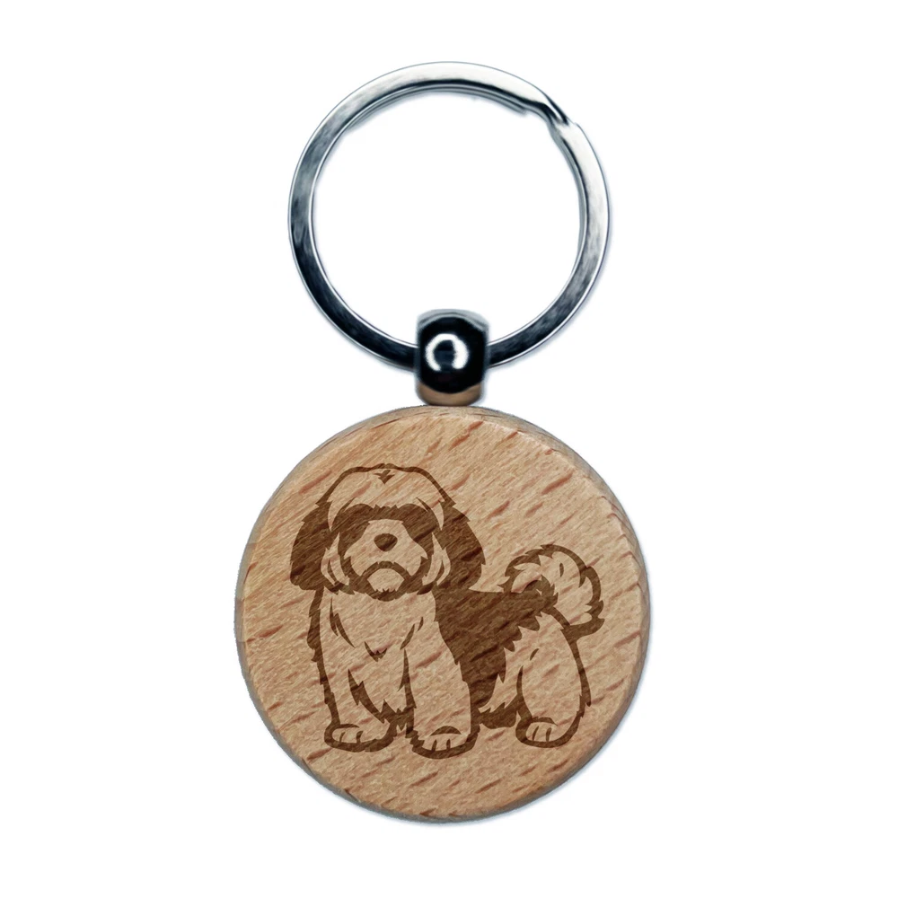 Alert Shaggy Shih Tzu Dog Engraved Wood Round Keychain Tag Charm
