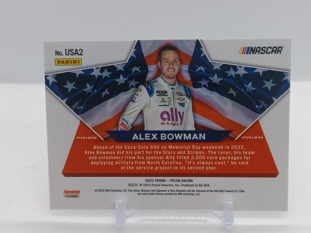 Up for sale is a stunning Alex Bowman 2022 Panini Prizm Racing USA Flag SSP #USA2 trading card. This card features beautiful holographic foil accents and is part of the highly sought-after 2022 Panini Prizm set. It is an original, not a reprint, and has been kept in pristine condition. This card is a must-have for any NASCAR or Alex Bowman fan and would make a great addition to any collection. It is a short print, with only a limited number available, and is a case hit for Hendrick Racing. Don't miss your chance to own this rare and unique card!