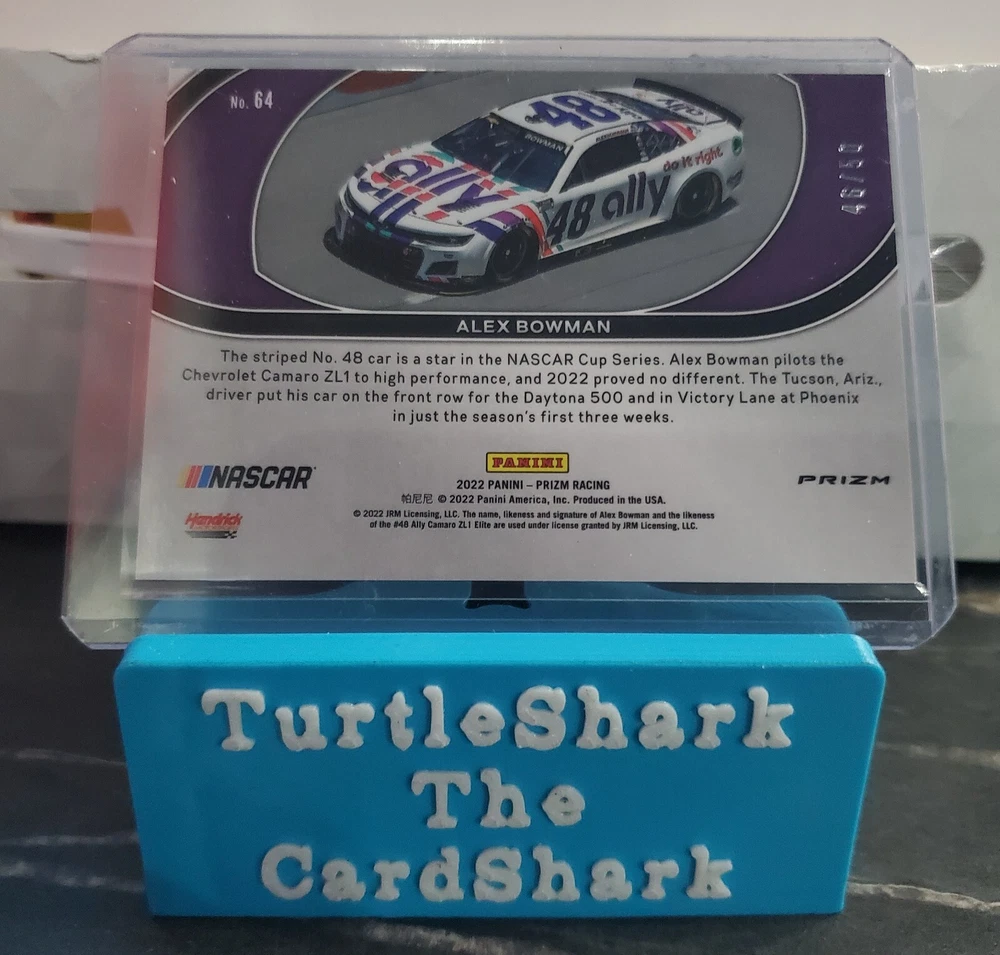 Parallel/Variety: Prizm Card Name: Alex Bowman Rides Checkered Flag /50 Country/Region of Manufacture: United States Card Thickness: 20 Pt. Language: English Card Number: 46 Original/Licensed Reprint: Original Print Run: 50 Season: 2022 Sport: Auto Racing Year Manufactured: 2022 Player/Athlete: Alex Bowman Material: Card Stock Type: Sports Trading Card League: NASCAR Card Size: Standard Set: 2022 Panini Prizm Racing Insert Set: Checkered Flag Manufacturer: Panini Autographed: No Features: Insert, Parallel/Variety, Serial Numbered Vintage: No
