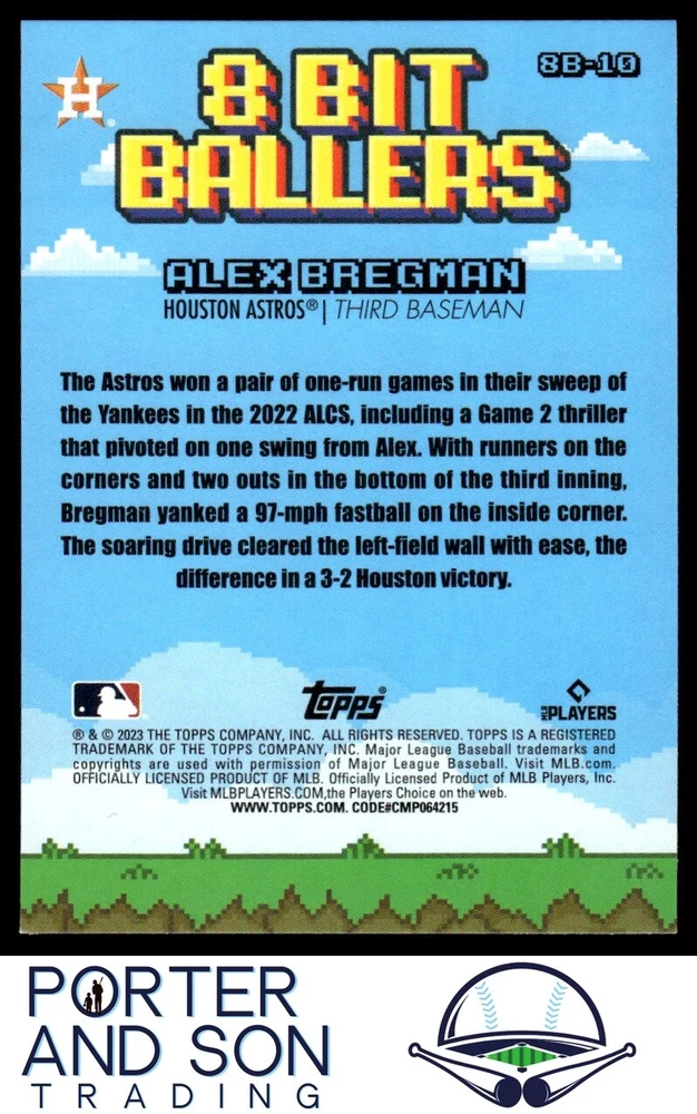 Autographed: No Card Number: 8B-10 League: MLB Team: Houston Astros Set: 2023 Topps Big League Type: Sports Trading Card Parallel/Variety: 8 Bit Ballers Year Manufactured: 2023 Player/Athlete: Alex Bregman Insert Set: 8 Bit Ballers Graded: No Manufacturer: Topps Season: 2023 Sport: BASEBALL