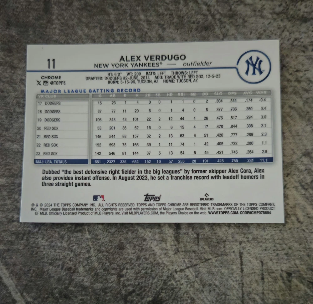 HomeAlex Verdugo 2024 Topps Chrome RayWave Refractor #11 NY Yankees