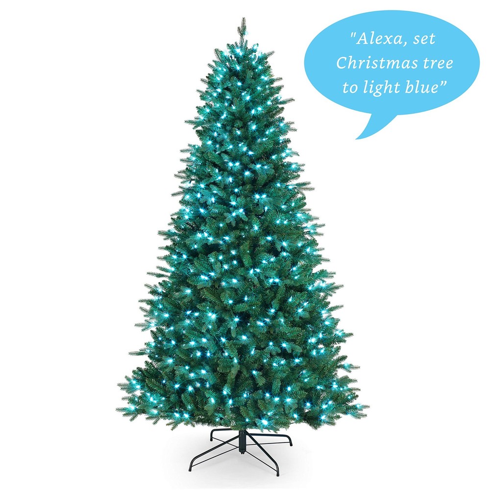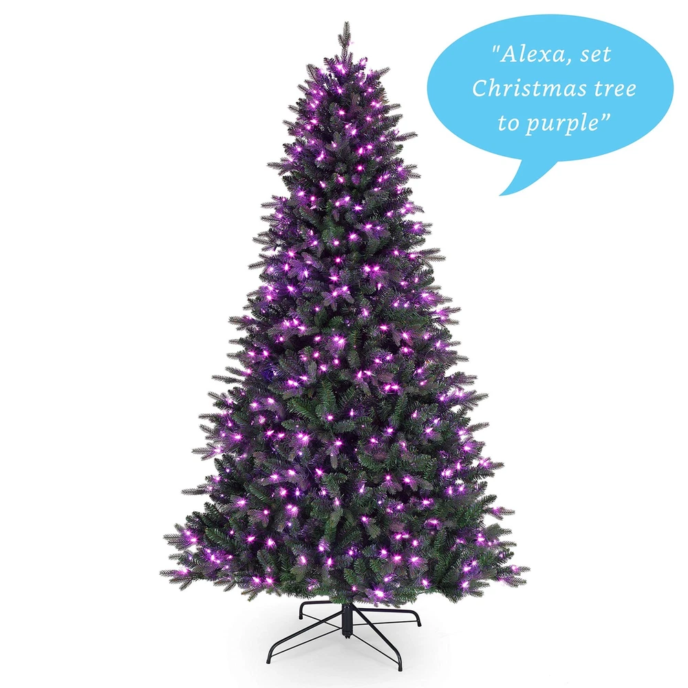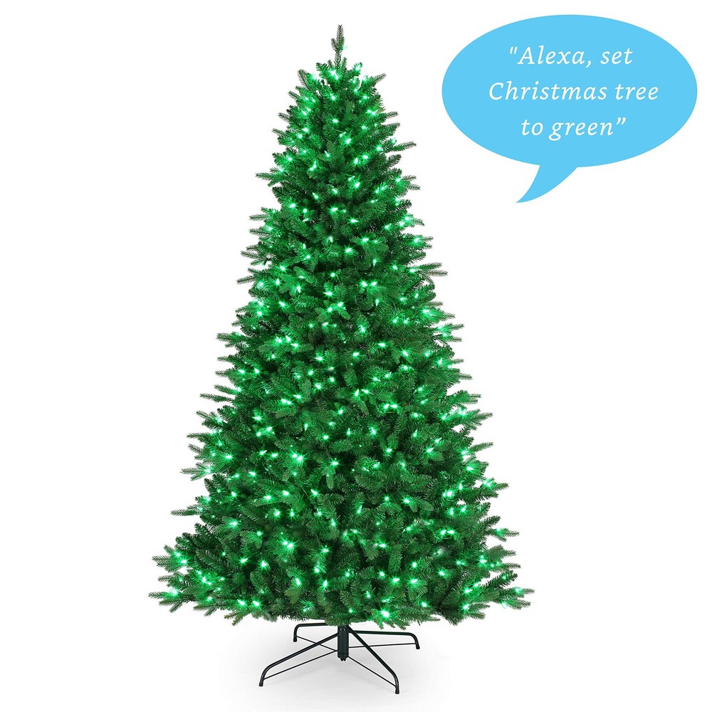The tree has 200 pre-lit multi-option LED lights that work with Alexa for home automation; turn the lights on/off, select the lighting function, color, or set a schedule; Certified for Humans this device is smart home made easy, and Alexa setup is simple The energy-saving, low voltage RGB LED lights are pre-strung, offer 40 lighting functions, and remain lit even if one goes out; everything you need to customize your tree to match your holiday décor and create a unique effortless display This 5.0' tall and 40" diameter base tree resembles lifelike foliage with hinged branches for easy setup and storage; the 575 flame retardant memory wire branch tips can easily be separated and bent for optimum appearance This tree features pre-attached, hinged branches for quick setup and easy storage, power pole technology, and memory wire in every branch; for best results properly shape the tree by separating and pulling the branch tips apart Built-in power pole and included sturdy metal tree stand make for an effortless setup by simply sliding the tree sections and the pre-wired pole-to-pole connection together, enabling automatic lighting and eliminating messy cords