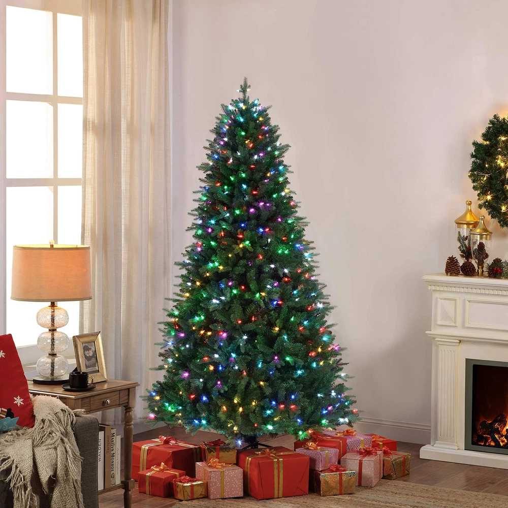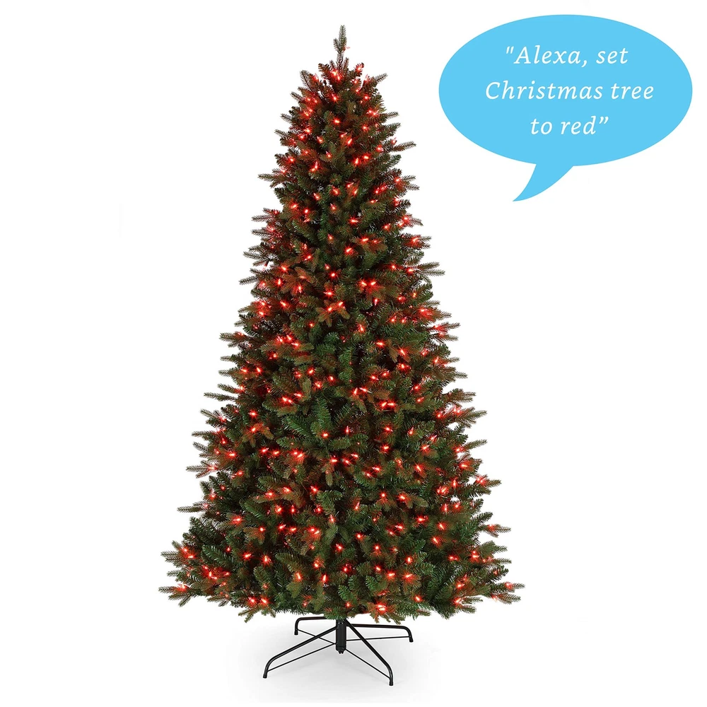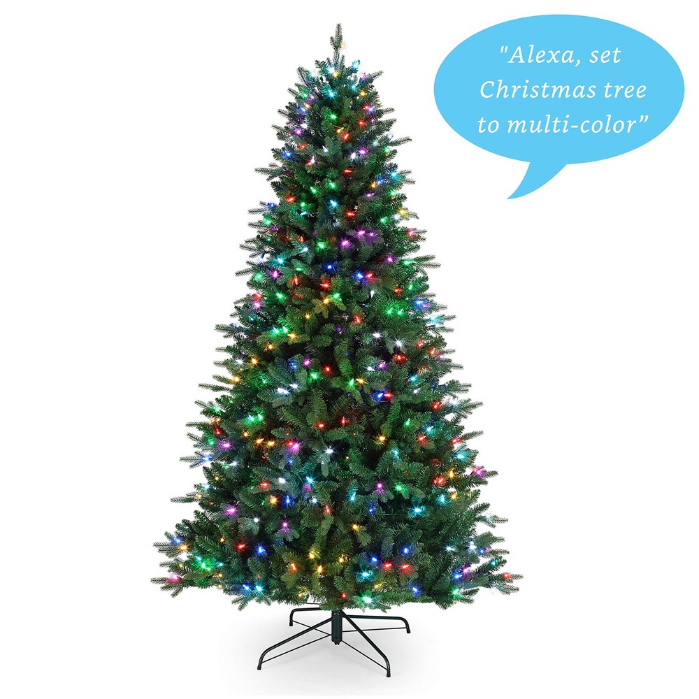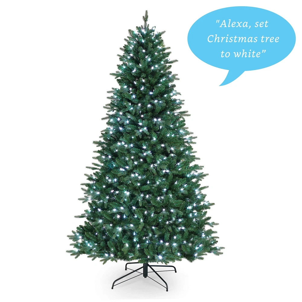 The tree has 200 pre-lit multi-option LED lights that work with Alexa for home automation; turn the lights on/off, select the lighting function, color, or set a schedule; Certified for Humans this device is smart home made easy, and Alexa setup is simple The energy-saving, low voltage RGB LED lights are pre-strung, offer 40 lighting functions, and remain lit even if one goes out; everything you need to customize your tree to match your holiday décor and create a unique effortless display This 5.0' tall and 40" diameter base tree resembles lifelike foliage with hinged branches for easy setup and storage; the 575 flame retardant memory wire branch tips can easily be separated and bent for optimum appearance This tree features pre-attached, hinged branches for quick setup and easy storage, power pole technology, and memory wire in every branch; for best results properly shape the tree by separating and pulling the branch tips apart Built-in power pole and included sturdy metal tree stand make for an effortless setup by simply sliding the tree sections and the pre-wired pole-to-pole connection together, enabling automatic lighting and eliminating messy cords