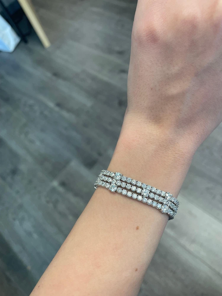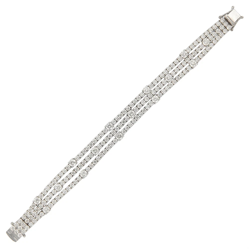 Exquisite and timeless three row diamonds tennis bracelet. By Alexander Beverly Hills. 174 diamonds total, 17.40 carats total. 15 larger round brilliant diamonds 4.68ct, approximately H/I color and SI clarity. 159 round brilliant diamonds 12.72ct, approximately H/I color and SI clarity. Prong set in 18k white gold, 7in. Accommodated with an up-to-date digital appraisal by a GIA G.G. once purchased, upon request. Please contact us with any questions. Item Number B3663