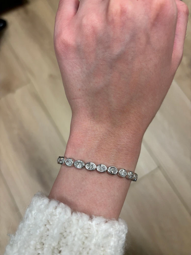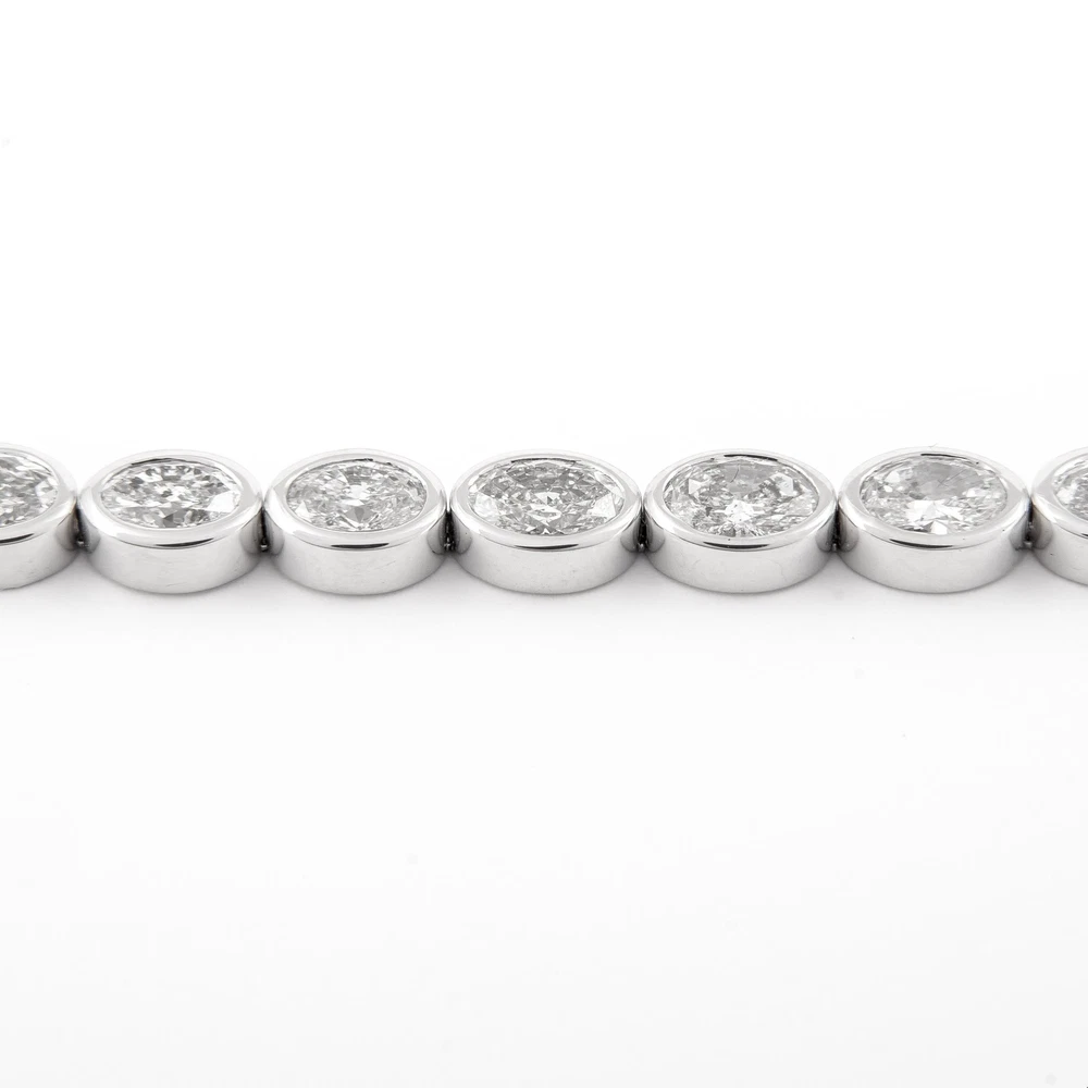 Stunning modern bezel set east-west oval cut diamond tennis bracelet. High jewelry by Alexander Beverly Hills. 27 oval cut diamonds, 8.46 carats. Approximately F/G color and SI clarity. 18k white gold, 14.87 grams, 7.25 inches. Accommodated with an up-to-date digital appraisal by a GIA G.G. once purchased, upon request. Please contact us with any questions. Item Number BS1783