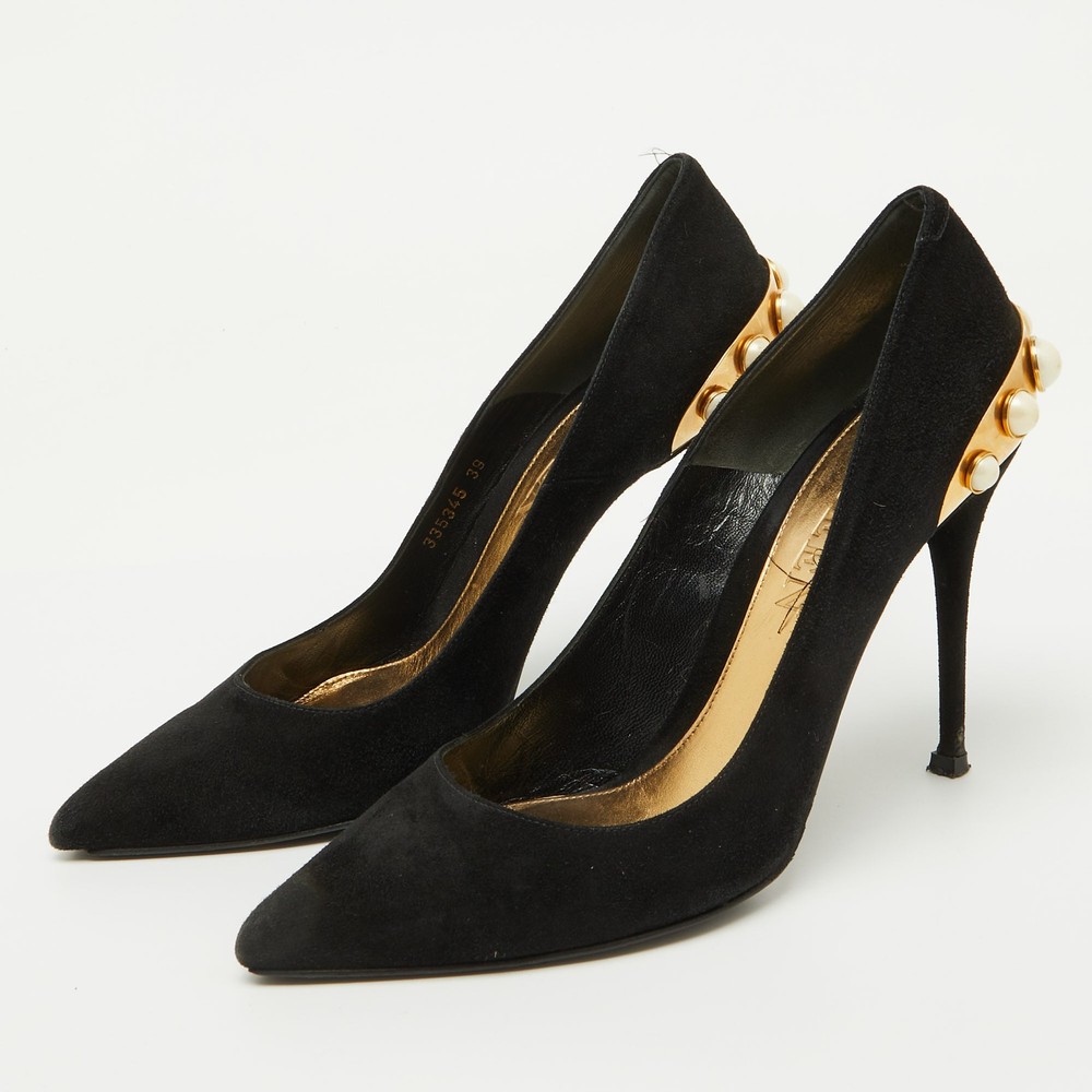 Make a chic style statement with these designer pumps. They showcase sturdy heels and durable soles, perfect for your fashionable outingsCertified by The Luxury Closet - This item has gone through a detailed authentication process overseen by our experts. We offer a lifetime guarantee of authenticity on all our items. Import duties, taxes and charges are not included in the item price. These charges are the buyers responsibility. Please check with your country’s customs office to determine what these additional cost will be prior to buying. Our eBay Store About Us Contact Us Add to Favorite Sellers Alexander McQueen Black Suede Gold Trimmed Faux Pearl Pumps Size 39 $203.5 Make a chic style statement with these designer pumps. They showcase sturdy heels and durable soles, perfect for your fashionable outings Product Details Brand Color Black Dimensions Material Suede Size 39 Outsole Width 8.5 cm Outsole Length 25 cm Heel Height 10.5 cm Includes The Luxury Closet Packaging Certified by The Luxury Closet This item has gone through a detailed authentication process overseen by our experts. We offer a lifetime guarantee of authenticity on all our items. How We Check The in-house team of experts at The Luxury Closet is highly trained to verify the authenticity and the condition of the luxury products. They ensure that only 100% authentic items are put on sale.The evaluation process is unique with its own mix of assessment criteria and differs according to the category. Each item is evaluated based on the following combination of hallmarks, hardware, stitching, symmetry, material, craftsmanship, stamping, codes, hologram stickers, and packaging. Our authenticators also check if the items have been modified or amended (e.g., aftermarket diamonds, replaced batteries, repaired bags, etc.) International Buyers Import duties, taxes and charges are not included in the item price. These charges are the buyers responsibility. Please check with your country’s customs office to determine what these additional cost will be prior to buying.