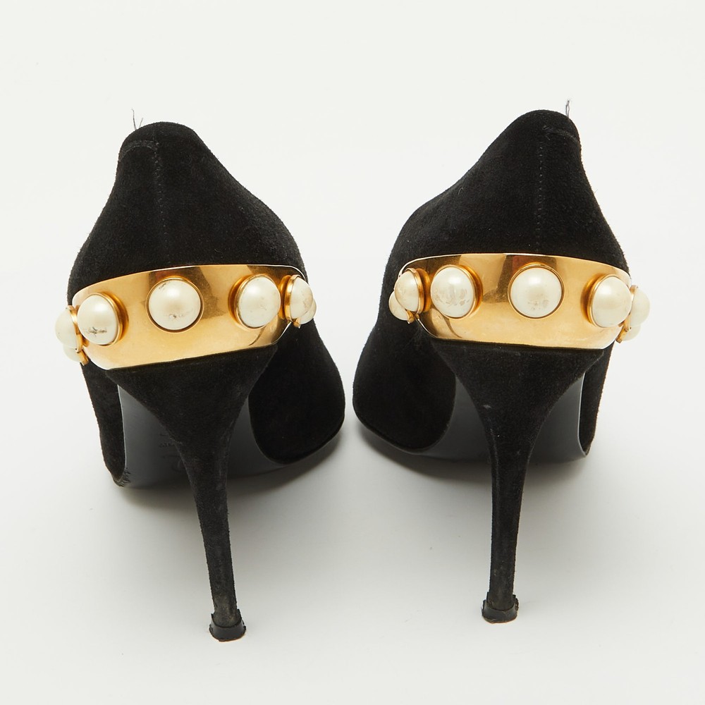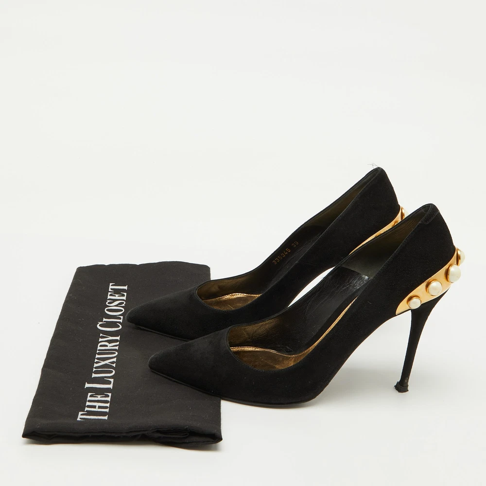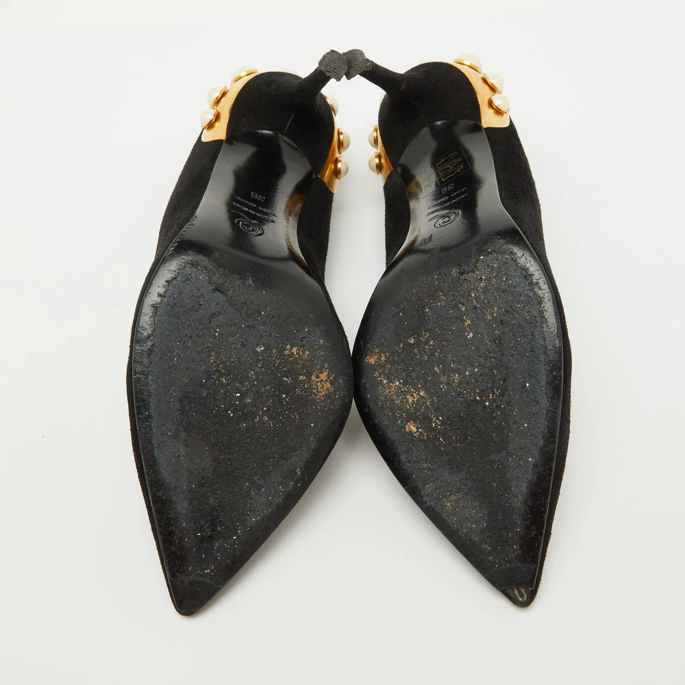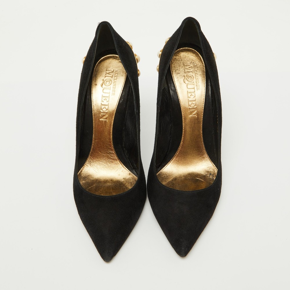 Alexander McQueen Black Suede Pumps with Gold Trim and Faux Pearls Size 39