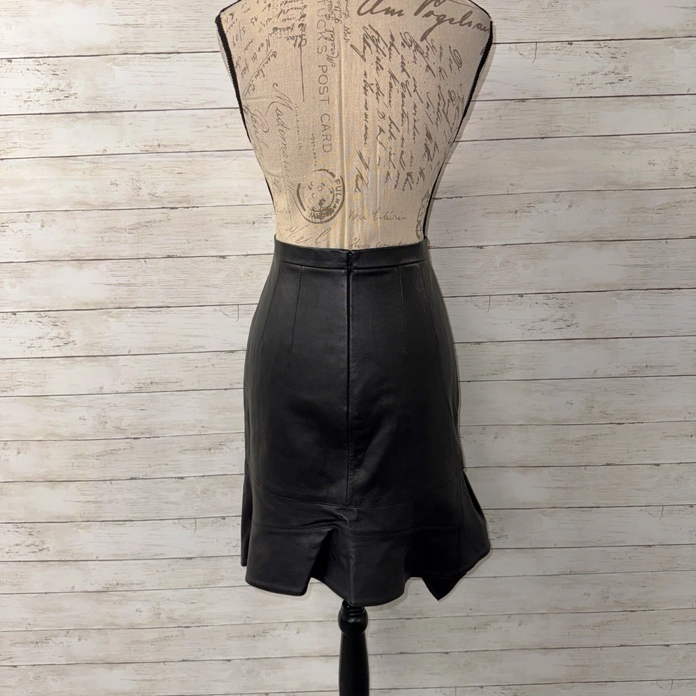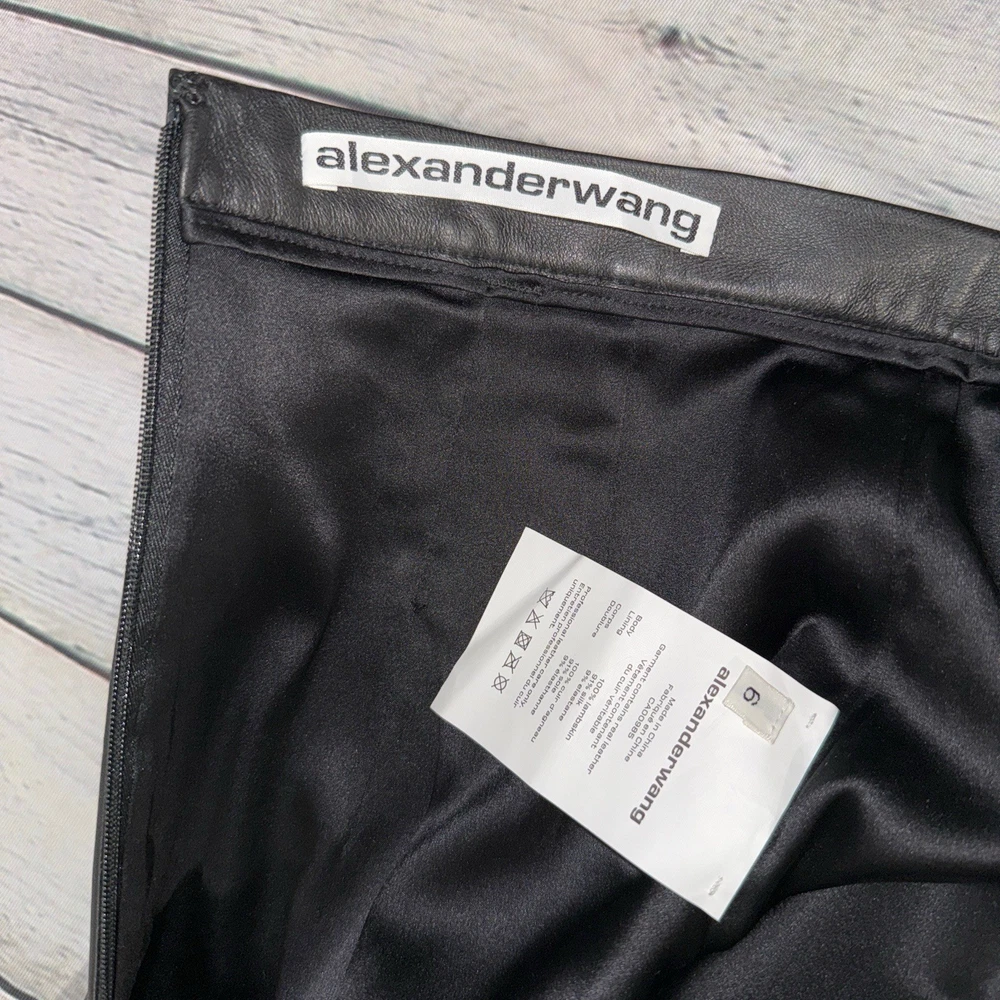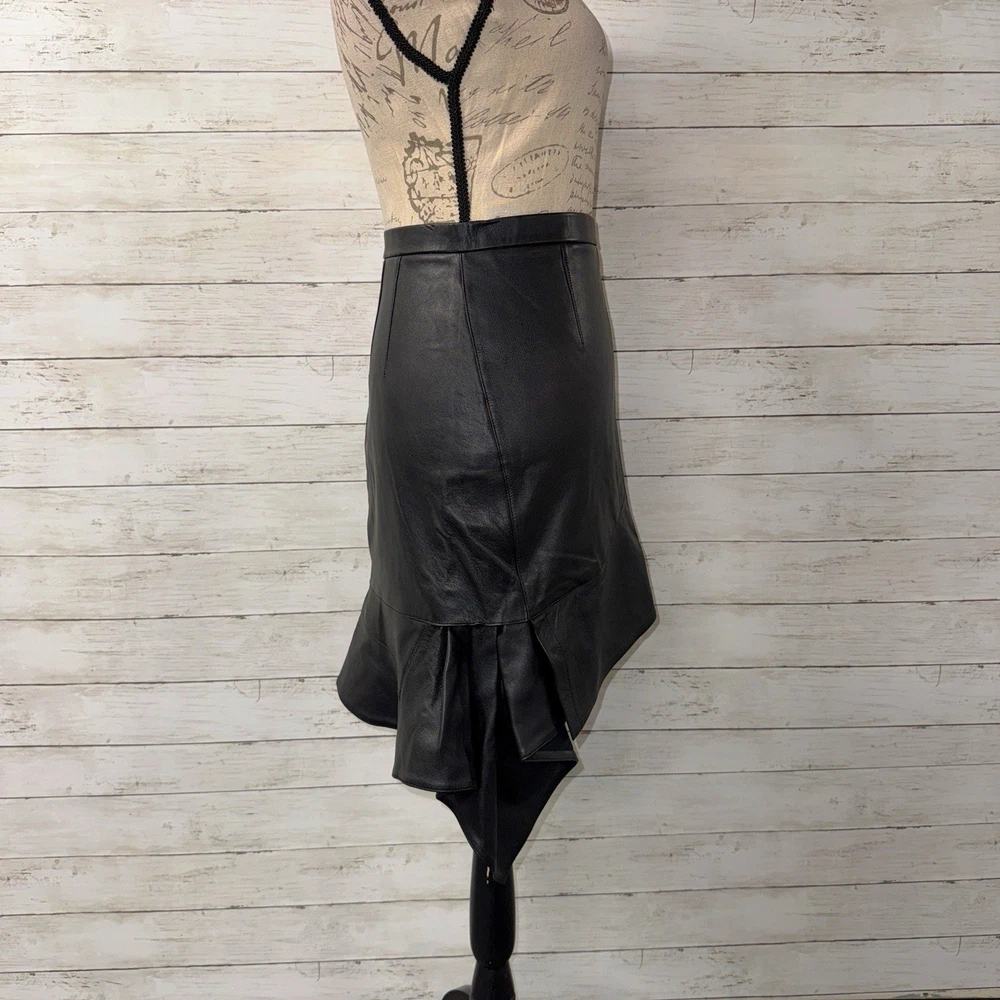 NWOT! Alexander Wang size 6 Deconstructed skirt with ruffle in black. Genuine leather. High waisted with hidden back zip close. Classic pencil skirt with pleats & ruffles from hips down. Asymmetrical hem. Waist: 14.25“, Hips: 19“, Length: 16-24” Shell: 100% Genuine Leather Lining: 91% Silk, 9% Elastane Never worn! Retail: $895.00