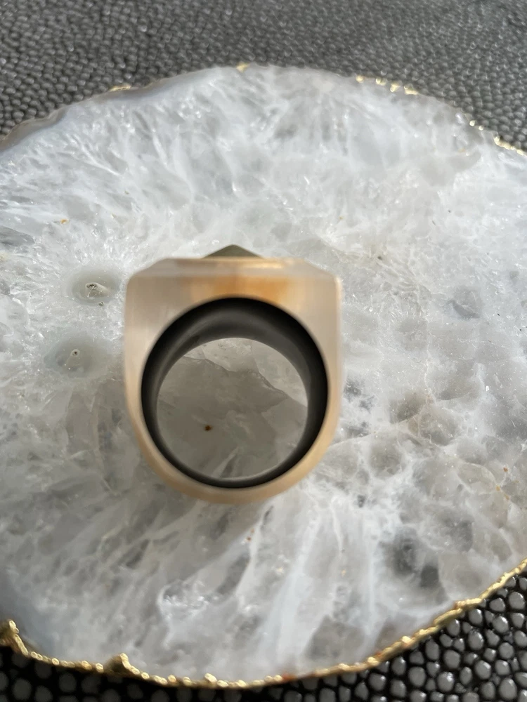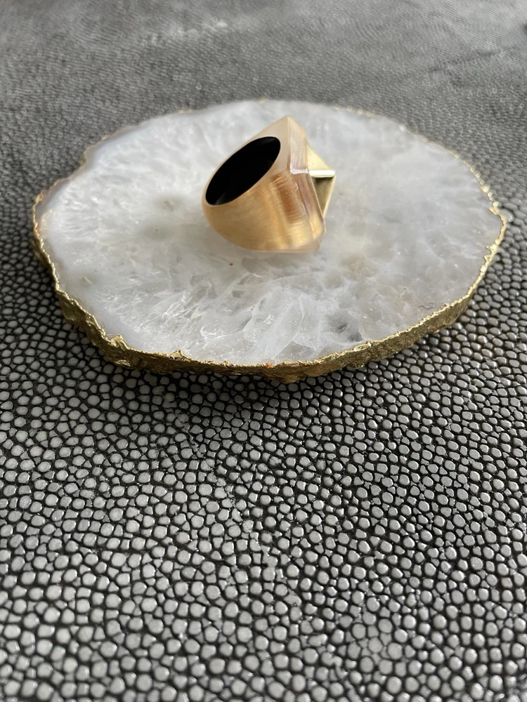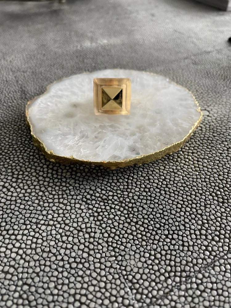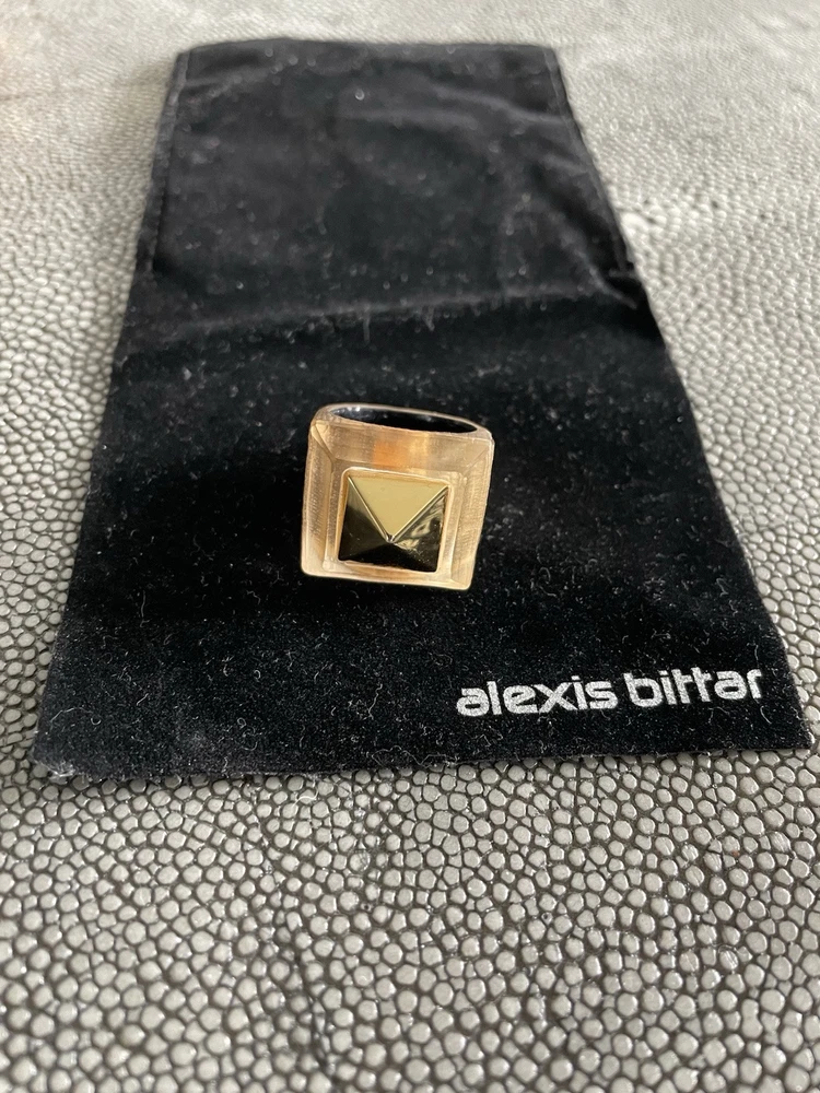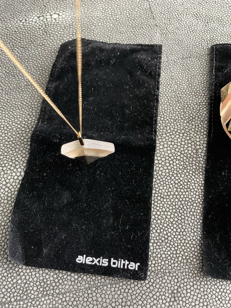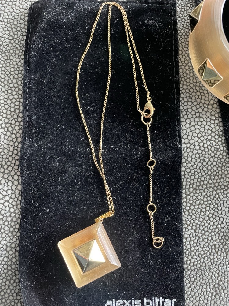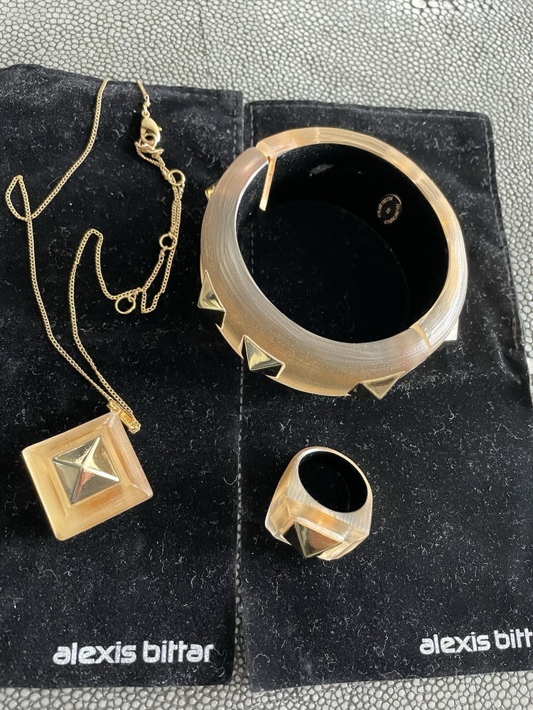 Hand sculpted, polished and signed by one of the greatest 21st century luxury designers, Alexis Bittar. His designs are classic and modern and exude class. I’m offering 3 pieces set that includes a necklace with gold adjustable length chain drop 8-12”, a beautiful wide cuff bracelet with hinge for easy on and off and the matching ring approximately size 7-8. All consists of hand sculpted Lucite with gold embellishments and chain. A raised pyramid prong is centered in the ring and necklace and surrounding the bracelet. Purchased at Saks Fifth Avenue in early 2000’s. Quality fine jewelry! Very classy attention getting pieces! It’s priced as a set and that would be my preference but will consider selling individually. Please inquire for individual pricing.