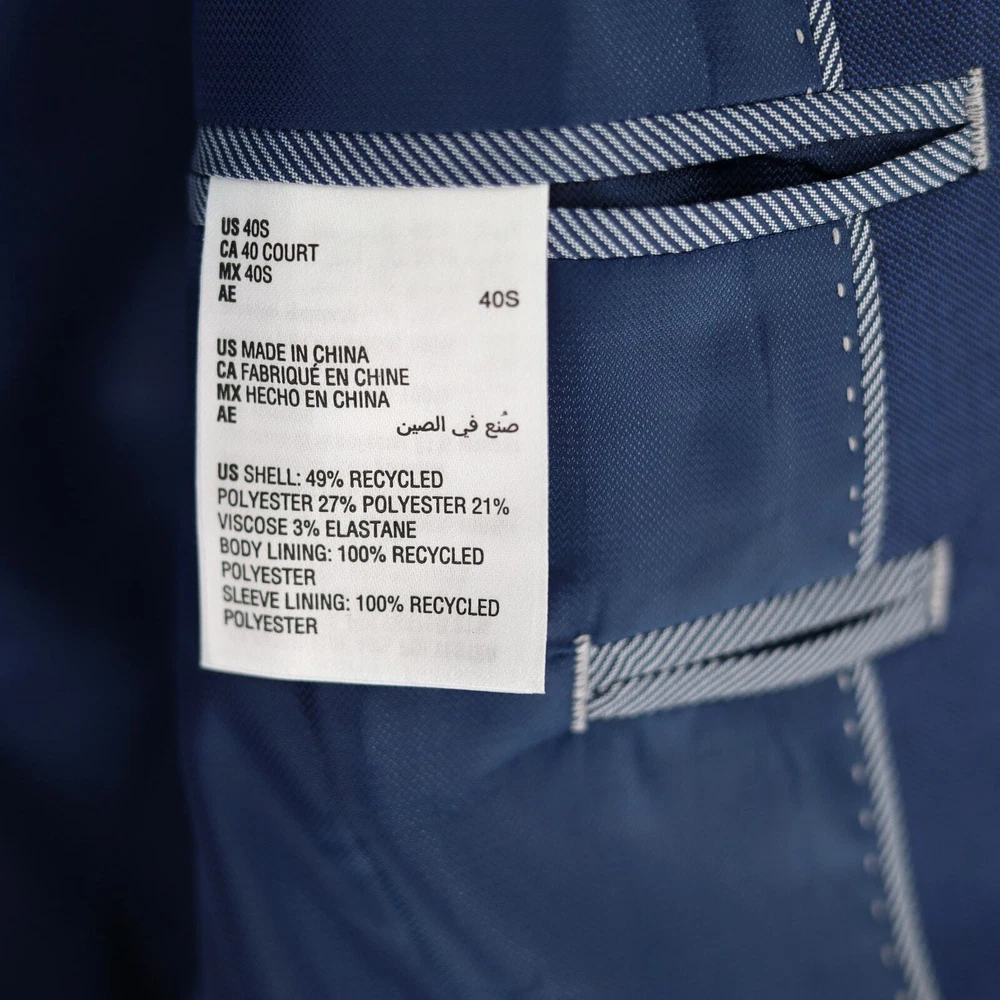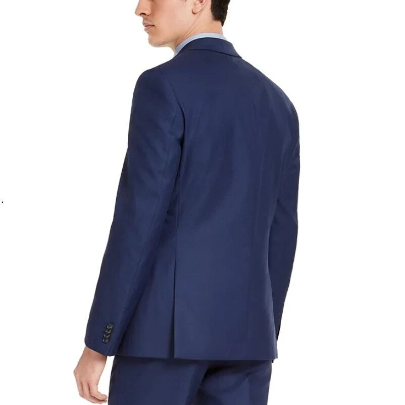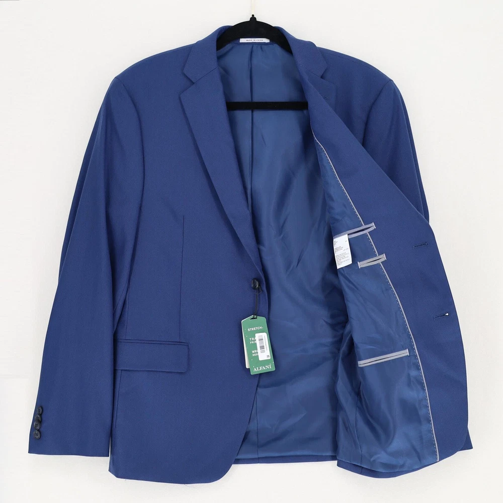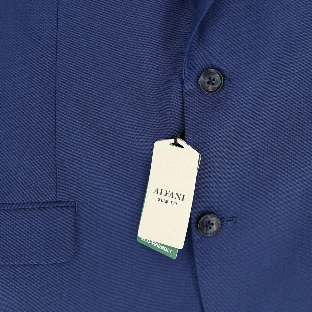 Alfani Men's Blue Solid Classic Slim-Fit Wrinkle Resistant Suit Jacket Size 40S New with tags MRSP $360 Luxe blue suit jacket Slim fit through the shoulders, chest and waist with higher armholes and sleeves Notched lapel Two-button closure Four-button cuffs Two front flap pockets Left chest welt pocket Side vents Fully lined Stretch performance Shell: 49% recycled polyester / 27% polyester / 31% viscose / 3% elastane Lining: 100% polyester Dry clean Length 28" Armpit to armpit 20.5" Shoulders 17.5" Sleeve 25"