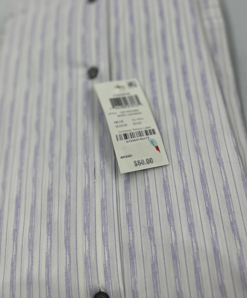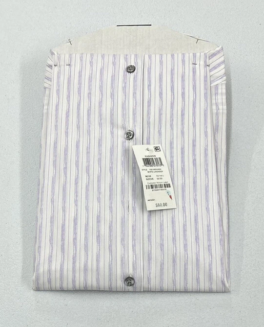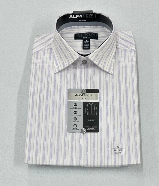 Alfani Men's Slim Fit 2-Way Stretch Stain Resistant Dress Shirt Color: White Lavender Size: Small (14-14.5, 32-33) Features: Slim fit Spread collar Button closure Long sleeves Stain-resistant stretch fabric Space-dye pattern Cotton/nylon/spandex