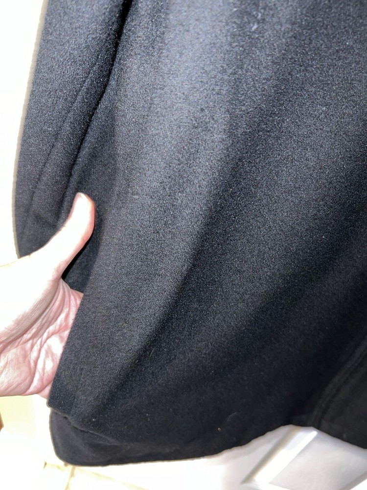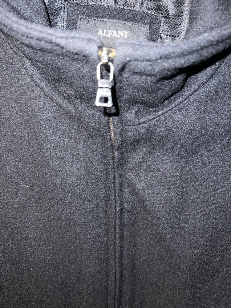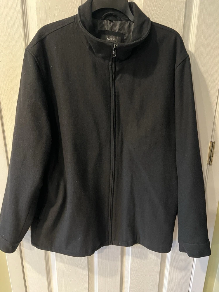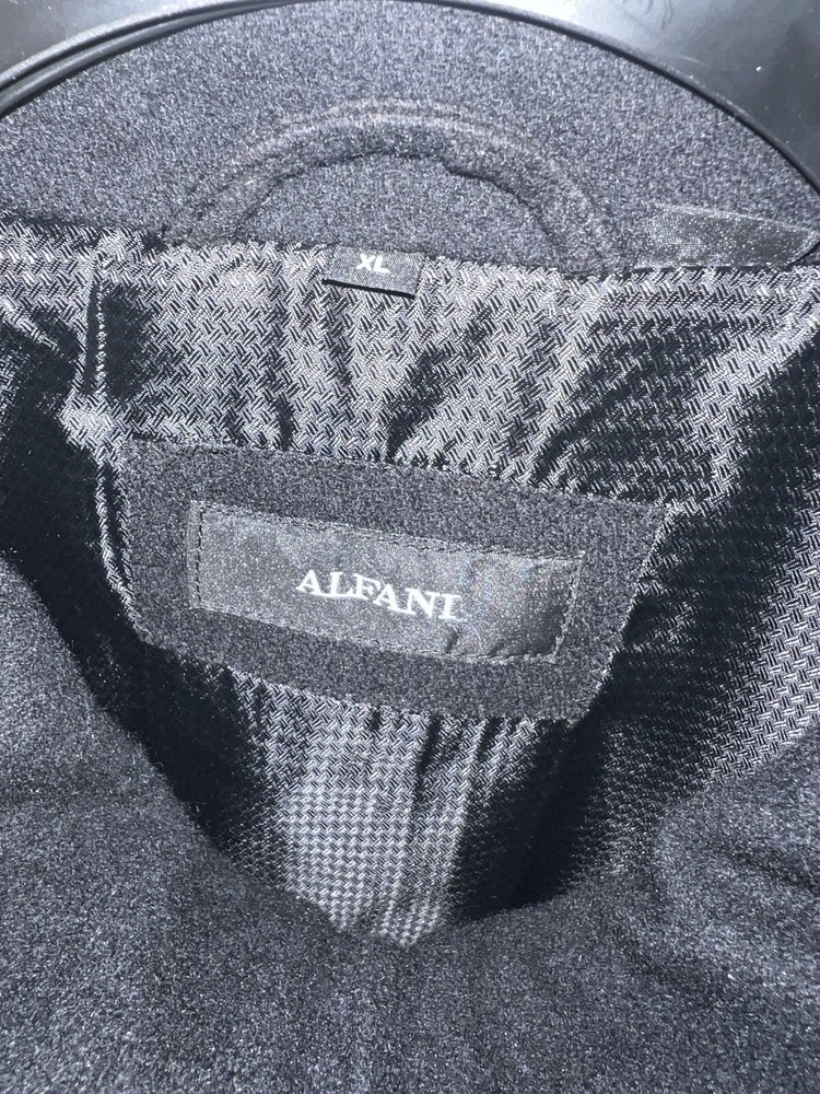 This Alfani men's overcoat is a must-have for winter. The full zip closure and outer shell wool material will keep you warm and stylish. The black color and XL size make it versatile and easy to wear. The coat also features a polyester lining material and a brand label of Alfani. Perfect for those who need a reliable and fashionable winter coat. Like new Pit to pit 26” Shoulder to hem 31” Shoulder to cuff 26”