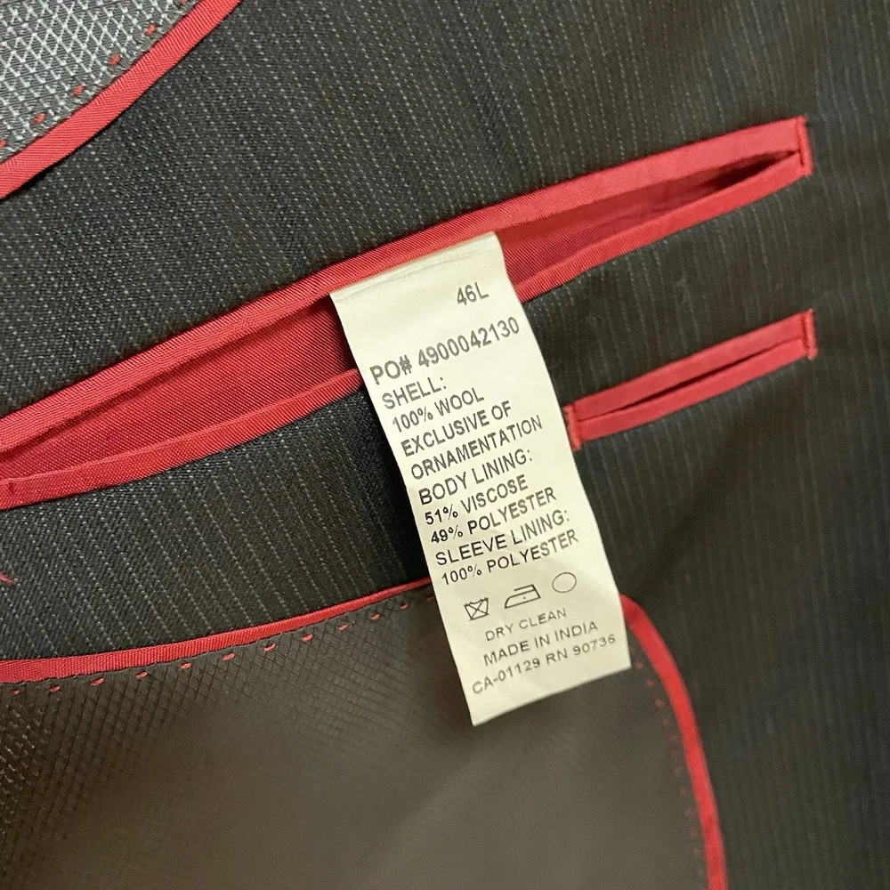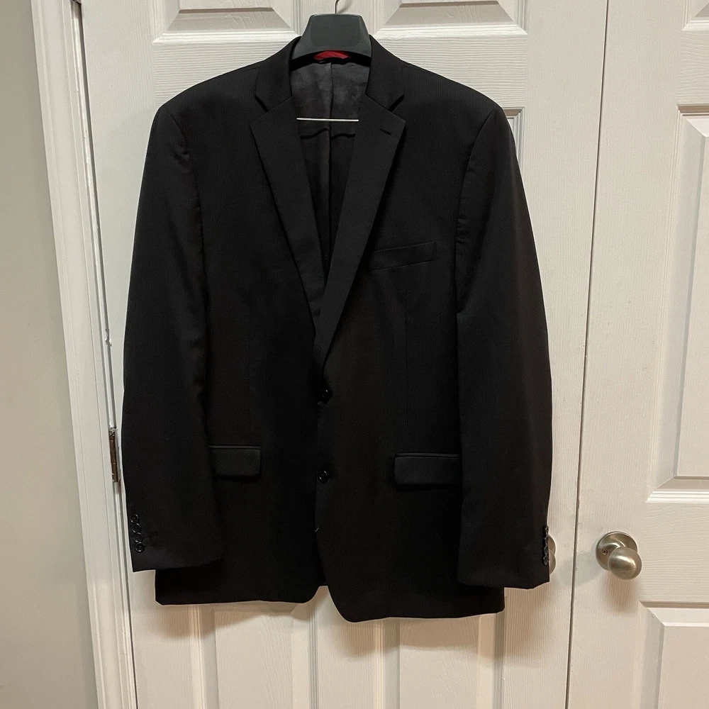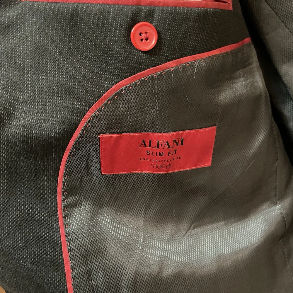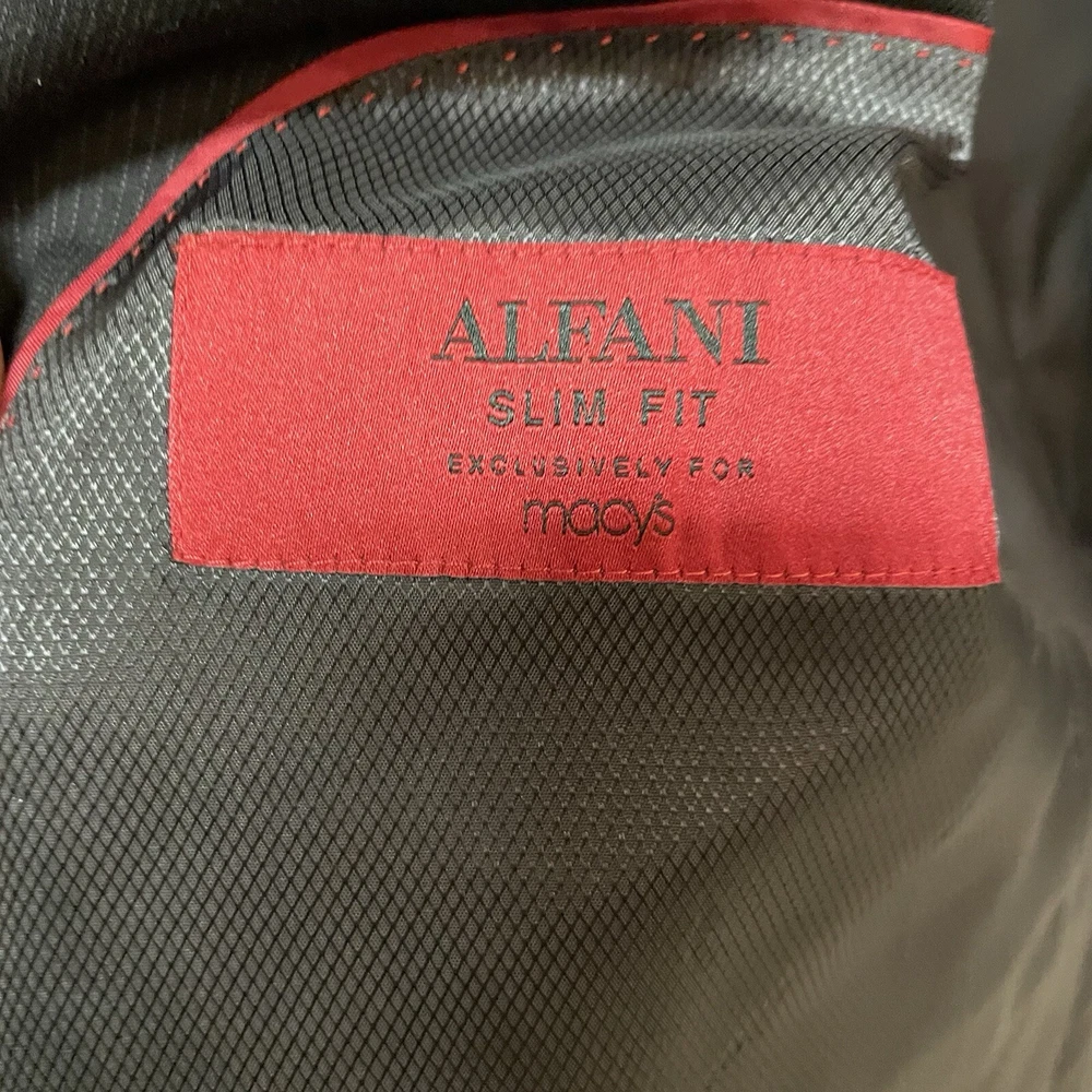 This is an Alfani men's sport coat in size 46L with a slim fit and a black pinstripe design. Made from 100% wool, this two-button blazer features a peak lapel style and a double-vented jacket vent style. Ideal for various occasions like travel, weddings, parties, and more, this sport coat also includes inner pockets and is lined with viscose/rayon. The jacket is suitable for all seasons and adds a touch of classic style with a modern slim fit.