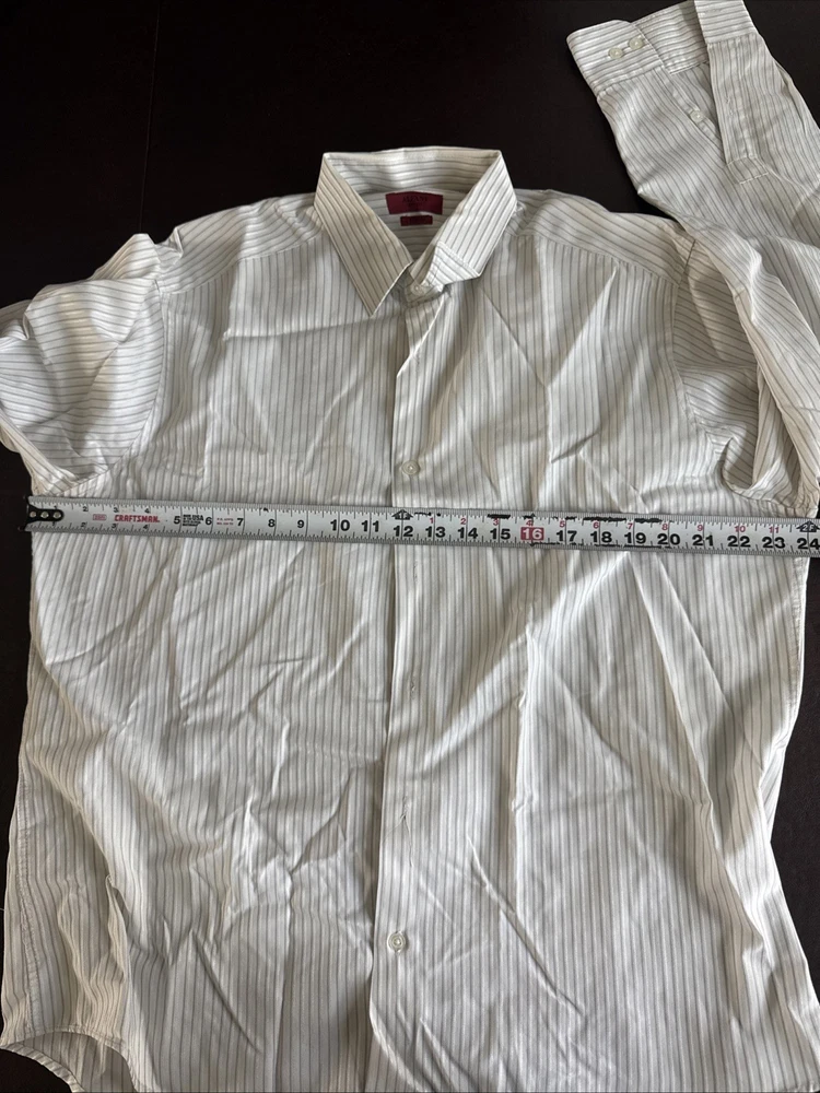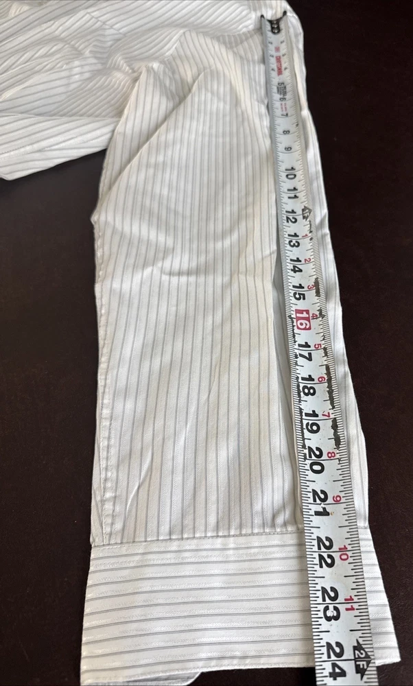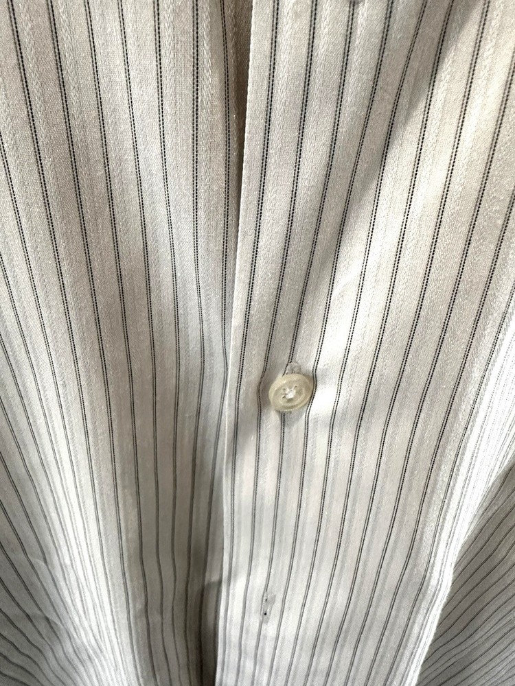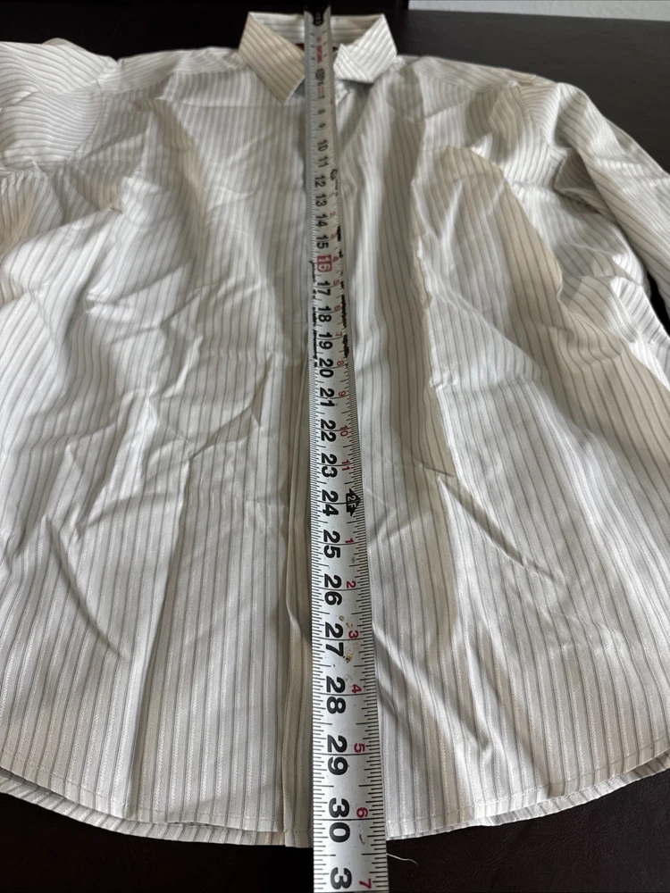 This shirt is so sharp it could cut through boring meetings. With its fitted cut and stretch fabric, it says "business" but feels like "couch." • Button-down front closure • Stretch fabric for comfort • Fitted design for a modern look • Long sleeves with buttoned cuffs • White with gray stripes for subtle flair No visible flaws noted. Top to bottom = 30 inches