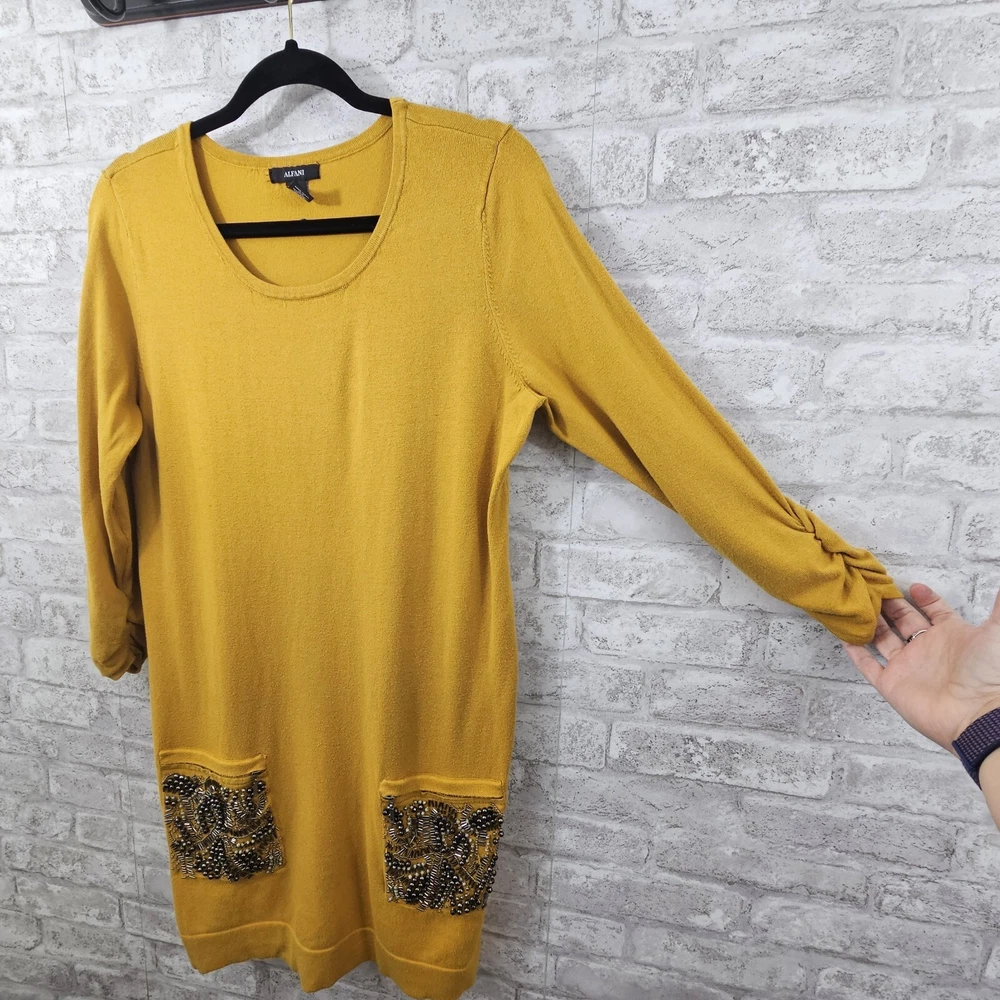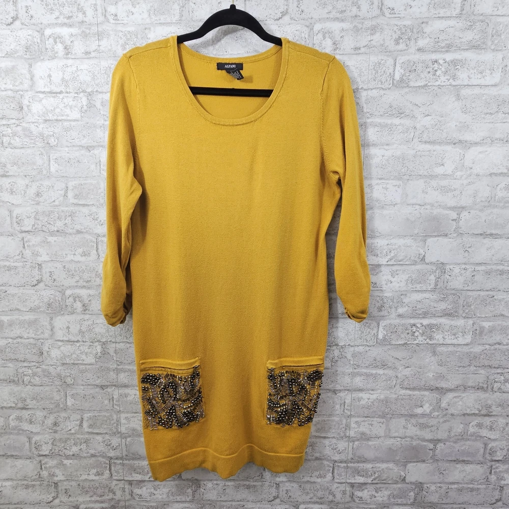 Alfani Womens Sweater Dress Sequen Size Medium Excellent pre-owned condition. No rips, tears or stains. See photos for best representation. Measures: Length 34" Width 19" Sleeve 20"