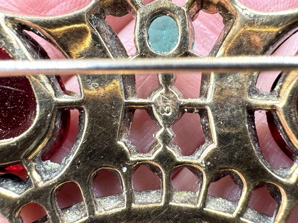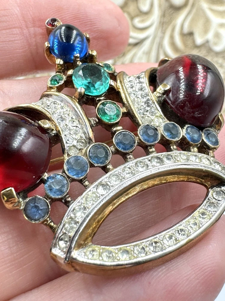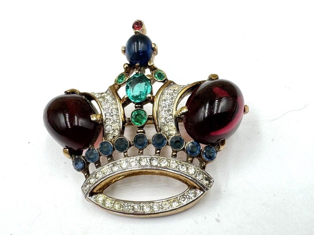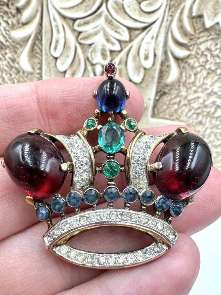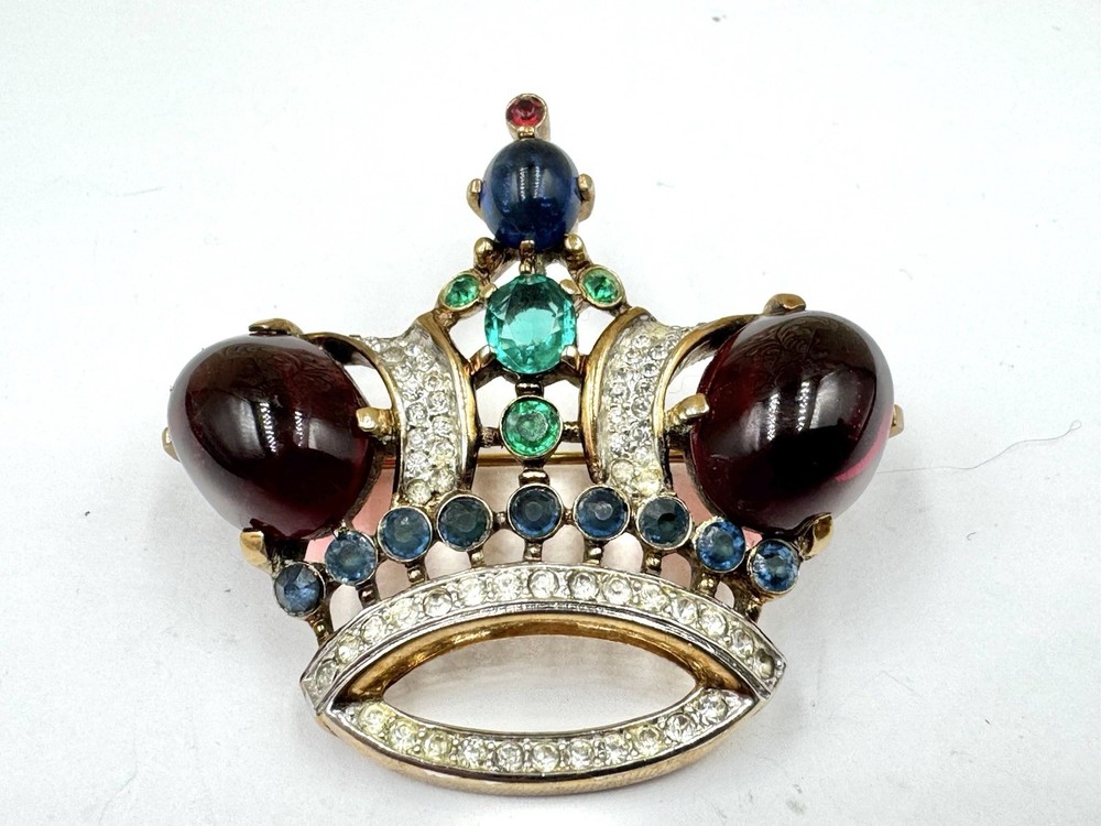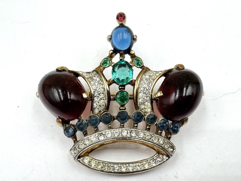 The Alfred Philippe Trifari Crown Jelly Belly Coronation Crown Brooch is a vintage piece of fashion jewelry signed by the renowned brand Trifari. This multicolor brooch features a beautifully designed crown shape with rhinestones and Lucite materials, exuding a sense of beauty, royalty, art, and fashion. Made with golden metal, this original piece is perfect for any occasion and is a true statement accessory for those who appreciate unique and elegant jewelry pieces. In good condition. This is from an estate sale, looks to be in good condition. I do not know the history of brooch, except it was from a Philippe collector. We do combine shipping.
